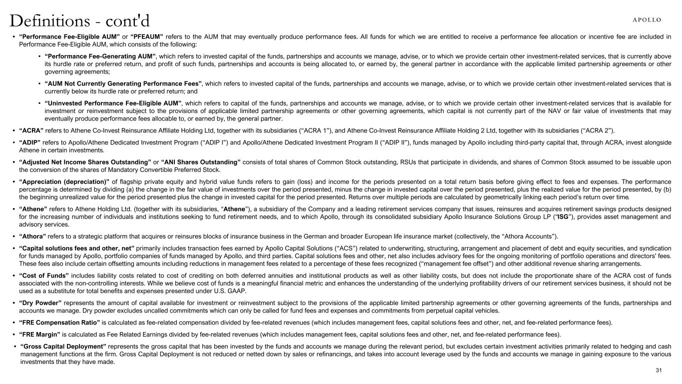 • “Adjusted Net Income, Excluding Notable Items” represents ANI with an adjustment related to our Retirement Services segment to exclude notable items. Notable items include unusual variability such as actuarial experience, assumption updates and other insurance adjustments. We use this measure to assess the long-term performance of the business against projected earnings, by excluding items that are expected to be infrequent or not indicative of the ongoing operations of the business. We view this non-GAAP measure as an additional measure that provides insight to management and investors on the historical, period-to-period comparability of the Company’s key non- GAAP operating measures. • “Assets Under Management”, or “AUM”, refers to the assets of the funds, partnerships and accounts to which Apollo provides investment management, advisory, or certain other investment-related services, including, without limitation, capital that such funds, partnerships and accounts have the right to call from investors pursuant to capital commitments. AUM equals the sum of: 1. the net asset value (“NAV”), plus used or available leverage and/or capital commitments, or gross assets plus capital commitments, of the credit and certain equity funds, partnerships and accounts for which we provide investment management or advisory services, other than certain collateralized loan obligations (“CLOs”), collateralized debt obligations (“CDOs”), and certain perpetual capital vehicles, which have a fee-generating basis other than the mark-to-market value of the underlying assets; for certain perpetual capital vehicles in credit, gross asset value plus available financing capacity; 2. the fair value of the investments of equity and certain credit funds, partnerships and accounts Apollo manages or advises, plus the capital that such funds, partnerships and accounts are entitled to call from investors pursuant to capital commitments, plus portfolio level financings; 3. the gross asset value associated with the reinsurance investments of the portfolio company assets Apollo manages or advises; and 4. the fair value of any other assets that Apollo manages or advises for the funds, partnerships and accounts to which Apollo provides investment management, advisory, or certain other investment-related services, plus unused credit facilities, including capital commitments to such funds, partnerships and accounts for investments that may require pre-qualification or other conditions before investment plus any other capital commitments to such funds, partnerships and accounts available for investment that are not otherwise included in the clauses above. Apollo’s AUM measure includes Assets Under Management for which Apollo charges either nominal or zero fees. Apollo’s AUM measure also includes assets for which Apollo does not have investment discretion, including certain assets for which Apollo earns only investment-related service fees, rather than management or advisory fees. Apollo’s definition of AUM is not based on any definition of Assets Under Management contained in its governing documents or in any Apollo Fund management agreements. Apollo considers multiple factors for determining what should be included in its definition of AUM. Such factors include but are not limited to (1) Apollo’s ability to influence the investment decisions for existing and available assets; (2) Apollo’s ability to generate income from the underlying assets in its funds; and (3) the AUM measures that Apollo uses internally or believes are used by other investment managers. Given the differences in the investment strategies and structures among other alternative investment managers, Apollo’s calculation of AUM may differ from the calculations employed by other investment managers and, as a result, this measure may not be directly comparable to similar measures presented by other investment managers. Apollo’s calculation also differs from the manner in which its affiliates registered with the SEC report “Regulatory Assets Under Management” on Form ADV and Form PF in various ways. Apollo uses AUM, Gross capital deployed and Dry powder as performance measurements of its investment activities, as well as to monitor fund size in relation to professional resource and infrastructure needs. • “Fee-Generating AUM” or “FGAUM” consists of assets of the funds, partnerships and accounts to which we provide investment management, advisory, or certain other investment-related services and on which we earn management fees, monitoring fees or other investment-related fees pursuant to management or other fee agreements on a basis that varies among the Apollo funds, partnerships and accounts. Management fees are normally based on “net asset value,” “gross assets,” “adjusted par asset value,” “adjusted cost of all unrealized portfolio investments,” “capital commitments,” “adjusted assets,” “stockholders’ equity,” “invested capital” or “capital contributions,” each as defined in the applicable management agreement. Monitoring fees, also referred to as advisory fees, with respect to the structured portfolio company investments of the funds, partnerships and accounts we manage or advise, are generally based on the total value of such structured portfolio company investments, which normally includes leverage, less any portion of such total value that is already considered in Fee-Generating AUM. Definitions - cont'd 30