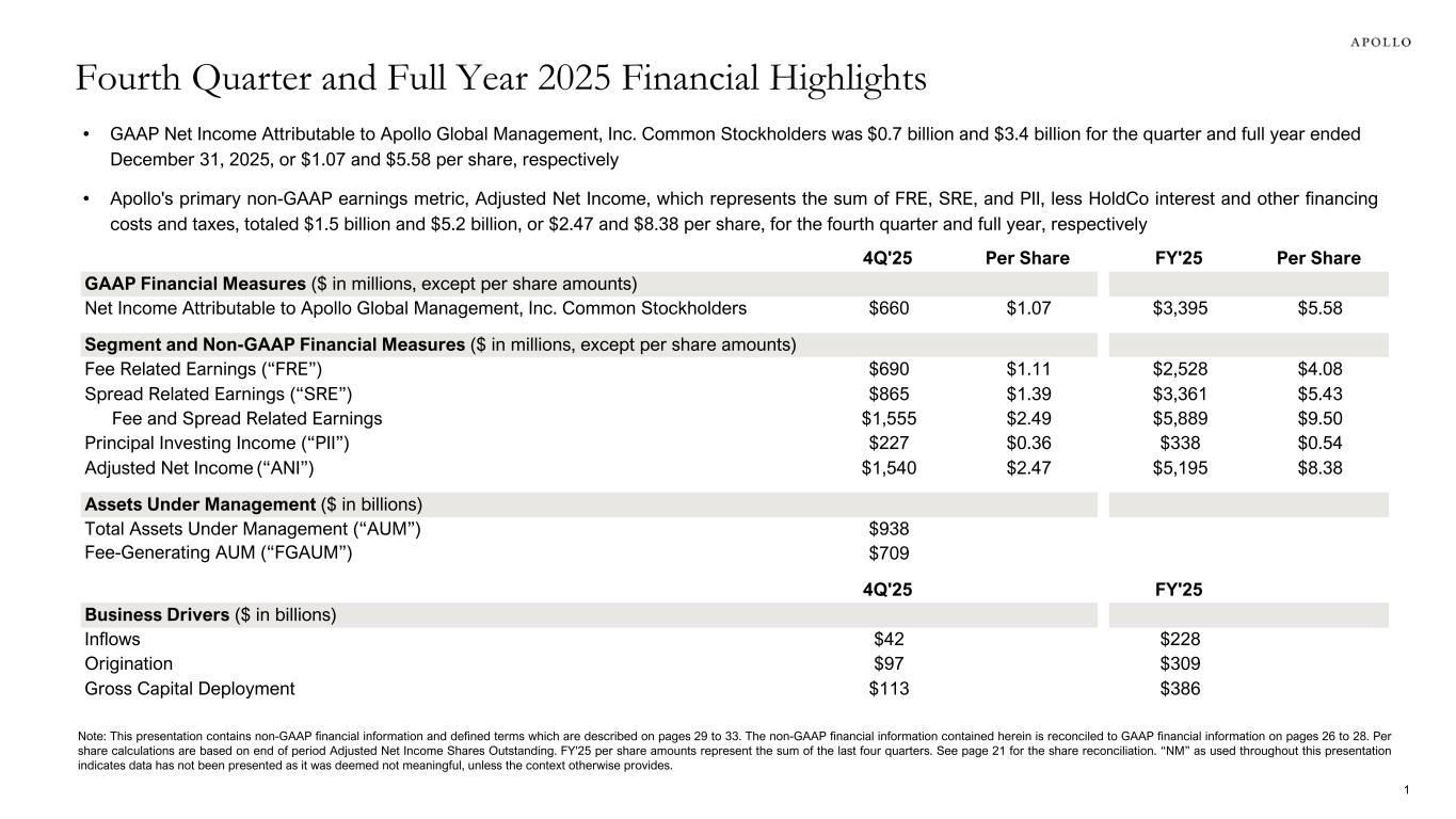 4Q'25 Per Share FY'25 Per Share GAAP Financial Measures ($ in millions, except per share amounts) Net Income Attributable to Apollo Global Management, Inc. Common Stockholders $660 $1.07 $3,395 $5.58 Segment and Non-GAAP Financial Measures ($ in millions, except per share amounts) Fee Related Earnings (“FRE”) $690 $1.11 $2,528 $4.08 Spread Related Earnings (“SRE”) $865 $1.39 $3,361 $5.43 Fee and Spread Related Earnings $1,555 $2.49 $5,889 $9.50 Principal Investing Income (“PII”) $227 $0.36 $338 $0.54 Adjusted Net Income (“ANI”) $1,540 $2.47 $5,195 $8.38 Assets Under Management ($ in billions) Total Assets Under Management (“AUM”) $938 Fee-Generating AUM (“FGAUM”) $709 4Q'25 FY'25 Business Drivers ($ in billions) Inflows $42 $228 Origination $97 $309 Gross Capital Deployment $113 $386 Fourth Quarter and Full Year 2025 Financial Highlights • GAAP Net Income Attributable to Apollo Global Management, Inc. Common Stockholders was $0.7 billion and $3.4 billion for the quarter and full year ended December 31, 2025, or $1.07 and $5.58 per share, respectively • Apollo's primary non-GAAP earnings metric, Adjusted Net Income, which represents the sum of FRE, SRE, and PII, less HoldCo interest and other financing costs and taxes, totaled $1.5 billion and $5.2 billion, or $2.47 and $8.38 per share, for the fourth quarter and full year, respectively Note: This presentation contains non-GAAP financial information and defined terms which are described on pages 29 to 33. The non-GAAP financial information contained herein is reconciled to GAAP financial information on pages 26 to 28. Per share calculations are based on end of period Adjusted Net Income Shares Outstanding. FY'25 per share amounts represent the sum of the last four quarters. See page 21 for the share reconciliation. “NM” as used throughout this presentation indicates data has not been presented as it was deemed not meaningful, unless the context otherwise provides. 1