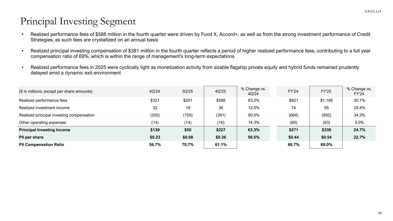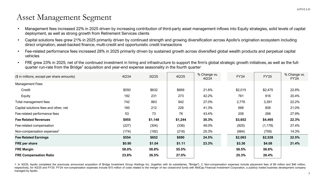 ($ in millions, except per share amounts) 4Q'24 3Q'25 4Q'25 FY'24 FY'25 Management fees $742 $863 $942 $2,776 $3,391 Capital solutions fees and other, net 160 212 226 668 808 Fee-related performance fees 53 73 76 208 266 Fee-related compensation (227) (304) (336) (925) (1,178) Non-compensation expenses (174) (192) (218) (664) (759) Fee Related Earnings $554 $652 $690 $2,063 $2,528 Net investment spread 1,094 1,118 1,142 4,147 4,368 Other operating expenses (116) (107) (119) (458) (447) Interest and other financing costs (137) (140) (158) (465) (560) Spread Related Earnings $841 $871 $865 $3,224 $3,361 Fee and Spread Related Earnings $1,395 $1,523 $1,555 $5,287 $5,889 Principal Investing Income $139 $50 $227 $271 $338 Segment Income $1,534 $1,573 $1,782 $5,558 $6,227 HoldCo interest and other financing costs1 (29) (33) (40) (80) (143) Taxes and related payables (145) (183) (202) (913) (889) Adjusted Net Income $1,360 $1,357 $1,540 $4,565 $5,195 ANI per share $2.22 $2.17 $2.47 $7.43 $8.38 1. Represents interest and other financing costs related to Apollo Global Management, Inc. not attributable to any specific segment. Total Segment Earnings 4