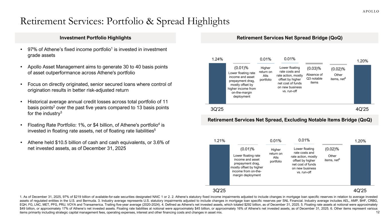 1.24% (0.01)% 0.01% 0.01% (0.03)% (0.02)% 1.20% 3Q'25 4Q'25 Investment Portfolio Highlights Retirement Services: Portfolio & Spread Highlights 12 Retirement Services Net Spread Bridge (QoQ) 1. As of December 31, 2025, 97% of $219 billion of available-for-sale securities designated NAIC 1 or 2. 2. Athene’s statutory fixed income impairments adjusted to include changes in mortgage loan specific reserves in relation to average invested assets of regulated entities in the U.S. and Bermuda. 3. Industry average represents U.S. statutory impairments adjusted to include changes in mortgage loan specific reserves per SNL Financial. Industry average includes AEL, AMP, BHF, CRBG, EQH, FG, LNC, MET, PFG, PRU, VOYA and Transamerica. Trailing five-year average (2020-2024). 4. Defined as Athene's net invested assets, which totaled $292 billion, as of December 31, 2025. 5. Floating rate assets at notional were approximately $49 billion, or approximately 17% of Athene’s net invested assets. Floating rate liabilities at notional were approximately $45 billion, or approximately 16% of Athene's net invested assets, as of December 31, 2025. 6. Other items represent various items primarily including strategic capital management fees, operating expenses, interest and other financing costs and changes in asset mix. • 97% of Athene’s fixed income portfolio1 is invested in investment grade assets • Apollo Asset Management aims to generate 30 to 40 basis points of asset outperformance across Athene's portfolio • Focus on directly originated, senior secured loans where control of origination results in better risk-adjusted return • Historical average annual credit losses across total portfolio of 11 basis points2 over the past five years compared to 13 basis points for the industry3 • Floating Rate Portfolio: 1%, or $4 billion, of Athene's portfolio4 is invested in floating rate assets, net of floating rate liabilities5 • Athene held $10.5 billion of cash and cash equivalents, or 3.6% of net invested assets, as of December 31, 2025 1.21% (0.01)% 0.01% 0.01% (0.02)% 1.20% 3Q'25 4Q'25 Retirement Services Net Spread, Excluding Notable Items Bridge (QoQ) Other items, net6 Other items, net6 Higher return on Alts portfolio Higher return on Alts portfolio Lower floating rate income and asset prepayment drag, mostly offset by higher income from on-the-margin deployment Lower floating rate costs and rate action, mostly offset by higher net cost of funds on new business vs. run-off Lower floating rate income and asset prepayment drag, mostly offset by higher income from on-the- margin deployment Absence of Q3 notable items Lower floating rate costs and rate action, mostly offset by higher net cost of funds on new business vs. run-off
