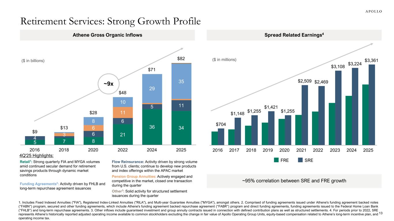 $704 $1,148 $1,255 $1,421 $1,255 $2,509 $2,469 $3,108 $3,224 $3,361 FRE SRE 2016 2017 2018 2019 2020 2021 2022 2023 2024 2025 Retail1: Strong quarterly FIA and MYGA volumes amid continued secular demand for retirement savings products through dynamic market conditions Funding Agreements2: Activity driven by FHLB and long-term repurchase agreement issuances Flow Reinsurance: Activity driven by strong volume from U.S. clients; continue to develop new products and index offerings within the APAC market Pension Group Annuities: Actively engaged and competitive in the market, closed one transaction during the quarter Other3: Solid activity for structured settlement issuances during the quarter $9 $13 $28 $48 $71 $82 5 7 8 21 36 34 4 6 6 5 11 3 6 11 8 10 29 35 2016 2018 2020 2022 2024 2025 1. Includes Fixed Indexed Annuities ("FIA"), Registered Index-Linked Annuities ("RILA"), and Multi-year Guarantee Annuities ("MYGA"), amongst others. 2. Comprised of funding agreements issued under Athene's funding agreement backed notes (“FABN”) program, secured and other funding agreements, which include Athene's funding agreement backed repurchase agreement (“FABR”) program and direct funding agreements, funding agreements issued to the Federal Home Loan Bank (“FHLB”) and long-term repurchase agreements. 3. Other inflows include guaranteed investment and group annuity contracts issued in connection with defined contribution plans as well as structured settlements. 4. For periods prior to 2022, SRE represents Athene’s historically reported adjusted operating income available to common stockholders excluding the change in fair value of Apollo Operating Group Units, equity-based compensation related to Athene’s long-term incentive plan, and operating income tax. Retirement Services: Strong Growth Profile Athene Gross Organic Inflows Spread Related Earnings4 ~9x ($ in billions) ~95% correlation between SRE and FRE growth 13 ($ in millions) 4Q'25 Highlights: