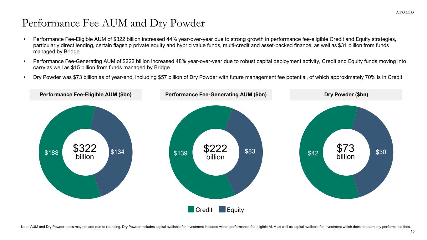 ($ in millions, except per share amounts) 4Q'24 3Q'25 4Q'25 % Change vs. 4Q'24 FY'24 FY'25 % Change vs. FY'24 Realized performance fees $321 $201 $588 83.2% $921 $1,198 30.1% Realized investment income 32 18 36 12.5% 74 95 28.4% Realized principal investing compensation (200) (155) (381) 90.5% (664) (892) 34.3% Other operating expenses (14) (14) (16) 14.3% (60) (63) 5.0% Principal Investing Income $139 $50 $227 63.3% $271 $338 24.7% PII per share $0.23 $0.08 $0.36 56.5% $0.44 $0.54 22.7% PII Compensation Ratio 56.7% 70.7% 61.1% 66.7% 69.0% Principal Investing Segment 14 • Realized performance fees of $588 million in the fourth quarter were driven by Fund X, Accord+, as well as from the strong investment performance of Credit Strategies, as such fees are crystallized on an annual basis • Realized principal investing compensation of $381 million in the fourth quarter reflects a period of higher realized performance fees, contributing to a full year compensation ratio of 69%, which is within the range of management's long-term expectations • Realized performance fees in 2025 were cyclically light as monetization activity from sizable flagship private equity and hybrid funds remained prudently delayed amid a dynamic exit environment