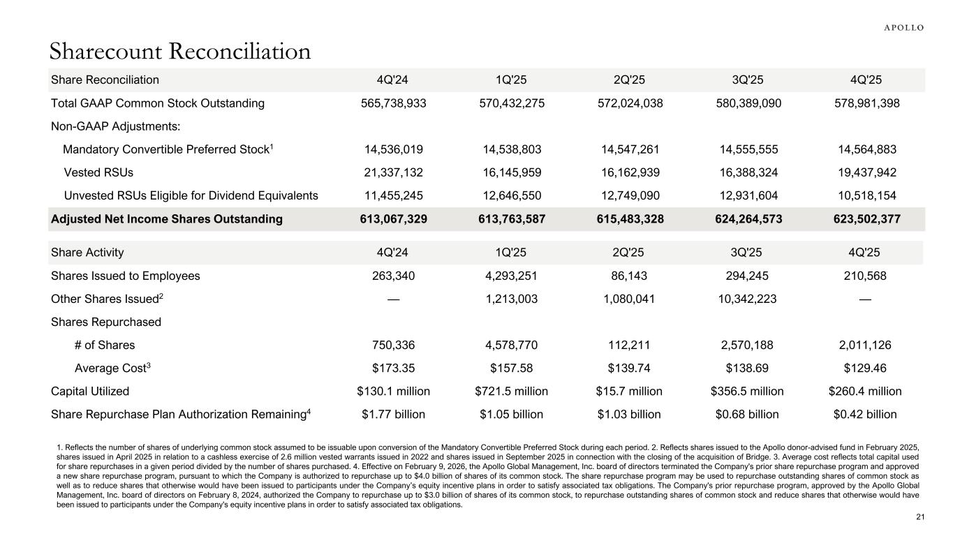 Share Reconciliation 4Q'24 1Q'25 2Q'25 3Q'25 4Q'25 Total GAAP Common Stock Outstanding 565,738,933 570,432,275 572,024,038 580,389,090 578,981,398 Non-GAAP Adjustments: Mandatory Convertible Preferred Stock1 14,536,019 14,538,803 14,547,261 14,555,555 14,564,883 Vested RSUs 21,337,132 16,145,959 16,162,939 16,388,324 19,437,942 Unvested RSUs Eligible for Dividend Equivalents 11,455,245 12,646,550 12,749,090 12,931,604 10,518,154 Adjusted Net Income Shares Outstanding 613,067,329 613,763,587 615,483,328 624,264,573 623,502,377 1. Reflects the number of shares of underlying common stock assumed to be issuable upon conversion of the Mandatory Convertible Preferred Stock during each period. 2. Reflects shares issued to the Apollo donor-advised fund in February 2025, shares issued in April 2025 in relation to a cashless exercise of 2.6 million vested warrants issued in 2022 and shares issued in September 2025 in connection with the closing of the acquisition of Bridge. 3. Average cost reflects total capital used for share repurchases in a given period divided by the number of shares purchased. 4. Effective on February 9, 2026, the Apollo Global Management, Inc. board of directors terminated the Company's prior share repurchase program and approved a new share repurchase program, pursuant to which the Company is authorized to repurchase up to $4.0 billion of shares of its common stock. The share repurchase program may be used to repurchase outstanding shares of common stock as well as to reduce shares that otherwise would have been issued to participants under the Company’s equity incentive plans in order to satisfy associated tax obligations. The Company's prior repurchase program, approved by the Apollo Global Management, Inc. board of directors on February 8, 2024, authorized the Company to repurchase up to $3.0 billion of shares of its common stock, to repurchase outstanding shares of common stock and reduce shares that otherwise would have been issued to participants under the Company's equity incentive plans in order to satisfy associated tax obligations. Share Activity 4Q'24 1Q'25 2Q'25 3Q'25 4Q'25 Shares Issued to Employees 263,340 4,293,251 86,143 294,245 210,568 Other Shares Issued2 — 1,213,003 1,080,041 10,342,223 — Shares Repurchased # of Shares 750,336 4,578,770 112,211 2,570,188 2,011,126 Average Cost3 $173.35 $157.58 $139.74 $138.69 $129.46 Capital Utilized $130.1 million $721.5 million $15.7 million $356.5 million $260.4 million Share Repurchase Plan Authorization Remaining4 $1.77 billion $1.05 billion $1.03 billion $0.68 billion $0.42 billion Sharecount Reconciliation 21
