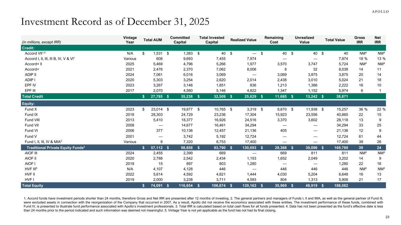(in millions, except IRR) Vintage Year Total AUM Committed Capital Total Invested Capital Realized Value Remaining Cost Unrealized Value Total Value Gross IRR Net IRR Credit: Accord VII1,5 N/A $ 1,531 $ 1,383 $ 40 $ — $ 40 $ 40 $ 40 NM4 NM4 Accord I, II, III, III B, IV, V & VI1 Various 608 9,693 7,455 7,974 — — 7,974 18 % 13 % Accord+ II 2025 5,469 4,796 5,266 1,977 3,570 3,747 5,724 NM4 NM4 Accord+ 2021 2,476 2,370 7,062 8,006 8 32 8,038 14 11 ADIP II 2024 7,061 6,016 3,069 — 3,069 3,875 3,875 20 14 ADIP I 2020 5,303 3,254 2,620 2,014 2,438 3,010 5,024 21 18 EPF IV 2023 3,267 3,146 1,851 836 1,213 1,386 2,222 16 10 EPF III 2017 2,070 4,580 5,146 4,822 1,347 1,152 5,974 6 1 Total Credit $ 27,785 $ 35,238 $ 32,509 $ 25,629 $ 11,685 $ 13,242 $ 38,871 Equity: Fund X 2023 $ 23,014 $ 19,877 $ 10,765 $ 3,319 $ 8,670 $ 11,938 $ 15,257 36 % 22 % Fund IX 2018 28,303 24,729 23,236 17,304 15,923 23,556 40,860 22 15 Fund VIII 2013 5,410 18,377 16,926 24,516 3,370 3,602 28,118 13 9 Fund VII 2008 — 14,677 16,461 34,294 — — 34,294 33 25 Fund VI 2006 377 10,136 12,457 21,136 405 — 21,136 12 9 Fund V 2001 — 3,742 5,192 12,724 — — 12,724 61 44 Fund I, II, III, IV & MIA2 Various 8 7,320 8,753 17,400 — — 17,400 39 26 Traditional Private Equity Funds3 $ 57,112 $ 98,858 $ 93,790 $ 130,693 $ 28,368 $ 39,096 $ 169,789 39 24 AIOF III 2024 2,455 2,399 669 — 669 811 811 NM4 NM4 AIOF II 2020 2,788 2,542 2,434 1,153 1,652 2,049 3,202 14 9 AIOF I 2018 15 897 803 1,280 — — 1,280 22 16 HVF III5 N/A 4,107 4,128 446 — 446 446 446 NM4 NM4 HVF II 2022 5,614 4,592 4,821 1,444 4,030 5,204 6,648 16 13 HVF I 2019 2,000 3,238 3,711 4,593 804 1,313 5,906 21 17 Total Equity $ 74,091 $ 116,654 $ 106,674 $ 139,163 $ 35,969 $ 48,919 $ 188,082 Investment Record as of December 31, 2025 23 1. Accord funds have investment periods shorter than 24 months, therefore Gross and Net IRR are presented after 12 months of investing. 2. The general partners and managers of Funds I, II and MIA, as well as the general partner of Fund III, were excluded assets in connection with the reorganization of the Company that occurred in 2007. As a result, Apollo did not receive the economics associated with these entities. The investment performance of these funds, combined with Fund IV, is presented to illustrate fund performance associated with Apollo’s investment professionals. 3. Total IRR is calculated based on total cash flows for all funds presented. 4. Data has not been presented as the fund’s effective date is less than 24 months prior to the period indicated and such information was deemed not meaningful. 5. Vintage Year is not yet applicable as the fund has not had its final closing.