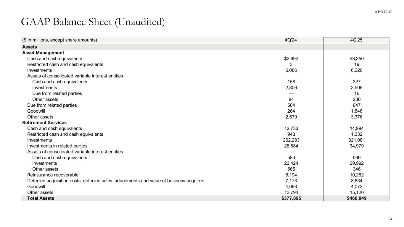 ($ in millions, except share amounts) 4Q'24 4Q'25 Liabilities Asset Management Accounts payable, accrued expenses, and other liabilities $3,616 $3,861 Due to related parties 710 1,062 Debt 4,279 5,516 Liabilities of consolidated variable interest entities Accounts payable, accrued expenses, and other liabilities 1,363 1,949 Retirement Services Interest sensitive contract liabilities 253,637 315,889 Future policy benefits 49,902 50,264 Market risk benefits 4,028 4,930 Debt 6,309 7,848 Payables for collateral on derivatives and securities to repurchase 11,652 11,085 Other liabilities 9,784 14,329 Liabilities of consolidated variable interest entities Other liabilities 1,635 1,701 Total Liabilities 346,915 418,434 Redeemable non-controlling interests Redeemable non-controlling interests 16 — Equity Mandatory Convertible Preferred Stock 1,398 1,398 Common Stock, $0.00001 par value, 90,000,000,000 shares authorized, 578,981,398 and 565,738,933 shares issued and outstanding as of December 31, 2025 and December 31, 2024, respectively — — Additional paid in capital 15,327 16,954 Retained earnings (accumulated deficit) 6,022 7,634 Accumulated other comprehensive income (loss) (5,494) (2,645) Total Apollo Global Management, Inc. Stockholders' Equity 17,253 23,341 Non-controlling interests 13,711 19,174 Total Equity 30,964 42,515 Total Liabilities, Redeemable non-controlling interests and Equity $377,895 $460,949 GAAP Balance Sheet (Unaudited) - cont'd 25