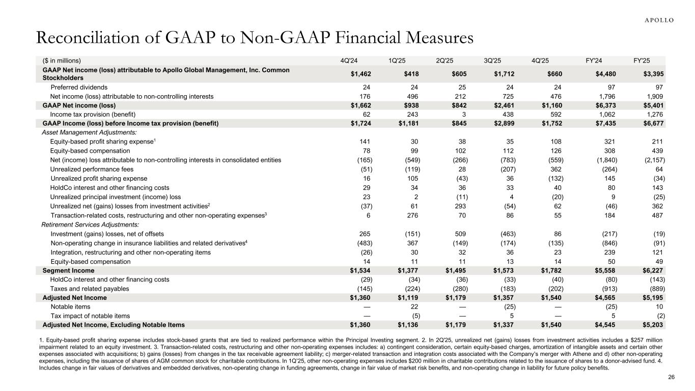 (In millions, except per share amounts) 4Q'24 3Q'25 4Q'25 FY'24 FY'25 Revenues     Asset Management     Management fees $523 $606 $681 $1,899 $2,378 Advisory and transaction fees, net 205 378 352 822 1,202 Investment income (loss) 395 444 207 1,305 1,143 Incentive fees 42 51 96 150 245 Property management, development and other fees — 8 24 — 32   Retirement Services     Premiums 155 117 2,277 1,318 2,628 Product charges 260 292 306 1,016 1,137 Net investment income 4,237 5,013 5,115 15,718 19,245 Investment related gains (losses) (1,037) 2,254 123 2,045 1,544 Revenues of consolidated variable interest entities 493 654 674 1,822 2,470 Other revenues 10 6 9 19 25   Total Revenues 5,283 9,823 9,864 26,114 32,049 Expenses Asset Management     Compensation and benefits (732) (761) (885) (2,608) (2,993) Interest expense (67) (64) (72) (226) (256) General, administrative and other (285) (409) (459) (1,170) (1,546)   Retirement Services     Interest sensitive contract benefits (1,642) (4,164) (3,003) (8,949) (12,089) Future policy and other policy benefits (623) (613) (2,752) (3,054) (4,433) Market risk benefits remeasurement gains (losses) 456 (131) (47) 102 (452) Amortization of deferred acquisition costs, deferred sales inducements and value of business acquired (263) (355) (328) (941) (1,242) Policy and other operating expenses (535) (573) (613) (2,136) (2,278)   Total Expenses (3,691) (7,070) (8,159) (18,982) (25,289) Other Income (Loss) – Asset Management Net gains (losses) from investment activities 25 78 (43) 58 (251) Net gains (losses) from investment activities of consolidated variable interest entities 20 35 54 90 304 Other income (loss), net 87 33 36 155 (136) Total Other Income (Loss) 132 146 47 303 (83) Income (loss) before income tax (provision) benefit 1,724 2,899 1,752 7,435 6,677 Income tax (provision) benefit (62) (438) (592) (1,062) (1,276) Net income (loss) 1,662 2,461 1,160 6,373 5,401 Net (income) loss attributable to non-controlling interests (176) (725) (476) (1,796) (1,909) Net income (loss) attributable to Apollo Global Management, Inc. 1,486 1,736 684 4,577 3,492 Preferred stock dividends (24) (24) (24) (97) (97) Net income (loss) attributable to Apollo Global Management, Inc. Common Stockholders $1,462 $1,712 $660 $4,480 $3,395       Earnings (Loss) per share Net income (loss) attributable to Common Stockholders - Basic $2.42 $2.82 $1.07 $7.39 $5.58 Net income (loss) attributable to Common Stockholders - Diluted $2.39 $2.78 $1.07 $7.33 $5.54 Weighted average shares outstanding - Basic 584 589 594 586 589 Weighted average shares outstanding - Diluted 603 608 598 604 594 GAAP Income Statement (Unaudited) 2
