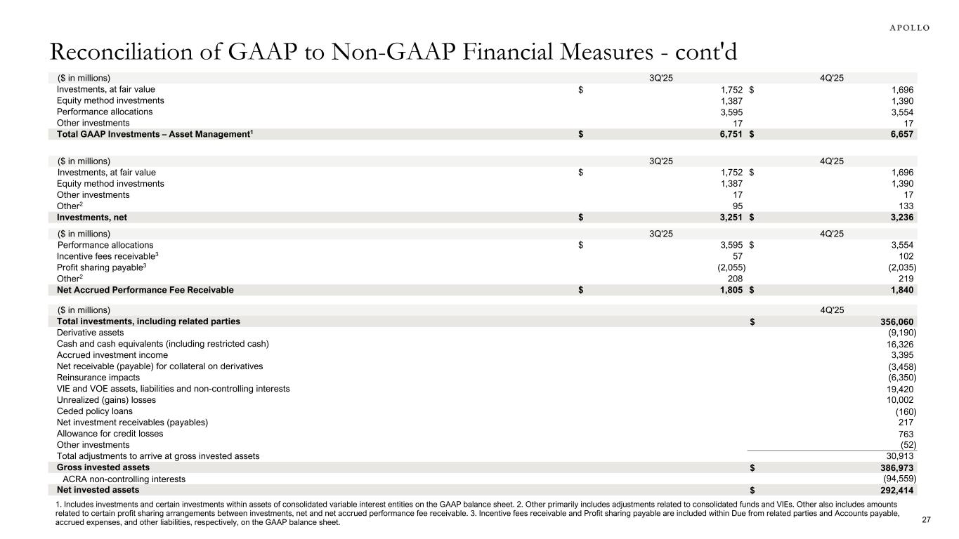 ($ in millions) 4Q'24 1Q'25 2Q'25 3Q'25 4Q'25 FY'24 FY'25 GAAP Net income (loss) attributable to Apollo Global Management, Inc. Common Stockholders $1,462 $418 $605 $1,712 $660 $4,480 $3,395 Preferred dividends 24 24 25 24 24 97 97 Net income (loss) attributable to non-controlling interests 176 496 212 725 476 1,796 1,909 GAAP Net income (loss) $1,662 $938 $842 $2,461 $1,160 $6,373 $5,401 Income tax provision (benefit) 62 243 3 438 592 1,062 1,276 GAAP Income (loss) before Income tax provision (benefit) $1,724 $1,181 $845 $2,899 $1,752 $7,435 $6,677 Asset Management Adjustments: Equity-based profit sharing expense1 141 30 38 35 108 321 211 Equity-based compensation 78 99 102 112 126 308 439 Net (income) loss attributable to non-controlling interests in consolidated entities (165) (549) (266) (783) (559) (1,840) (2,157) Unrealized performance fees (51) (119) 28 (207) 362 (264) 64 Unrealized profit sharing expense 16 105 (43) 36 (132) 145 (34) HoldCo interest and other financing costs 29 34 36 33 40 80 143 Unrealized principal investment (income) loss 23 2 (11) 4 (20) 9 (25) Unrealized net (gains) losses from investment activities2 (37) 61 293 (54) 62 (46) 362 Transaction-related costs, restructuring and other non-operating expenses3 6 276 70 86 55 184 487 Retirement Services Adjustments: Investment (gains) losses, net of offsets 265 (151) 509 (463) 86 (217) (19) Non-operating change in insurance liabilities and related derivatives4 (483) 367 (149) (174) (135) (846) (91) Integration, restructuring and other non-operating items (26) 30 32 36 23 239 121 Equity-based compensation 14 11 11 13 14 50 49 Segment Income $1,534 $1,377 $1,495 $1,573 $1,782 $5,558 $6,227 HoldCo interest and other financing costs (29) (34) (36) (33) (40) (80) (143) Taxes and related payables (145) (224) (280) (183) (202) (913) (889) Adjusted Net Income $1,360 $1,119 $1,179 $1,357 $1,540 $4,565 $5,195 Notable items — 22 — (25) — (25) 10 Tax impact of notable items — (5) — 5 — 5 (2) Adjusted Net Income, Excluding Notable Items $1,360 $1,136 $1,179 $1,337 $1,540 $4,545 $5,203 1. Equity-based profit sharing expense includes stock-based grants that are tied to realized performance within the Principal Investing segment. 2. In 2Q'25, unrealized net (gains) losses from investment activities includes a $257 million impairment related to an equity investment. 3. Transaction-related costs, restructuring and other non-operating expenses includes: a) contingent consideration, certain equity-based charges, amortization of intangible assets and certain other expenses associated with acquisitions; b) gains (losses) from changes in the tax receivable agreement liability; c) merger-related transaction and integration costs associated with the Company’s merger with Athene and d) other non-operating expenses, including the issuance of shares of AGM common stock for charitable contributions. In 1Q’25, other non-operating expenses includes $200 million in charitable contributions related to the issuance of shares to a donor-advised fund. 4. Includes change in fair values of derivatives and embedded derivatives, non-operating change in funding agreements, change in fair value of market risk benefits, and non-operating change in liability for future policy benefits. Reconciliation of GAAP to Non-GAAP Financial Measures 26