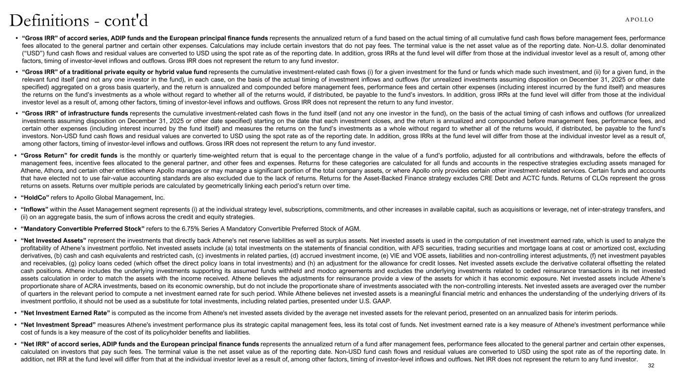 • “Gross IRR” of accord series, ADIP funds and the European principal finance funds represents the annualized return of a fund based on the actual timing of all cumulative fund cash flows before management fees, performance fees allocated to the general partner and certain other expenses. Calculations may include certain investors that do not pay fees. The terminal value is the net asset value as of the reporting date. Non-U.S. dollar denominated (“USD”) fund cash flows and residual values are converted to USD using the spot rate as of the reporting date. In addition, gross IRRs at the fund level will differ from those at the individual investor level as a result of, among other factors, timing of investor-level inflows and outflows. Gross IRR does not represent the return to any fund investor. • “Gross IRR” of a traditional private equity or hybrid value fund represents the cumulative investment-related cash flows (i) for a given investment for the fund or funds which made such investment, and (ii) for a given fund, in the relevant fund itself (and not any one investor in the fund), in each case, on the basis of the actual timing of investment inflows and outflows (for unrealized investments assuming disposition on December 31, 2025 or other date specified) aggregated on a gross basis quarterly, and the return is annualized and compounded before management fees, performance fees and certain other expenses (including interest incurred by the fund itself) and measures the returns on the fund’s investments as a whole without regard to whether all of the returns would, if distributed, be payable to the fund’s investors. In addition, gross IRRs at the fund level will differ from those at the individual investor level as a result of, among other factors, timing of investor-level inflows and outflows. Gross IRR does not represent the return to any fund investor. • “Gross IRR” of infrastructure funds represents the cumulative investment-related cash flows in the fund itself (and not any one investor in the fund), on the basis of the actual timing of cash inflows and outflows (for unrealized investments assuming disposition on December 31, 2025 or other date specified) starting on the date that each investment closes, and the return is annualized and compounded before management fees, performance fees, and certain other expenses (including interest incurred by the fund itself) and measures the returns on the fund’s investments as a whole without regard to whether all of the returns would, if distributed, be payable to the fund’s investors. Non-USD fund cash flows and residual values are converted to USD using the spot rate as of the reporting date. In addition, gross IRRs at the fund level will differ from those at the individual investor level as a result of, among other factors, timing of investor-level inflows and outflows. Gross IRR does not represent the return to any fund investor. • “Gross Return” for credit funds is the monthly or quarterly time-weighted return that is equal to the percentage change in the value of a fund’s portfolio, adjusted for all contributions and withdrawals, before the effects of management fees, incentive fees allocated to the general partner, and other fees and expenses. Returns for these categories are calculated for all funds and accounts in the respective strategies excluding assets managed for Athene, Athora, and certain other entities where Apollo manages or may manage a significant portion of the total company assets, or where Apollo only provides certain other investment-related services. Certain funds and accounts that have elected not to use fair-value accounting standards are also excluded due to the lack of returns. Returns for the Asset-Backed Finance strategy excludes CRE Debt and ACTC funds. Returns of CLOs represent the gross returns on assets. Returns over multiple periods are calculated by geometrically linking each period’s return over time. • “HoldCo” refers to Apollo Global Management, Inc. • “Inflows” within the Asset Management segment represents (i) at the individual strategy level, subscriptions, commitments, and other increases in available capital, such as acquisitions or leverage, net of inter-strategy transfers, and (ii) on an aggregate basis, the sum of inflows across the credit and equity strategies. • “Mandatory Convertible Preferred Stock” refers to the 6.75% Series A Mandatory Convertible Preferred Stock of AGM. • “Net Invested Assets” represent the investments that directly back Athene's net reserve liabilities as well as surplus assets. Net invested assets is used in the computation of net investment earned rate, which is used to analyze the profitability of Athene’s investment portfolio. Net invested assets include (a) total investments on the statements of financial condition, with AFS securities, trading securities and mortgage loans at cost or amortized cost, excluding derivatives, (b) cash and cash equivalents and restricted cash, (c) investments in related parties, (d) accrued investment income, (e) VIE and VOE assets, liabilities and non-controlling interest adjustments, (f) net investment payables and receivables, (g) policy loans ceded (which offset the direct policy loans in total investments) and (h) an adjustment for the allowance for credit losses. Net invested assets exclude the derivative collateral offsetting the related cash positions. Athene includes the underlying investments supporting its assumed funds withheld and modco agreements and excludes the underlying investments related to ceded reinsurance transactions in its net invested assets calculation in order to match the assets with the income received. Athene believes the adjustments for reinsurance provide a view of the assets for which it has economic exposure. Net invested assets include Athene’s proportionate share of ACRA investments, based on its economic ownership, but do not inc