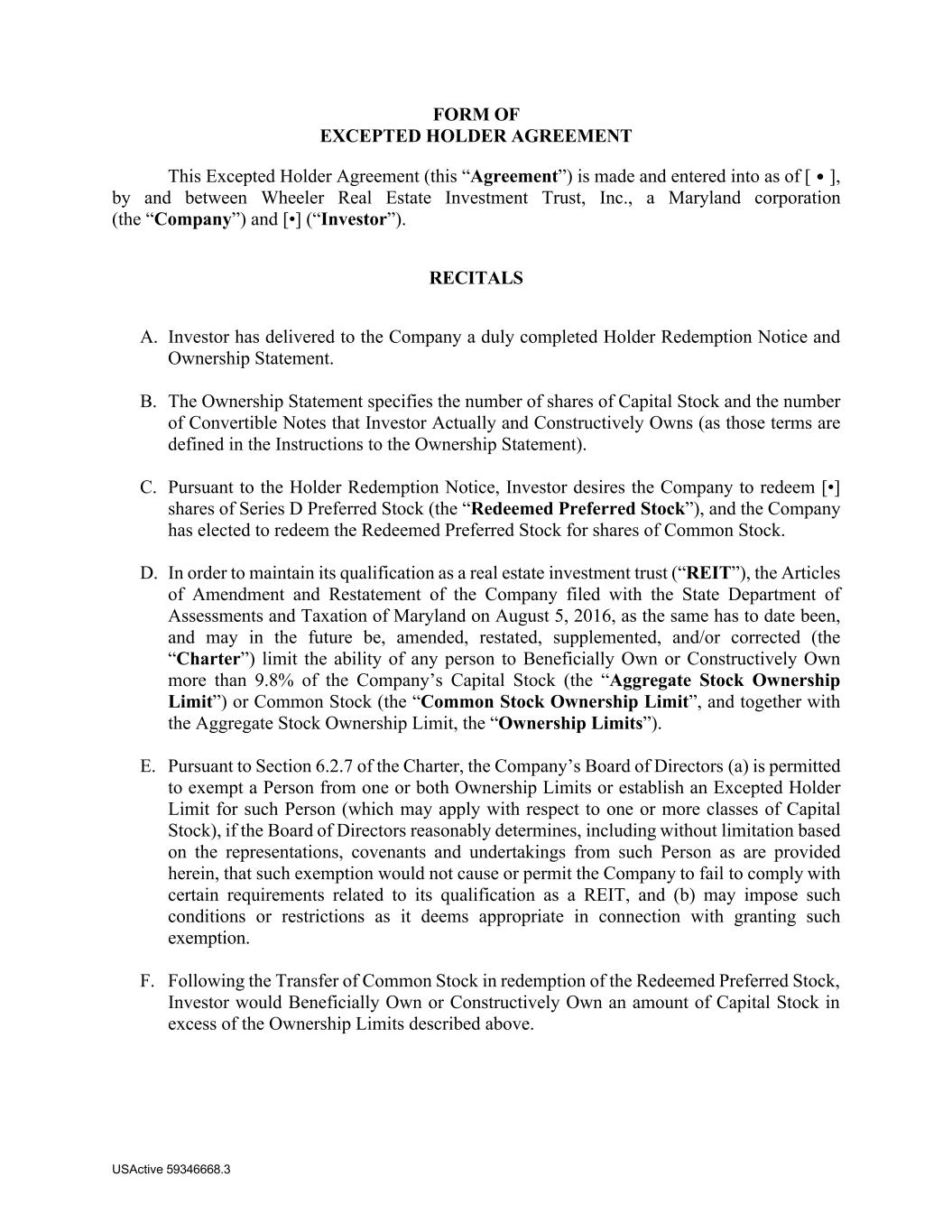 USActive 59346668.3 FORM OF EXCEPTED HOLDER AGREEMENT This Excepted Holder Agreement (this “Agreement”) is made and entered into as of [], by and between Wheeler Real Estate Investment Trust, Inc., a Maryland corporation (the “Company”) and [•] (“Investor”). RECITALS A. Investor has delivered to the Company a duly completed Holder Redemption Notice and Ownership Statement. B. The Ownership Statement specifies the number of shares of Capital Stock and the number of Convertible Notes that Investor Actually and Constructively Owns (as those terms are defined in the Instructions to the Ownership Statement). C. Pursuant to the Holder Redemption Notice, Investor desires the Company to redeem [•] shares of Series D Preferred Stock (the “Redeemed Preferred Stock”), and the Company has elected to redeem the Redeemed Preferred Stock for shares of Common Stock. D. In order to maintain its qualification as a real estate investment trust (“REIT”), the Articles of Amendment and Restatement of the Company filed with the State Department of Assessments and Taxation of Maryland on August 5, 2016, as the same has to date been, and may in the future be, amended, restated, supplemented, and/or corrected (the “Charter”) limit the ability of any person to Beneficially Own or Constructively Own more than 9.8% of the Company’s Capital Stock (the “Aggregate Stock Ownership Limit”) or Common Stock (the “Common Stock Ownership Limit”, and together with the Aggregate Stock Ownership Limit, the “Ownership Limits”). E. Pursuant to Section 6.2.7 of the Charter, the Company’s Board of Directors (a) is permitted to exempt a Person from one or both Ownership Limits or establish an Excepted Holder Limit for such Person (which may apply with respect to one or more classes of Capital Stock), if the Board of Directors reasonably determines, including without limitation based on the representations, covenants and undertakings from such Person as are provided herein, that such exemption would not cause or permit the Company to fail to comply with certain requirements related to its qualification as a REIT, and (b) may impose such conditions or restrictions as it deems appropriate in connection with granting such exemption. F. Following the Transfer of Common Stock in redemption of the Redeemed Preferred Stock, Investor would Beneficially Own or Constructively Own an amount of Capital Stock in excess of the Ownership Limits described above.