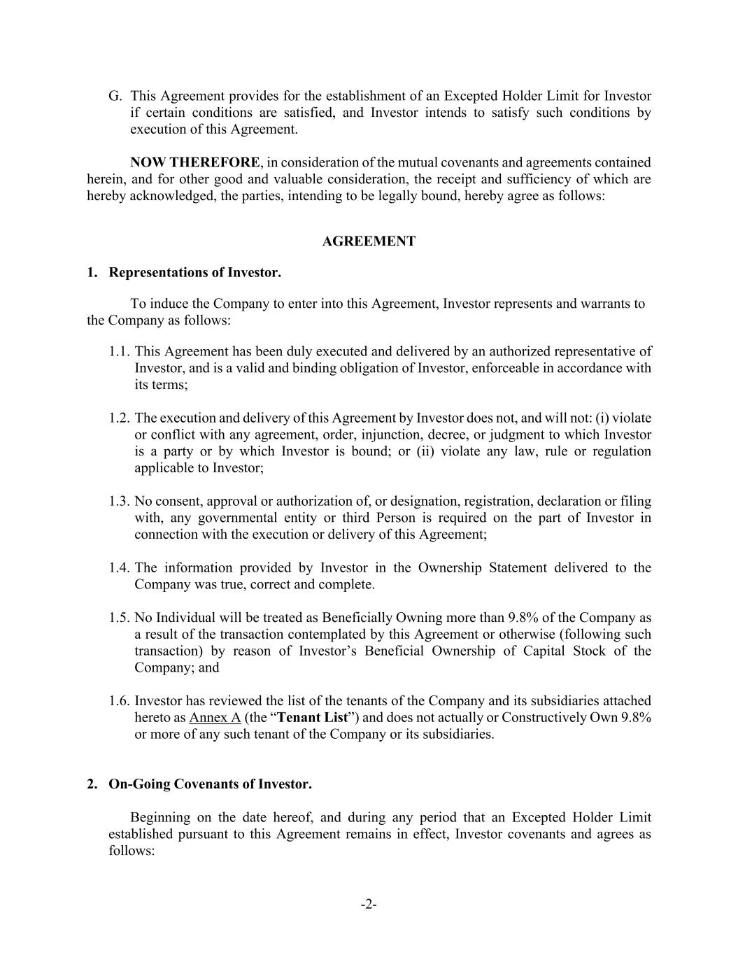 -2- G. This Agreement provides for the establishment of an Excepted Holder Limit for Investor if certain conditions are satisfied, and Investor intends to satisfy such conditions by execution of this Agreement. NOW THEREFORE, in consideration of the mutual covenants and agreements contained herein, and for other good and valuable consideration, the receipt and sufficiency of which are hereby acknowledged, the parties, intending to be legally bound, hereby agree as follows: AGREEMENT 1. Representations of Investor. To induce the Company to enter into this Agreement, Investor represents and warrants to the Company as follows: 1.1. This Agreement has been duly executed and delivered by an authorized representative of Investor, and is a valid and binding obligation of Investor, enforceable in accordance with its terms; 1.2. The execution and delivery of this Agreement by Investor does not, and will not: (i) violate or conflict with any agreement, order, injunction, decree, or judgment to which Investor is a party or by which Investor is bound; or (ii) violate any law, rule or regulation applicable to Investor; 1.3. No consent, approval or authorization of, or designation, registration, declaration or filing with, any governmental entity or third Person is required on the part of Investor in connection with the execution or delivery of this Agreement; 1.4. The information provided by Investor in the Ownership Statement delivered to the Company was true, correct and complete. 1.5. No Individual will be treated as Beneficially Owning more than 9.8% of the Company as a result of the transaction contemplated by this Agreement or otherwise (following such transaction) by reason of Investor’s Beneficial Ownership of Capital Stock of the Company; and 1.6. Investor has reviewed the list of the tenants of the Company and its subsidiaries attached hereto as Annex A (the “Tenant List”) and does not actually or Constructively Own 9.8% or more of any such tenant of the Company or its subsidiaries. 2. On-Going Covenants of Investor. Beginning on the date hereof, and during any period that an Excepted Holder Limit established pursuant to this Agreement remains in effect, Investor covenants and agrees as follows: