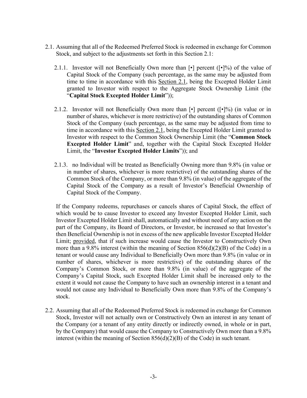 -3- 2.1. Assuming that all of the Redeemed Preferred Stock is redeemed in exchange for Common Stock, and subject to the adjustments set forth in this Section 2.1: 2.1.1. Investor will not Beneficially Own more than [•] percent ([•]%) of the value of Capital Stock of the Company (such percentage, as the same may be adjusted from time to time in accordance with this Section 2.1, being the Excepted Holder Limit granted to Investor with respect to the Aggregate Stock Ownership Limit (the “Capital Stock Excepted Holder Limit”)); 2.1.2. Investor will not Beneficially Own more than [•] percent ([•]%) (in value or in number of shares, whichever is more restrictive) of the outstanding shares of Common Stock of the Company (such percentage, as the same may be adjusted from time to time in accordance with this Section 2.1, being the Excepted Holder Limit granted to Investor with respect to the Common Stock Ownership Limit (the “Common Stock Excepted Holder Limit” and, together with the Capital Stock Excepted Holder Limit, the “Investor Excepted Holder Limits”)); and 2.1.3. no Individual will be treated as Beneficially Owning more than 9.8% (in value or in number of shares, whichever is more restrictive) of the outstanding shares of the Common Stock of the Company, or more than 9.8% (in value) of the aggregate of the Capital Stock of the Company as a result of Investor’s Beneficial Ownership of Capital Stock of the Company. If the Company redeems, repurchases or cancels shares of Capital Stock, the effect of which would be to cause Investor to exceed any Investor Excepted Holder Limit, such Investor Excepted Holder Limit shall, automatically and without need of any action on the part of the Company, its Board of Directors, or Investor, be increased so that Investor’s then Beneficial Ownership is not in excess of the new applicable Investor Excepted Holder Limit; provided, that if such increase would cause the Investor to Constructively Own more than a 9.8% interest (within the meaning of Section 856(d)(2)(B) of the Code) in a tenant or would cause any Individual to Beneficially Own more than 9.8% (in value or in number of shares, whichever is more restrictive) of the outstanding shares of the Company’s Common Stock, or more than 9.8% (in value) of the aggregate of the Company’s Capital Stock, such Excepted Holder Limit shall be increased only to the extent it would not cause the Company to have such an ownership interest in a tenant and would not cause any Individual to Beneficially Own more than 9.8% of the Company’s stock. 2.2. Assuming that all of the Redeemed Preferred Stock is redeemed in exchange for Common Stock, Investor will not actually own or Constructively Own an interest in any tenant of the Company (or a tenant of any entity directly or indirectly owned, in whole or in part, by the Company) that would cause the Company to Constructively Own more than a 9.8% interest (within the meaning of Section 856(d)(2)(B) of the Code) in such tenant.