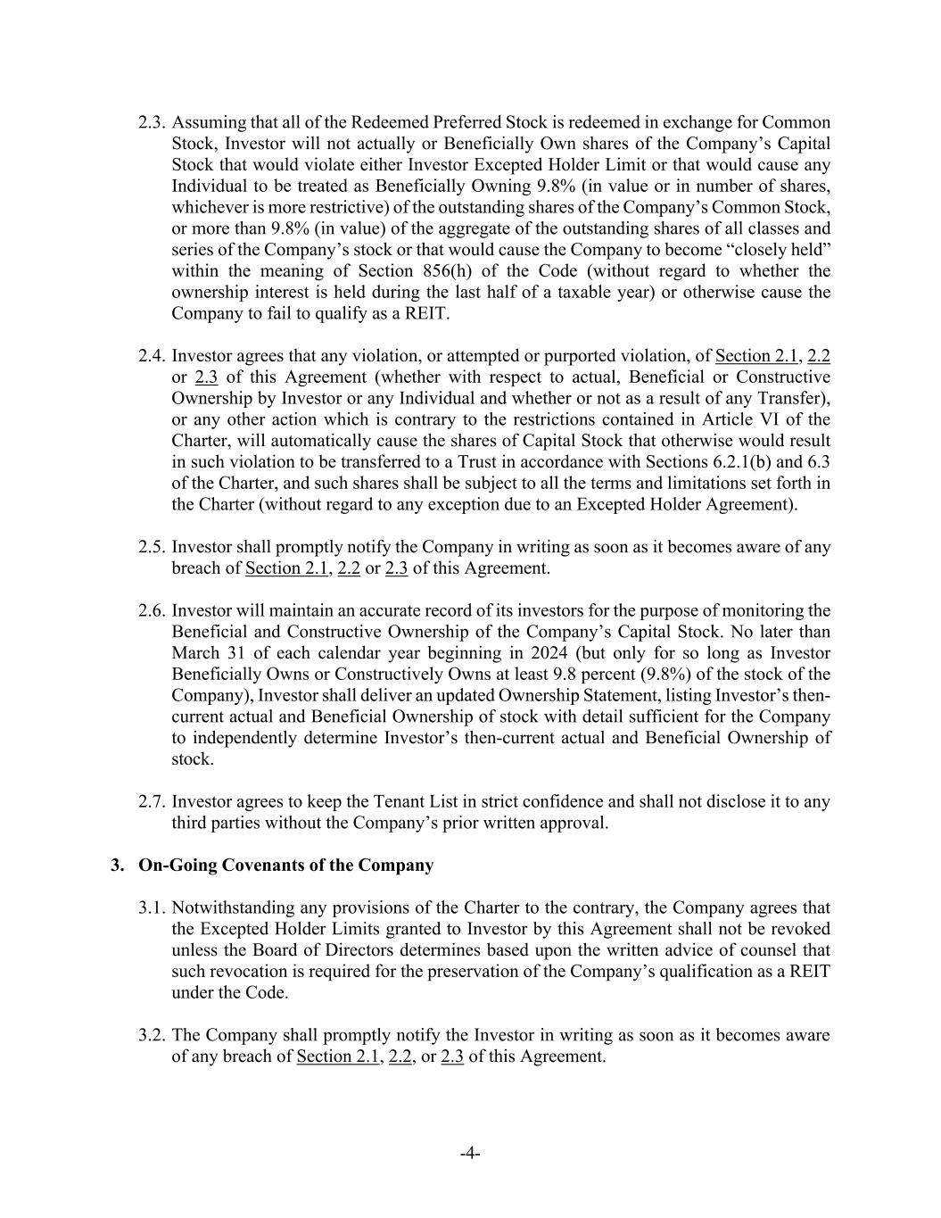 -4- 2.3. Assuming that all of the Redeemed Preferred Stock is redeemed in exchange for Common Stock, Investor will not actually or Beneficially Own shares of the Company’s Capital Stock that would violate either Investor Excepted Holder Limit or that would cause any Individual to be treated as Beneficially Owning 9.8% (in value or in number of shares, whichever is more restrictive) of the outstanding shares of the Company’s Common Stock, or more than 9.8% (in value) of the aggregate of the outstanding shares of all classes and series of the Company’s stock or that would cause the Company to become “closely held” within the meaning of Section 856(h) of the Code (without regard to whether the ownership interest is held during the last half of a taxable year) or otherwise cause the Company to fail to qualify as a REIT. 2.4. Investor agrees that any violation, or attempted or purported violation, of Section 2.1, 2.2 or 2.3 of this Agreement (whether with respect to actual, Beneficial or Constructive Ownership by Investor or any Individual and whether or not as a result of any Transfer), or any other action which is contrary to the restrictions contained in Article VI of the Charter, will automatically cause the shares of Capital Stock that otherwise would result in such violation to be transferred to a Trust in accordance with Sections 6.2.1(b) and 6.3 of the Charter, and such shares shall be subject to all the terms and limitations set forth in the Charter (without regard to any exception due to an Excepted Holder Agreement). 2.5. Investor shall promptly notify the Company in writing as soon as it becomes aware of any breach of Section 2.1, 2.2 or 2.3 of this Agreement. 2.6. Investor will maintain an accurate record of its investors for the purpose of monitoring the Beneficial and Constructive Ownership of the Company’s Capital Stock. No later than March 31 of each calendar year beginning in 2024 (but only for so long as Investor Beneficially Owns or Constructively Owns at least 9.8 percent (9.8%) of the stock of the Company), Investor shall deliver an updated Ownership Statement, listing Investor’s then- current actual and Beneficial Ownership of stock with detail sufficient for the Company to independently determine Investor’s then-current actual and Beneficial Ownership of stock. 2.7. Investor agrees to keep the Tenant List in strict confidence and shall not disclose it to any third parties without the Company’s prior written approval. 3. On-Going Covenants of the Company 3.1. Notwithstanding any provisions of the Charter to the contrary, the Company agrees that the Excepted Holder Limits granted to Investor by this Agreement shall not be revoked unless the Board of Directors determines based upon the written advice of counsel that such revocation is required for the preservation of the Company’s qualification as a REIT under the Code. 3.2. The Company shall promptly notify the Investor in writing as soon as it becomes aware of any breach of Section 2.1, 2.2, or 2.3 of this Agreement.