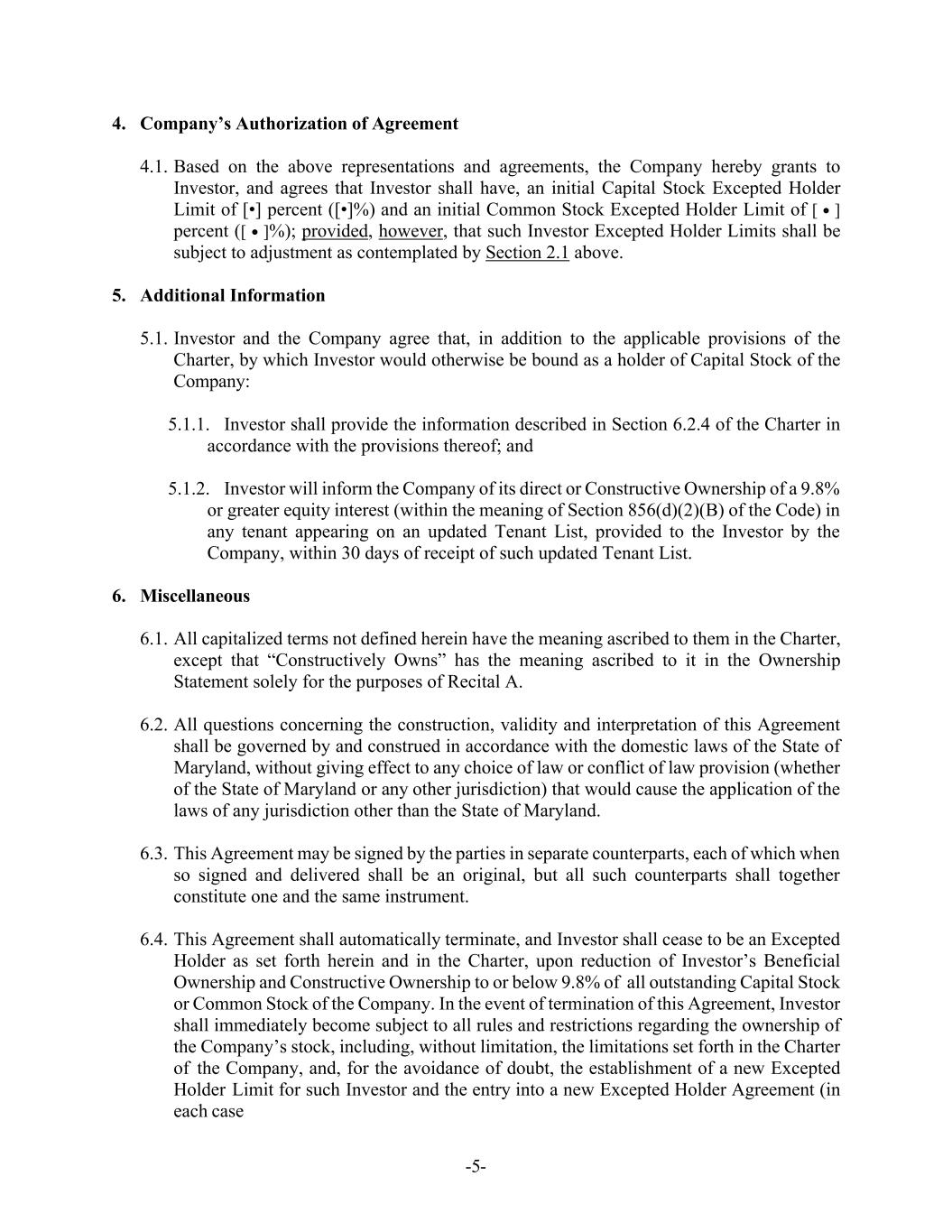 -5- 4. Company’s Authorization of Agreement 4.1. Based on the above representations and agreements, the Company hereby grants to Investor, and agrees that Investor shall have, an initial Capital Stock Excepted Holder Limit of [•] percent ([•]%) and an initial Common Stock Excepted Holder Limit of [] percent ([]%); provided, however, that such Investor Excepted Holder Limits shall be subject to adjustment as contemplated by Section 2.1 above. 5. Additional Information 5.1. Investor and the Company agree that, in addition to the applicable provisions of the Charter, by which Investor would otherwise be bound as a holder of Capital Stock of the Company: 5.1.1. Investor shall provide the information described in Section 6.2.4 of the Charter in accordance with the provisions thereof; and 5.1.2. Investor will inform the Company of its direct or Constructive Ownership of a 9.8% or greater equity interest (within the meaning of Section 856(d)(2)(B) of the Code) in any tenant appearing on an updated Tenant List, provided to the Investor by the Company, within 30 days of receipt of such updated Tenant List. 6. Miscellaneous 6.1. All capitalized terms not defined herein have the meaning ascribed to them in the Charter, except that “Constructively Owns” has the meaning ascribed to it in the Ownership Statement solely for the purposes of Recital A. 6.2. All questions concerning the construction, validity and interpretation of this Agreement shall be governed by and construed in accordance with the domestic laws of the State of Maryland, without giving effect to any choice of law or conflict of law provision (whether of the State of Maryland or any other jurisdiction) that would cause the application of the laws of any jurisdiction other than the State of Maryland. 6.3. This Agreement may be signed by the parties in separate counterparts, each of which when so signed and delivered shall be an original, but all such counterparts shall together constitute one and the same instrument. 6.4. This Agreement shall automatically terminate, and Investor shall cease to be an Excepted Holder as set forth herein and in the Charter, upon reduction of Investor’s Beneficial Ownership and Constructive Ownership to or below 9.8% of all outstanding Capital Stock or Common Stock of the Company. In the event of termination of this Agreement, Investor shall immediately become subject to all rules and restrictions regarding the ownership of the Company’s stock, including, without limitation, the limitations set forth in the Charter of the Company, and, for the avoidance of doubt, the establishment of a new Excepted Holder Limit for such Investor and the entry into a new Excepted Holder Agreement (in each case