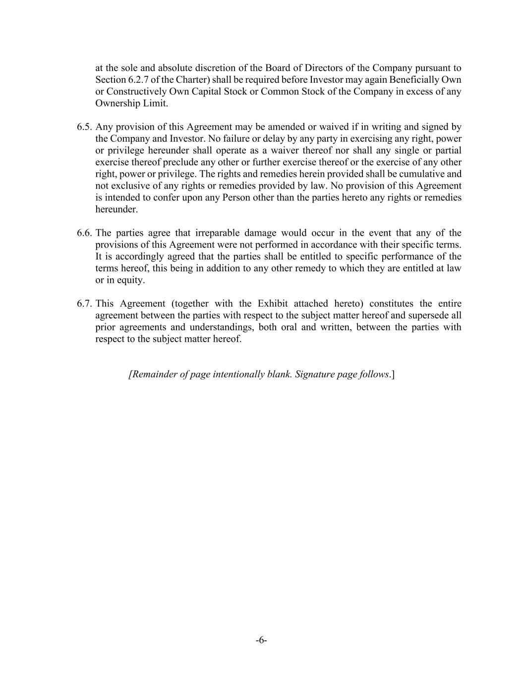 -6- at the sole and absolute discretion of the Board of Directors of the Company pursuant to Section 6.2.7 of the Charter) shall be required before Investor may again Beneficially Own or Constructively Own Capital Stock or Common Stock of the Company in excess of any Ownership Limit. 6.5. Any provision of this Agreement may be amended or waived if in writing and signed by the Company and Investor. No failure or delay by any party in exercising any right, power or privilege hereunder shall operate as a waiver thereof nor shall any single or partial exercise thereof preclude any other or further exercise thereof or the exercise of any other right, power or privilege. The rights and remedies herein provided shall be cumulative and not exclusive of any rights or remedies provided by law. No provision of this Agreement is intended to confer upon any Person other than the parties hereto any rights or remedies hereunder. 6.6. The parties agree that irreparable damage would occur in the event that any of the provisions of this Agreement were not performed in accordance with their specific terms. It is accordingly agreed that the parties shall be entitled to specific performance of the terms hereof, this being in addition to any other remedy to which they are entitled at law or in equity. 6.7. This Agreement (together with the Exhibit attached hereto) constitutes the entire agreement between the parties with respect to the subject matter hereof and supersede all prior agreements and understandings, both oral and written, between the parties with respect to the subject matter hereof. [Remainder of page intentionally blank. Signature page follows.]