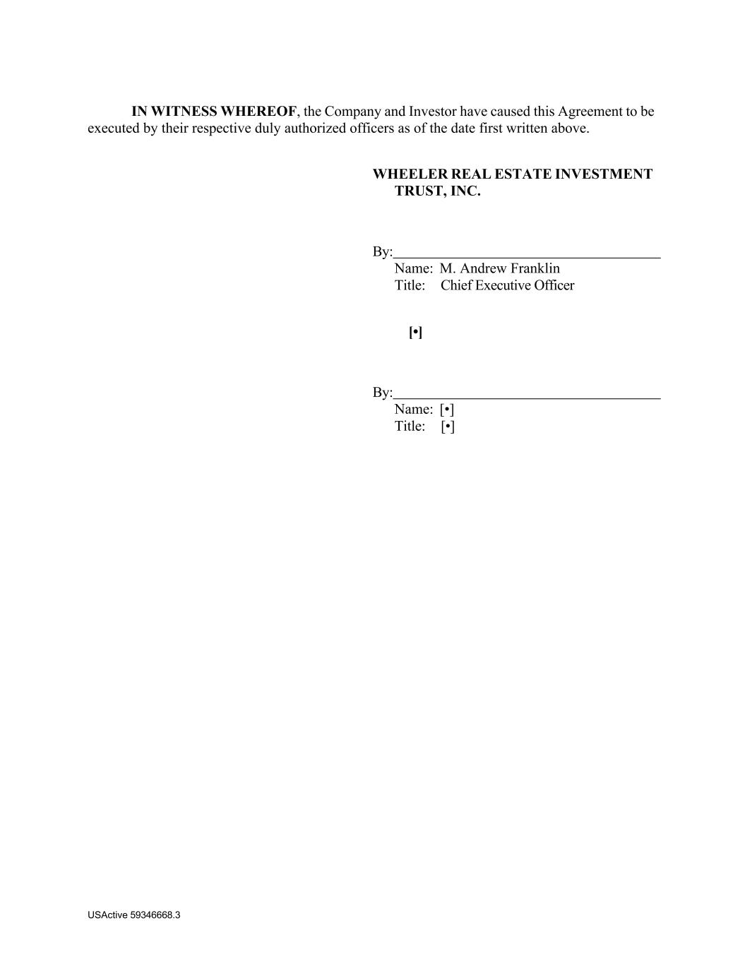 USActive 59346668.3 IN WITNESS WHEREOF, the Company and Investor have caused this Agreement to be executed by their respective duly authorized officers as of the date first written above. WHEELER REAL ESTATE INVESTMENT TRUST, INC. By: Name: M. Andrew Franklin Title: Chief Executive Officer [•] By: Name: [•] Title: [•]