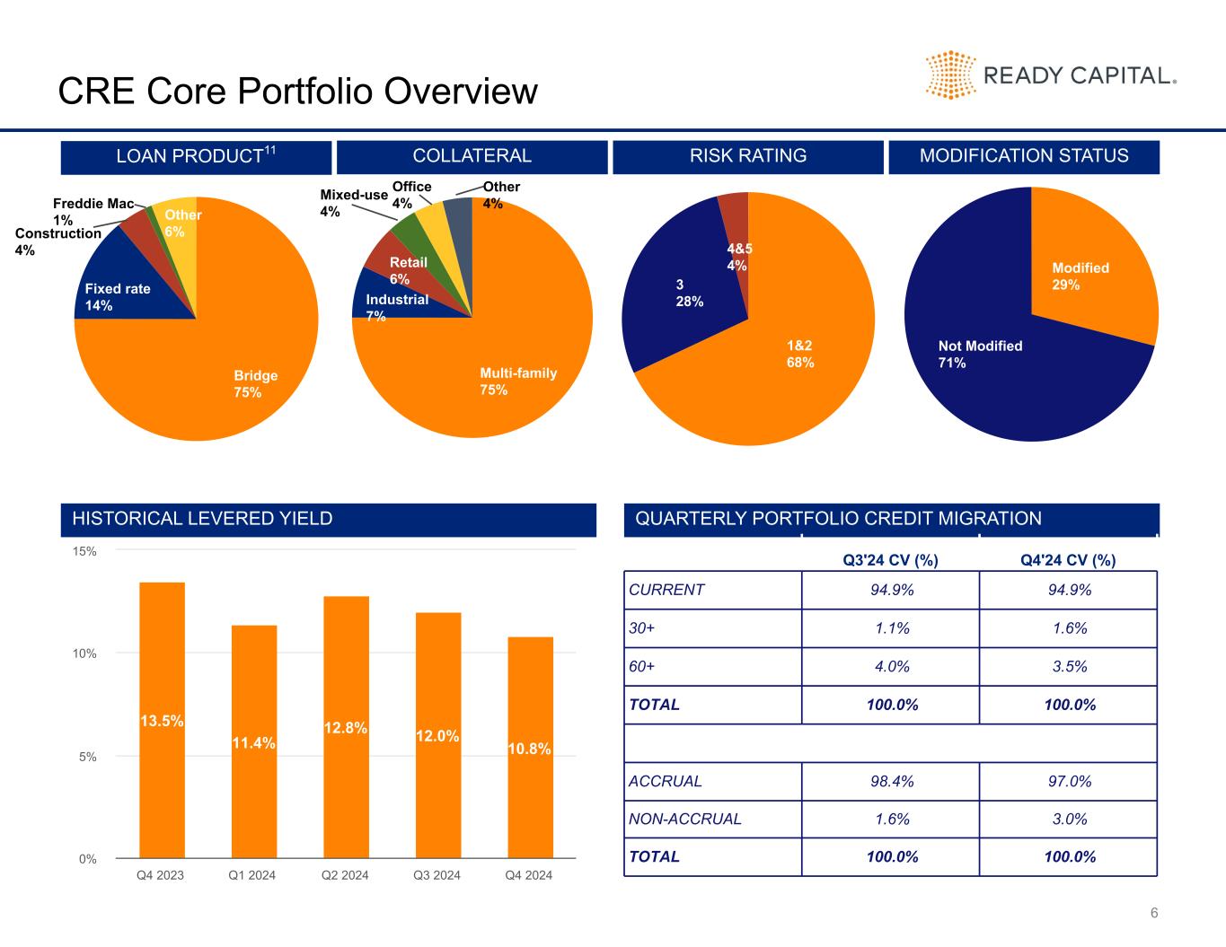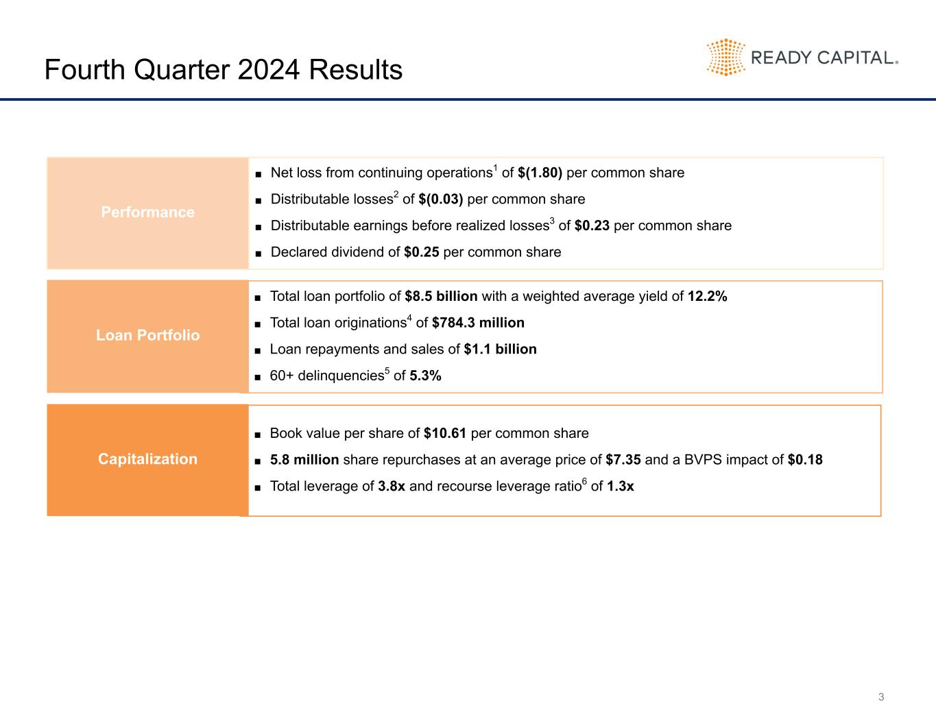 2 Disclaimer This presentation contains statements that constitute “forward-looking statements,” as such term is defined in Section 27A of the Securities Act of 1933, as amended, and Section 21E of the Securities Exchange Act of 1934, as amended, and such statements are intended to be covered by the safe harbor provided by the same. These statements are based on management’s current expectations and beliefs and are subject to a number of trends and uncertainties that could cause actual results to differ materially from those described in the forward-looking statements; Ready Capital Corporation (the “Company”) can give no assurance that its expectations will be attained. Factors that could cause actual results to differ materially from the Company’s expectations include those set forth in the Risk Factors section of the most recent Annual Report on Form 10-K filed with the SEC and other reports filed by the Company with the SEC, copies of which are available on the SEC’s website, www.sec.gov. The Company undertakes no obligation to update these statements for revisions or changes after the date of this release, except as required by law. This presentation includes certain non-GAAP financial measures, including Distributable earnings. These non-GAAP financial measures should be considered only as supplemental to, and not as superior to, financial measures in accordance with GAAP. Please refer to the Appendix for the most recent GAAP information. This presentation also contains market statistics and industry data which are subject to uncertainty and are not necessarily reflective of market conditions. These have been derived from third party sources and have not been independently verified by the Company or its affiliates. All material presented is compiled from sources believed to be reliable and current, but accuracy cannot be guaranteed. All data is as of December 31, 2024, unless otherwise noted.