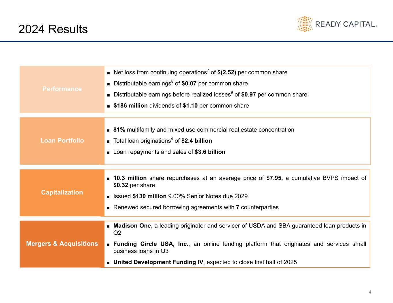3 Fourth Quarter 2024 Results ■ Net loss from continuing operations1 of $(1.80) per common share ■ Distributable losses2 of $(0.03) per common share ■ Distributable earnings before realized losses3 of $0.23 per common share ■ Declared dividend of $0.25 per common share Performance ■ Total loan portfolio of $8.5 billion with a weighted average yield of 12.2% ■ Total loan originations4 of $784.3 million ■ Loan repayments and sales of $1.1 billion ■ 60+ delinquencies5 of 5.3% Loan Portfolio Capitalization ■ Book value per share of $10.61 per common share ■ 5.8 million share repurchases at an average price of $7.35 and a BVPS impact of $0.18 ■ Total leverage of 3.8x and recourse leverage ratio6 of 1.3x