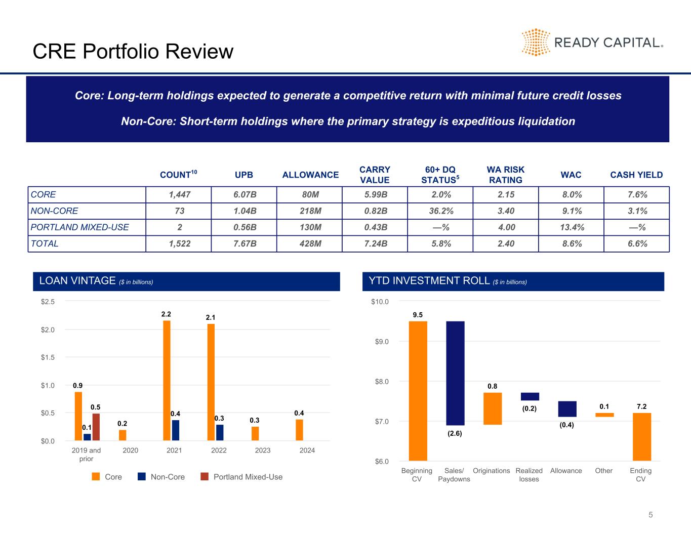 4 2024 Results ■ Net loss from continuing operations7 of $(2.52) per common share ■ Distributable earnings8 of $0.07 per common share ■ Distributable earnings before realized losses9 of $0.97 per common share ■ $186 million dividends of $1.10 per common share Performance ■ 81% multifamily and mixed use commercial real estate concentration ■ Total loan originations4 of $2.4 billion ■ Loan repayments and sales of $3.6 billion Loan Portfolio Capitalization ■ 10.3 million share repurchases at an average price of $7.95, a cumulative BVPS impact of $0.32 per share ■ Issued $130 million 9.00% Senior Notes due 2029 ■ Renewed secured borrowing agreements with 7 counterparties Mergers & Acquisitions ■ Madison One, a leading originator and servicer of USDA and SBA guaranteed loan products in Q2 ■ Funding Circle USA, Inc., an online lending platform that originates and services small business loans in Q3 ■ United Development Funding IV, expected to close first half of 2025