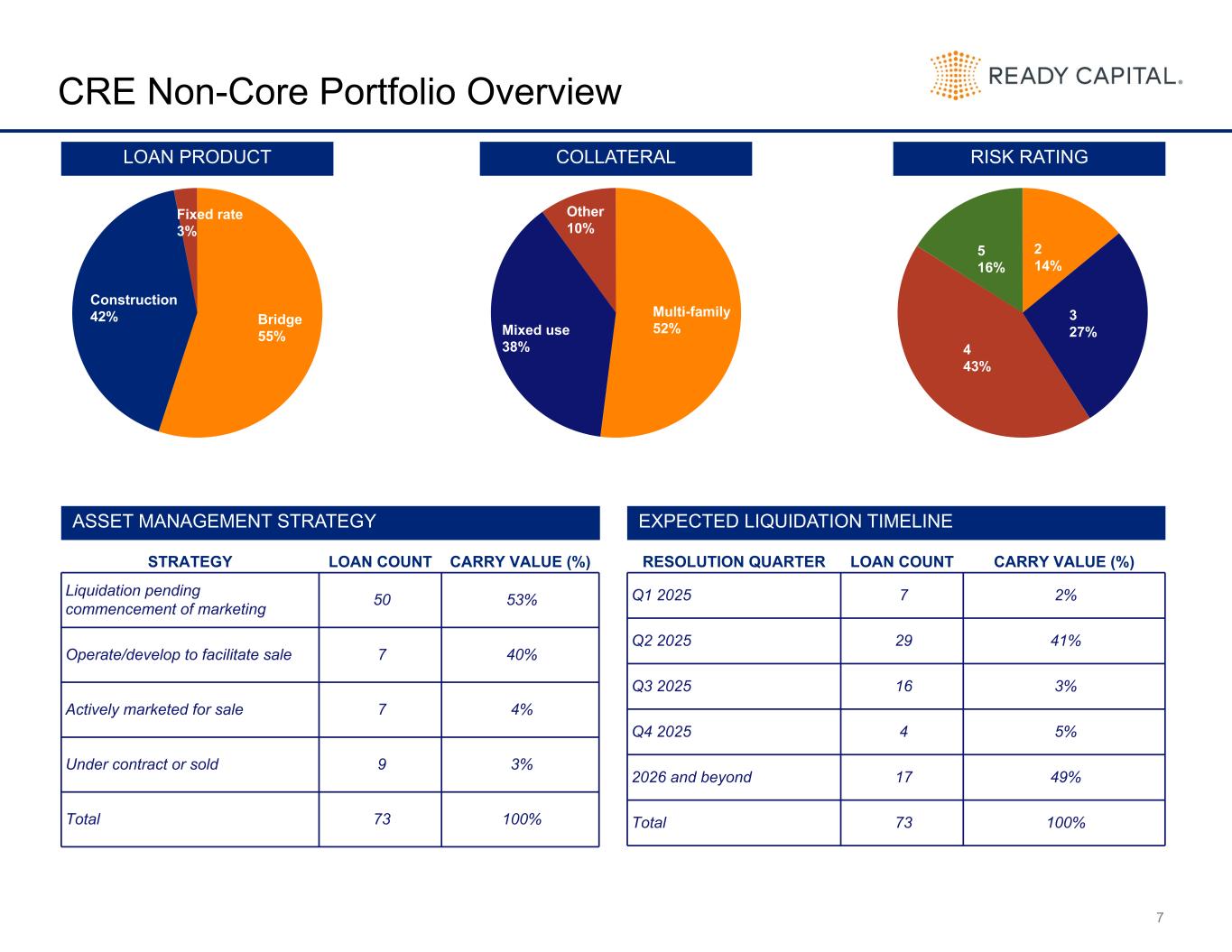 6 CRE Core Portfolio Overview LOAN PRODUCT11 RISK RATINGCOLLATERAL MODIFICATION STATUS HISTORICAL LEVERED YIELD 13.5% 11.4% 12.8% 12.0% 10.8% Q4 2023 Q1 2024 Q2 2024 Q3 2024 Q4 2024 0% 5% 10% 15% QUARTERLY PORTFOLIO CREDIT MIGRATION Bridge 75% Fixed rate 14% Construction 4% Freddie Mac 1% Other 6% Multi-family 75% Industrial 7% Retail 6% Office 4%Mixed-use 4% Other 4% 1&2 68% 3 28% 4&5 4% Modified 29% Not Modified 71% Q3'24 CV (%) Q4'24 CV (%) CURRENT 94.9% 94.9% 30+ 1.1% 1.6% 60+ 4.0% 3.5% TOTAL 100.0% 100.0% ACCRUAL 98.4% 97.0% NON-ACCRUAL 1.6% 3.0% TOTAL 100.0% 100.0%