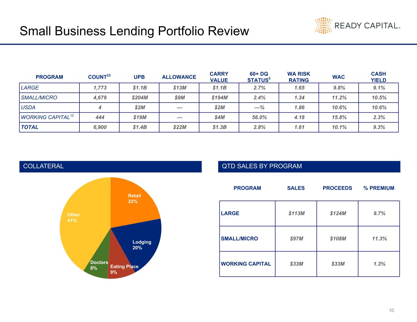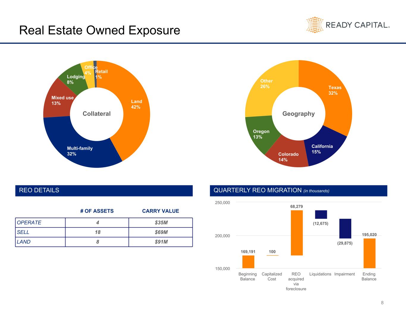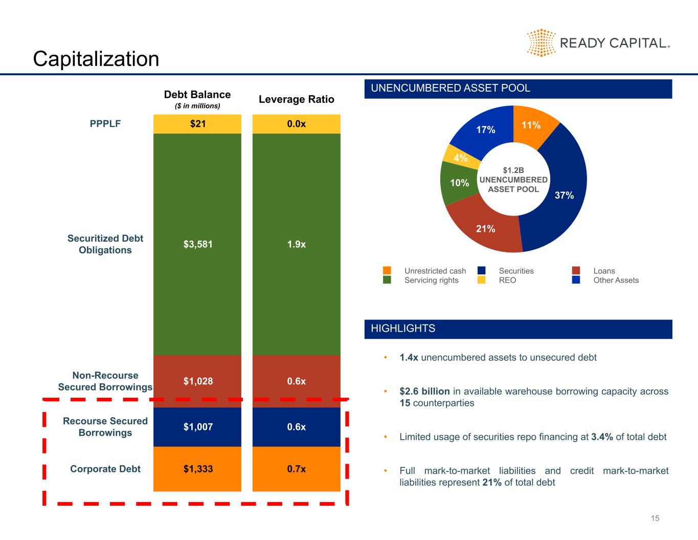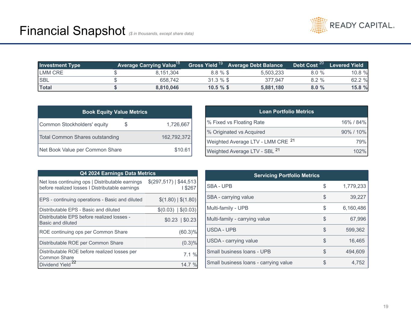 20 Balance Sheet by Quarter (in thousands) 12/31/2023 3/31/2024 6/30/2024 9/30/2024 12/31/2024 Assets Cash and cash equivalents $ 138,532 $ 166,004 $ 226,286 $ 181,315 $ 143,803 Restricted cash 30,063 24,915 29,971 31,331 30,560 Loans, net 4,020,160 3,400,481 3,444,879 3,555,928 3,378,149 Loans, held for sale 81,599 584,072 532,511 320,082 241,626 Mortgage-backed securities 27,436 29,546 30,174 30,780 31,006 Investment in unconsolidated joint ventures 133,321 132,730 134,602 146,397 161,561 Derivative instruments 2,404 15,448 14,382 11,032 7,963 Servicing rights 102,837 103,555 119,768 127,989 128,440 Real estate owned, held for sale 252,949 239,874 187,883 166,697 193,437 Other assets 300,175 315,772 379,413 412,238 362,486 Assets of consolidated VIEs 6,897,145 6,591,834 6,250,570 5,794,720 5,175,295 Assets held for sale 454,596 439,301 423,894 474,535 287,595 Total Assets $ 12,441,217 $ 12,043,532 $ 11,774,333 $ 11,253,044 $ 10,141,921 Liabilities Secured borrowings 2,102,075 2,198,272 2,311,969 2,184,280 2,035,176 Securitized debt obligations of consolidated VIEs, net 5,068,453 4,769,057 4,407,241 3,960,185 3,580,513 Senior secured notes and Corporate debt, net 1,110,035 1,111,654 1,184,311 1,206,159 1,333,112 Guaranteed loan financing 844,540 814,784 782,345 742,631 691,118 Contingent consideration 7,628 — 3,926 2,007 573 Derivative instruments 212 593 2,638 2,085 352 Dividends payable 54,289 53,908 53,119 44,602 43,168 Loan participations sold 62,944 73,749 89,532 99,737 95,578 Due to third parties 3,641 3,401 1,995 1,239 1,442 Accounts payable and other accrued liabilities 207,481 193,896 204,766 279,014 188,051 Liabilities held for sale 333,157 315,975 332,265 392,697 228,735 Total Liabilities $ 9,794,455 $ 9,535,289 $ 9,374,107 $ 8,914,636 $ 8,197,818 Preferred stock Series C 8,361 8,361 8,361 8,361 8,361 Stockholders’ Equity Preferred stock 111,378 111,378 111,378 111,378 111,378 Common stock 17 17 17 17 17 Additional paid-in capital 2,321,989 2,307,303 2,287,684 2,292,229 2,250,291 Retained earnings (deficit) 124,413 (3,546) (92,319) (146,003) (505,089) Accumulated other comprehensive loss (17,860) (12,335) (13,880) (24,232) (18,552) Total Ready Capital Corporation equity 2,539,937 2,402,817 2,292,880 2,233,389 1,838,045 Non-controlling interests 98,464 97,065 98,985 96,658 97,697 Total Stockholders’ Equity $ 2,638,401 $ 2,499,882 $ 2,391,865 $ 2,330,047 $ 1,935,742 Total Liabilities, Redeemable Preferred Stock, and Stockholders’ Equity $ 12,441,217 $ 12,043,532 $ 11,774,333 $ 11,253,044 $ 10,141,921 Book Value per Share $ 14.10 $ 13.44 $ 12.97 $ 12.59 $ 10.61