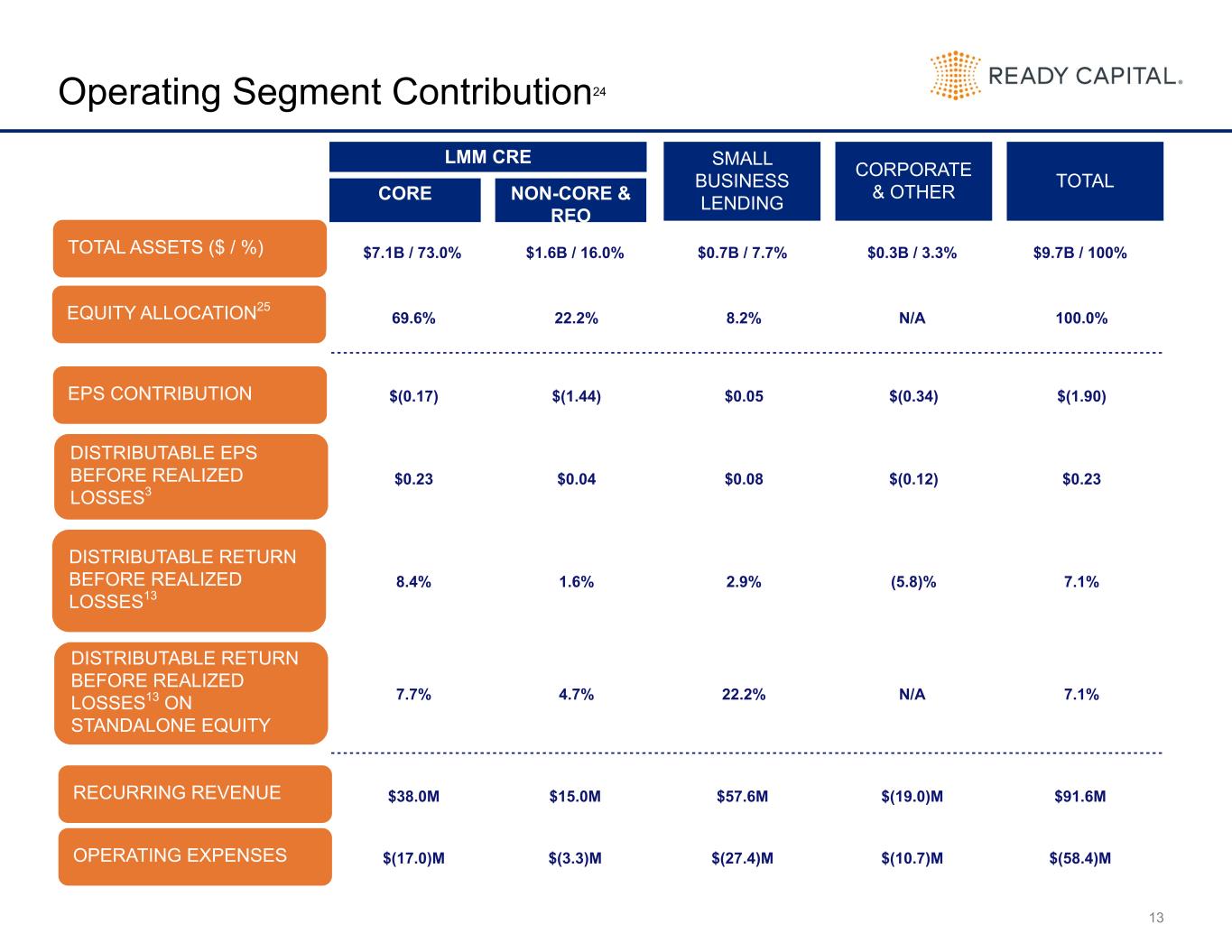 12 Earnings Profile Balance (in thousands) Annualized ROE Contribution Recurring Revenue: Net interest income $ 50,054 9.9% Gain on sale, net of variable costs 20,940 4.1% Other recurring revenue 20,586 4.1% Total Recurring Revenue $ 91,580 18.0% Operating Expenses: Employee compensation & benefits $ (18,473) (3.6)% Fixed operating costs (23,940) (4.7)% Servicing expenses (11,921) (2.3)% Investment advisory fees (5,518) (1.1)% Tax (560) (0.1)% Total Operating Costs and Tax $ (60,412) (11.9)% Net income from normal operations, net of tax $ 31,168 6.1% Other Items included in Earnings: Realized losses $ (51,688) (10.2)% CECL & Valuation allowances (275,684) (54.3)% Discontinued operations (22,936) (4.5)% Mark-to-market (12,947) (2.6)% Non-cash compensation (5,460) (1.1)% Other nonrecurring expenses (2,825) (0.6)% Tax 23,622 4.7% Total Other Items included in Earnings $ (347,918) (68.5)% Net income $ (316,750) (62.4)% Current Pay Interest: $155M Accrued Interest: $21M Paid in Kind Interest: $21M Accretion of Discount: $7M Interest expense: ($154M) Primary/Special Servicing Fees: $5M Advances: $5M Other Servicing Expenses: $2M Gain on sale , net of variable costs: SBA 7(a): $14M Freddie Mac: $3M USDA: $2M Business Loans: $2M Servicing Income: $4M Income from Unconsolidated JV's: $1M Rental Income: $1M Other Fee Income: $7M Other Income: $8M
