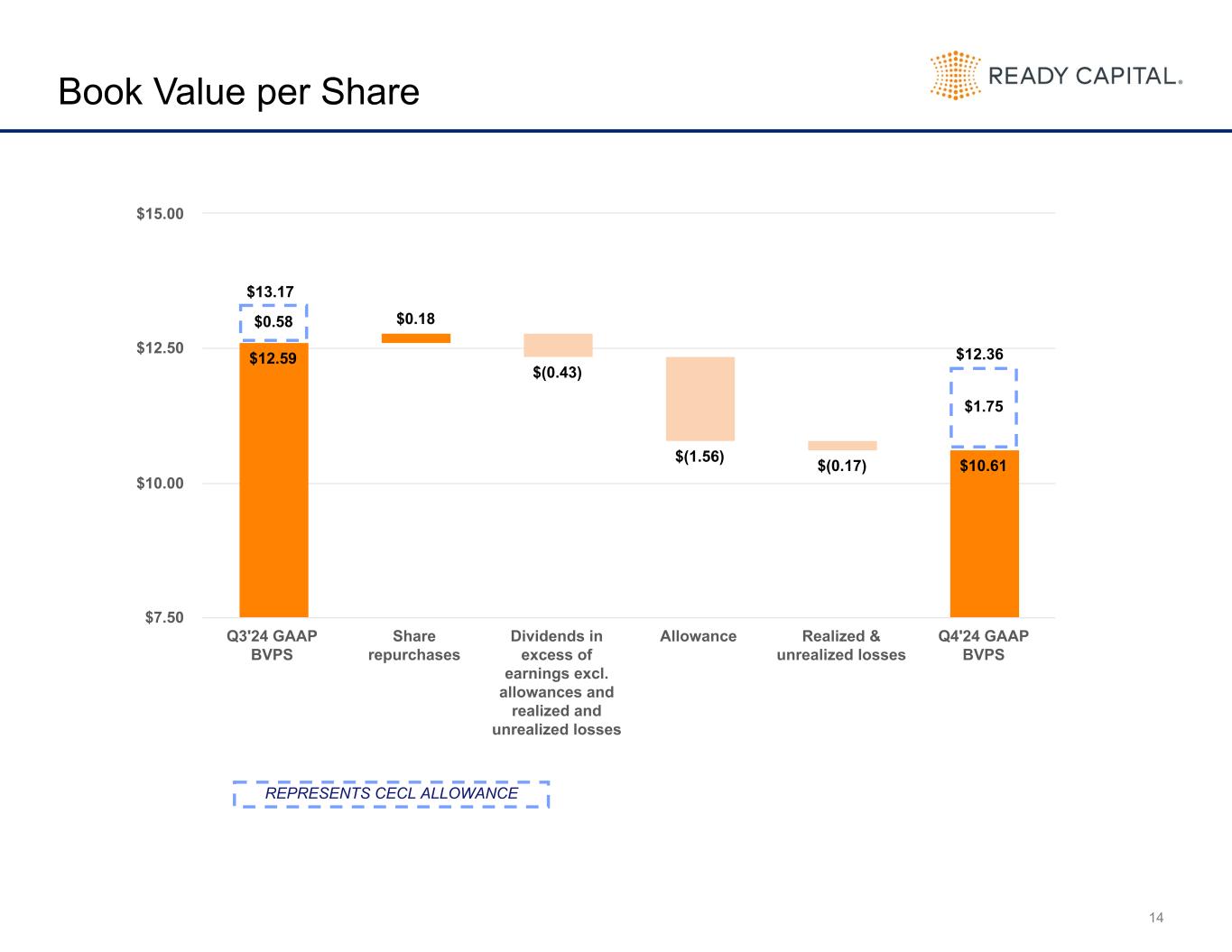 14 Book Value per Share $12.59 $0.18 $(0.43) $(1.56) $(0.17) $10.61 Q3'24 GAAP BVPS Share repurchases Dividends in excess of earnings excl. allowances and realized and unrealized losses Allowance Realized & unrealized losses Q4'24 GAAP BVPS $7.50 $10.00 $12.50 $15.00 $0.58 $13.17 $12.36 $1.75 REPRESENTS CECL ALLOWANCE