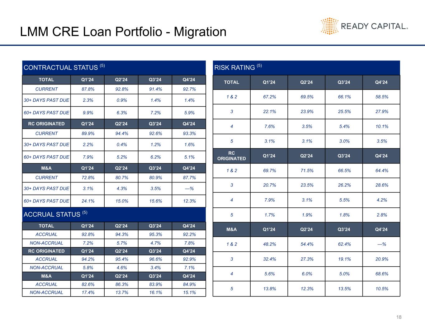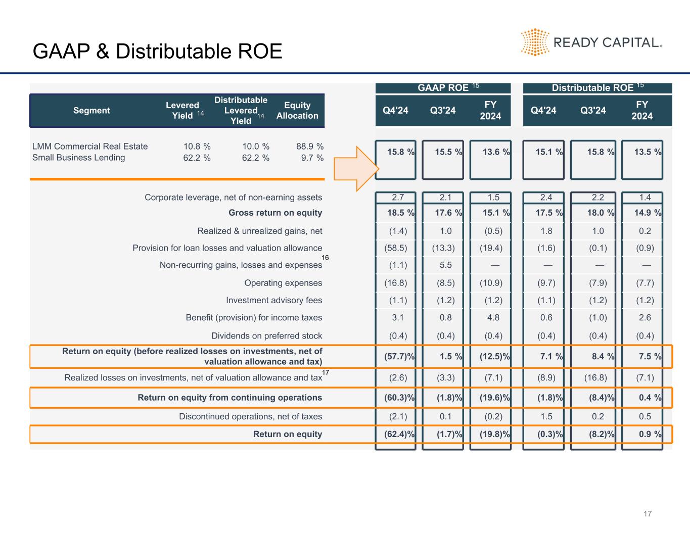 GAAP ROE Distributable ROE Segment Levered Yield Distributable Levered Yield Equity Allocation Q4'24 Q3'24 FY 2024 Q4'24 Q3'24 FY 2024 LMM Commercial Real Estate 10.8 % 10.0 % 88.9 % 15.8 % 15.5 % 13.6 % 15.1 % 15.8 % 13.5 %Small Business Lending 62.2 % 62.2 % 9.7 % Corporate leverage, net of non-earning assets 2.7 2.1 1.5 2.4 2.2 1.4 Gross return on equity 18.5 % 17.6 % 15.1 % 17.5 % 18.0 % 14.9 % Realized & unrealized gains, net (1.4) 1.0 (0.5) 1.8 1.0 0.2 Provision for loan losses and valuation allowance (58.5) (13.3) (19.4) (1.6) (0.1) (0.9) Non-recurring gains, losses and expenses (1.1) 5.5 — — — — Operating expenses (16.8) (8.5) (10.9) (9.7) (7.9) (7.7) Investment advisory fees (1.1) (1.2) (1.2) (1.1) (1.2) (1.2) Benefit (provision) for income taxes 3.1 0.8 4.8 0.6 (1.0) 2.6 Dividends on preferred stock (0.4) (0.4) (0.4) (0.4) (0.4) (0.4) Return on equity (before realized losses on investments, net of valuation allowance and tax) (57.7) % 1.5 % (12.5) % 7.1 % 8.4 % 7.5 % Realized losses on investments, net of valuation allowance and tax (2.6) (3.3) (7.1) (8.9) (16.8) (7.1) Return on equity from continuing operations (60.3) % (1.8) % (19.6) % (1.8) % (8.4) % 0.4 % Discontinued operations, net of taxes (2.1) 0.1 (0.2) 1.5 0.2 0.5 Return on equity (62.4) % (1.7) % (19.8) % (0.3) % (8.2) % 0.9 % 17 GAAP & Distributable ROE 14 14 15 15 16 17