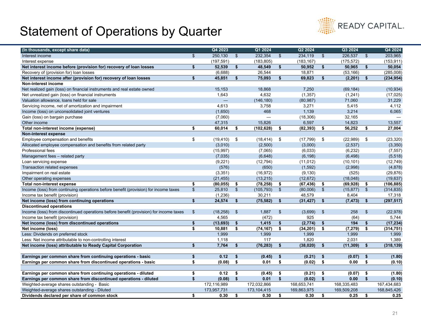 21 Statement of Operations by Quarter (In thousands, except share data) Q4 2023 Q1 2024 Q2 2024 Q3 2024 Q4 2024 Interest income $ 250,130 $ 232,354 $ 234,119 $ 226,537 $ 203,965 Interest expense (197,591) (183,805) (183,167) (175,572) (153,911) Net interest income before (provision for) recovery of loan losses $ 52,539 $ 48,549 $ 50,952 $ 50,965 $ 50,054 Recovery of (provision for) loan losses (6,688) 26,544 18,871 (53,166) (285,008) Net interest income after (provision for) recovery of loan losses $ 45,851 $ 75,093 $ 69,823 $ (2,201) $ (234,954) Non-interest income Net realized gain (loss) on financial instruments and real estate owned 15,153 18,868 7,250 (69,184) (10,934) Net unrealized gain (loss) on financial instruments 1,643 4,632 (1,357) (1,241) (17,025) Valuation allowance, loans held for sale — (146,180) (80,987) 71,060 31,229 Servicing income, net of amortization and impairment 4,613 3,758 3,271 5,415 4,112 Income (loss) on unconsolidated joint ventures (1,650) 468 1,139 3,214 6,065 Gain (loss) on bargain purchase (7,060) — (18,306) 32,165 — Other income 47,315 15,826 6,597 14,823 13,557 Total non-interest income (expense) $ 60,014 $ (102,628) $ (82,393) $ 56,252 $ 27,004 Non-interest expense Employee compensation and benefits $ (19,410) $ (18,414) $ (17,799) $ (22,989) $ (23,320) Allocated employee compensation and benefits from related party (3,010) (2,500) (3,000) (2,537) (3,350) Professional fees (15,997) (7,065) (6,033) (6,232) (7,557) Management fees – related party (7,035) (6,648) (6,198) (6,498) (5,518) Loan servicing expense (9,221) (12,794) (11,012) (10,101) (12,749) Transaction related expenses (576) (650) (1,592) (2,998) (4,878) Impairment on real estate (3,351) (16,972) (9,130) (525) (29,876) Other operating expenses (21,455) (13,215) (12,672) (18,048) (19,637) Total non-interest expense $ (80,055) $ (78,258) $ (67,436) $ (69,928) $ (106,885) Income (loss) from continuing operations before benefit (provision) for income taxes $ 25,810 $ (105,793) $ (80,006) $ (15,877) $ (314,835) Income tax benefit (provision) (1,236) 30,211 48,579 8,404 17,318 Net income (loss) from continuing operations $ 24,574 $ (75,582) $ (31,427) $ (7,473) $ (297,517) Discontinued operations Income (loss) from discontinued operations before benefit (provision) for income taxes $ (18,258) $ 1,887 $ (3,699) $ 258 $ (22,978) Income tax benefit (provision) 4,565 (472) 925 (64) 5,744 Net income (loss) from discontinued operations $ (13,693) $ 1,415 $ (2,774) $ 194 $ (17,234) Net income (loss) $ 10,881 $ (74,167) $ (34,201) $ (7,279) $ (314,751) Less: Dividends on preferred stock 1,999 1,999 1,999 1,999 1,999 Less: Net income attributable to non-controlling interest 1,118 117 1,820 2,031 1,389 Net income (loss) attributable to Ready Capital Corporation $ 7,764 $ (76,283) $ (38,020) $ (11,309) $ (318,139) Earnings per common share from continuing operations - basic $ 0.12 $ (0.45) $ (0.21) $ (0.07) $ (1.80) Earnings per common share from discontinued operations - basic $ (0.08) $ 0.01 $ (0.02) $ 0.00 $ (0.10) Earnings per common share from continuing operations - diluted $ 0.12 $ (0.45) $ (0.21) $ (0.07) $ (1.80) Earnings per common share from discontinued operations - diluted $ (0.08) $ 0.01 $ (0.02) $ 0.00 $ (0.10) Weighted-average shares outstanding - Basic 172,116,989 172,032,866 168,653,741 168,335,483 167,434,683 Weighted-average shares outstanding - Diluted 173,957,731 173,104,415 169,863,975 169,509,208 168,845,426 Dividends declared per share of common stock $ 0.30 $ 0.30 $ 0.30 $ 0.25 $ 0.25