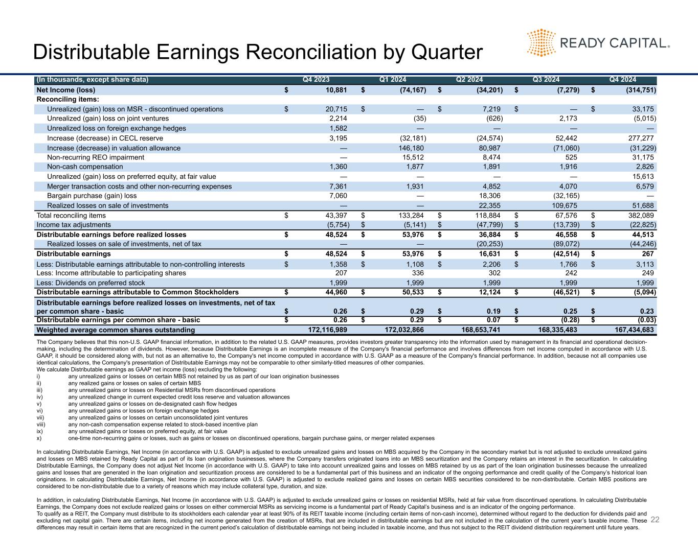 22 Distributable Earnings Reconciliation by Quarter The Company believes that this non-U.S. GAAP financial information, in addition to the related U.S. GAAP measures, provides investors greater transparency into the information used by management in its financial and operational decision- making, including the determination of dividends. However, because Distributable Earnings is an incomplete measure of the Company's financial performance and involves differences from net income computed in accordance with U.S. GAAP, it should be considered along with, but not as an alternative to, the Company's net income computed in accordance with U.S. GAAP as a measure of the Company's financial performance. In addition, because not all companies use identical calculations, the Company's presentation of Distributable Earnings may not be comparable to other similarly-titled measures of other companies. We calculate Distributable earnings as GAAP net income (loss) excluding the following: i) any unrealized gains or losses on certain MBS not retained by us as part of our loan origination businesses ii) any realized gains or losses on sales of certain MBS iii) any unrealized gains or losses on Residential MSRs from discontinued operations iv) any unrealized change in current expected credit loss reserve and valuation allowances v) any unrealized gains or losses on de-designated cash flow hedges vi) any unrealized gains or losses on foreign exchange hedges vii) any unrealized gains or losses on certain unconsolidated joint ventures viii) any non-cash compensation expense related to stock-based incentive plan ix) any unrealized gains or losses on preferred equity, at fair value x) one-time non-recurring gains or losses, such as gains or losses on discontinued operations, bargain purchase gains, or merger related expenses In calculating Distributable Earnings, Net Income (in accordance with U.S. GAAP) is adjusted to exclude unrealized gains and losses on MBS acquired by the Company in the secondary market but is not adjusted to exclude unrealized gains and losses on MBS retained by Ready Capital as part of its loan origination businesses, where the Company transfers originated loans into an MBS securitization and the Company retains an interest in the securitization. In calculating Distributable Earnings, the Company does not adjust Net Income (in accordance with U.S. GAAP) to take into account unrealized gains and losses on MBS retained by us as part of the loan origination businesses because the unrealized gains and losses that are generated in the loan origination and securitization process are considered to be a fundamental part of this business and an indicator of the ongoing performance and credit quality of the Company’s historical loan originations. In calculating Distributable Earnings, Net Income (in accordance with U.S. GAAP) is adjusted to exclude realized gains and losses on certain MBS securities considered to be non-distributable. Certain MBS positions are considered to be non-distributable due to a variety of reasons which may include collateral type, duration, and size. In addition, in calculating Distributable Earnings, Net Income (in accordance with U.S. GAAP) is adjusted to exclude unrealized gains or losses on residential MSRs, held at fair value from discontinued operations. In calculating Distributable Earnings, the Company does not exclude realized gains or losses on either commercial MSRs as servicing income is a fundamental part of Ready Capital’s business and is an indicator of the ongoing performance. To qualify as a REIT, the Company must distribute to its stockholders each calendar year at least 90% of its REIT taxable income (including certain items of non-cash income), determined without regard to the deduction for dividends paid and excluding net capital gain. There are certain items, including net income generated from the creation of MSRs, that are included in distributable earnings but are not included in the calculation of the current year’s taxable income. These differences may result in certain items that are recognized in the current period’s calculation of distributable earnings not being included in taxable income, and thus not subject to the REIT dividend distribution requirement until future years. (In thousands, except share data) Q4 2023 Q1 2024 Q2 2024 Q3 2024 Q4 2024 Net Income (loss) $ 10,881 $ (74,167) $ (34,201) $ (7,279) $ (314,751) Reconciling items: Unrealized (gain) loss on MSR - discontinued operations $ 20,715 $ — $ 7,219 $ — $ 33,175 Unrealized (gain) loss on joint ventures 2,214 (35) (626) 2,173 (5,015) Unrealized loss on foreign exchange hedges 1,582 — — — — Increase (decrease) in CECL reserve 3,195 (32,181) (24,574) 52,442 277,277 Increase (decrease) in valuation allowance — 146,180 80,987 (71,060) (31,229) Non-recurring REO impairment — 15,512 8,474 525 31,175 Non-cash compensation 1,360 1,877 1,891 1,916 2,826 Unrealized (gain) loss on preferred equity, at fair value — — — — 15,613 Merger transaction costs and other non-recurring expenses 7,361 1,931 4,852 4,070 6,579 Bargain purchase (gain) loss 7,060 — 18,306 (32,165) — Realized losses on sale of investments — — 22,355 109,675 51,688 Total reconciling items $ 43,397 $ 133,284 $ 118,884 $ 67,576 $ 382,089 Income tax adjustments (5,754) $ (5,141) $ (47,799) $ (13,739) $ (22,825) Distributable earnings before realized losses $ 48,524 $ 53,976 $ 36,884 $ 46,558 $ 44,513 Realized losses on sale of investments, net of tax — — (20,253) (89,072) (44,246) Distributable earnings $ 48,524 $ 53,976 $ 16,631 $ (42,514) $ 267 Less: Distributable earnings attributable to non-controlling interests $ 1,358 $ 1,108 $ 2,206 $ 1,766 $ 3,113 Less: Income attributable to participating shares 207 336 302 242 249 Less: Dividends on preferred stock 1,999 1,999 1,999 1,999 1,999 Distributable earnings attributable to Common Stockholders $ 44,960 $ 50,533 $ 12,124 $ (46,521) 