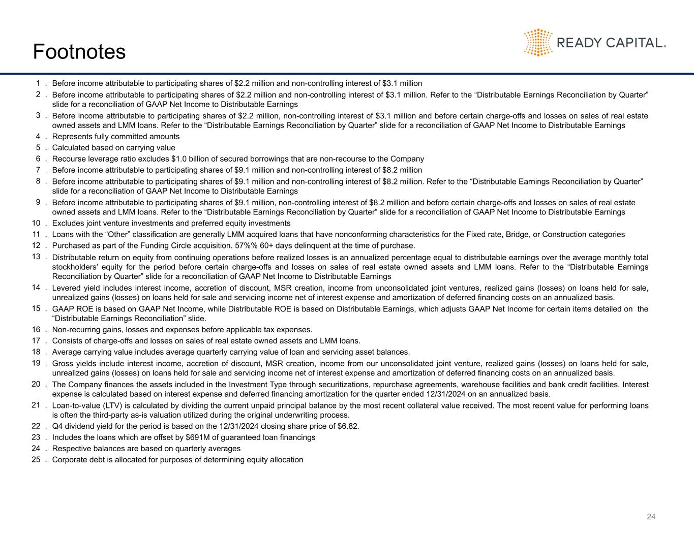 24 Footnotes 1 . Before income attributable to participating shares of $2.2 million and non-controlling interest of $3.1 million 2 . Before income attributable to participating shares of $2.2 million and non-controlling interest of $3.1 million. Refer to the “Distributable Earnings Reconciliation by Quarter” slide for a reconciliation of GAAP Net Income to Distributable Earnings 3 . Before income attributable to participating shares of $2.2 million, non-controlling interest of $3.1 million and before certain charge-offs and losses on sales of real estate owned assets and LMM loans. Refer to the “Distributable Earnings Reconciliation by Quarter” slide for a reconciliation of GAAP Net Income to Distributable Earnings 4 . Represents fully committed amounts 5 . Calculated based on carrying value 6 . Recourse leverage ratio excludes $1.0 billion of secured borrowings that are non-recourse to the Company 7 . Before income attributable to participating shares of $9.1 million and non-controlling interest of $8.2 million 8 . Before income attributable to participating shares of $9.1 million and non-controlling interest of $8.2 million. Refer to the “Distributable Earnings Reconciliation by Quarter” slide for a reconciliation of GAAP Net Income to Distributable Earnings 9 . Before income attributable to participating shares of $9.1 million, non-controlling interest of $8.2 million and before certain charge-offs and losses on sales of real estate owned assets and LMM loans. Refer to the “Distributable Earnings Reconciliation by Quarter” slide for a reconciliation of GAAP Net Income to Distributable Earnings 10 . Excludes joint venture investments and preferred equity investments 11 . Loans with the “Other” classification are generally LMM acquired loans that have nonconforming characteristics for the Fixed rate, Bridge, or Construction categories 12 . Purchased as part of the Funding Circle acquisition. 57%% 60+ days delinquent at the time of purchase. 13 . Distributable return on equity from continuing operations before realized losses is an annualized percentage equal to distributable earnings over the average monthly total stockholders’ equity for the period before certain charge-offs and losses on sales of real estate owned assets and LMM loans. Refer to the “Distributable Earnings Reconciliation by Quarter” slide for a reconciliation of GAAP Net Income to Distributable Earnings 14 . Levered yield includes interest income, accretion of discount, MSR creation, income from unconsolidated joint ventures, realized gains (losses) on loans held for sale, unrealized gains (losses) on loans held for sale and servicing income net of interest expense and amortization of deferred financing costs on an annualized basis. 15 . GAAP ROE is based on GAAP Net Income, while Distributable ROE is based on Distributable Earnings, which adjusts GAAP Net Income for certain items detailed on the “Distributable Earnings Reconciliation” slide. 16 . Non-recurring gains, losses and expenses before applicable tax expenses. 17 . Consists of charge-offs and losses on sales of real estate owned assets and LMM loans. 18 . Average carrying value includes average quarterly carrying value of loan and servicing asset balances. 19 . Gross yields include interest income, accretion of discount, MSR creation, income from our unconsolidated joint venture, realized gains (losses) on loans held for sale, unrealized gains (losses) on loans held for sale and servicing income net of interest expense and amortization of deferred financing costs on an annualized basis. 20 . The Company finances the assets included in the Investment Type through securitizations, repurchase agreements, warehouse facilities and bank credit facilities. Interest expense is calculated based on interest expense and deferred financing amortization for the quarter ended 12/31/2024 on an annualized basis. 21 . Loan-to-value (LTV) is calculated by dividing the current unpaid principal balance by the most recent collateral value received. The most recent value for performing loans is often the third-party as-is valuation utilized during the original underwriting process. 22 . Q4 dividend yield for the period is based on the 12/31/2024 closing share price of $6.82. 23 . Includes the loans which are offset by $691M of guaranteed loan financings 24 . Respective balances are based on quarterly averages 25 . Corporate debt is allocated for purposes of determining equity allocation