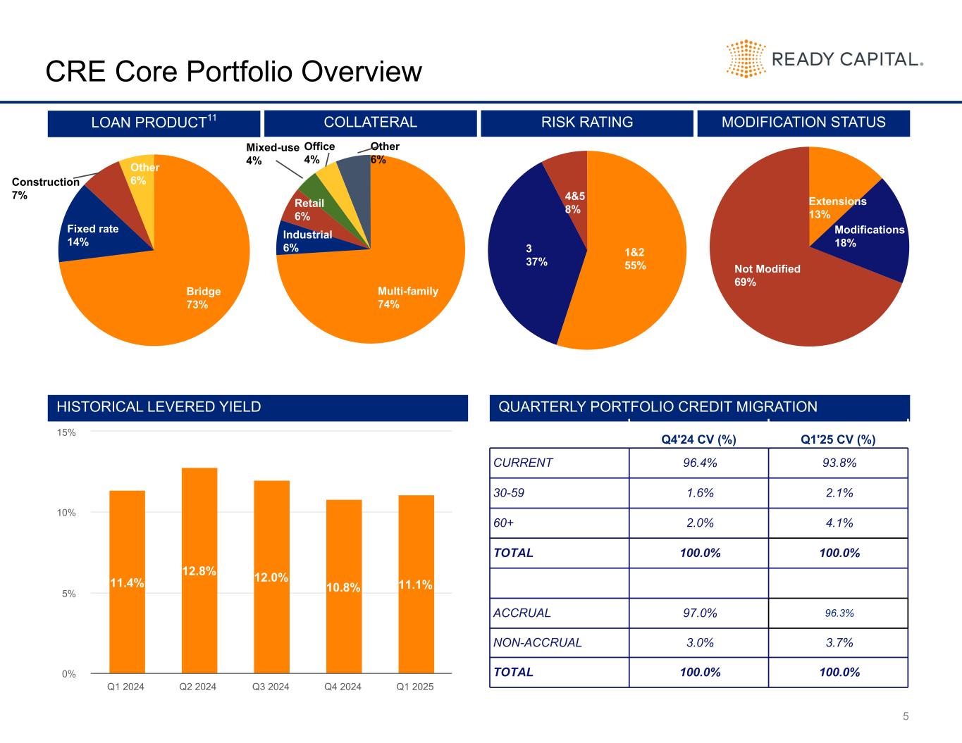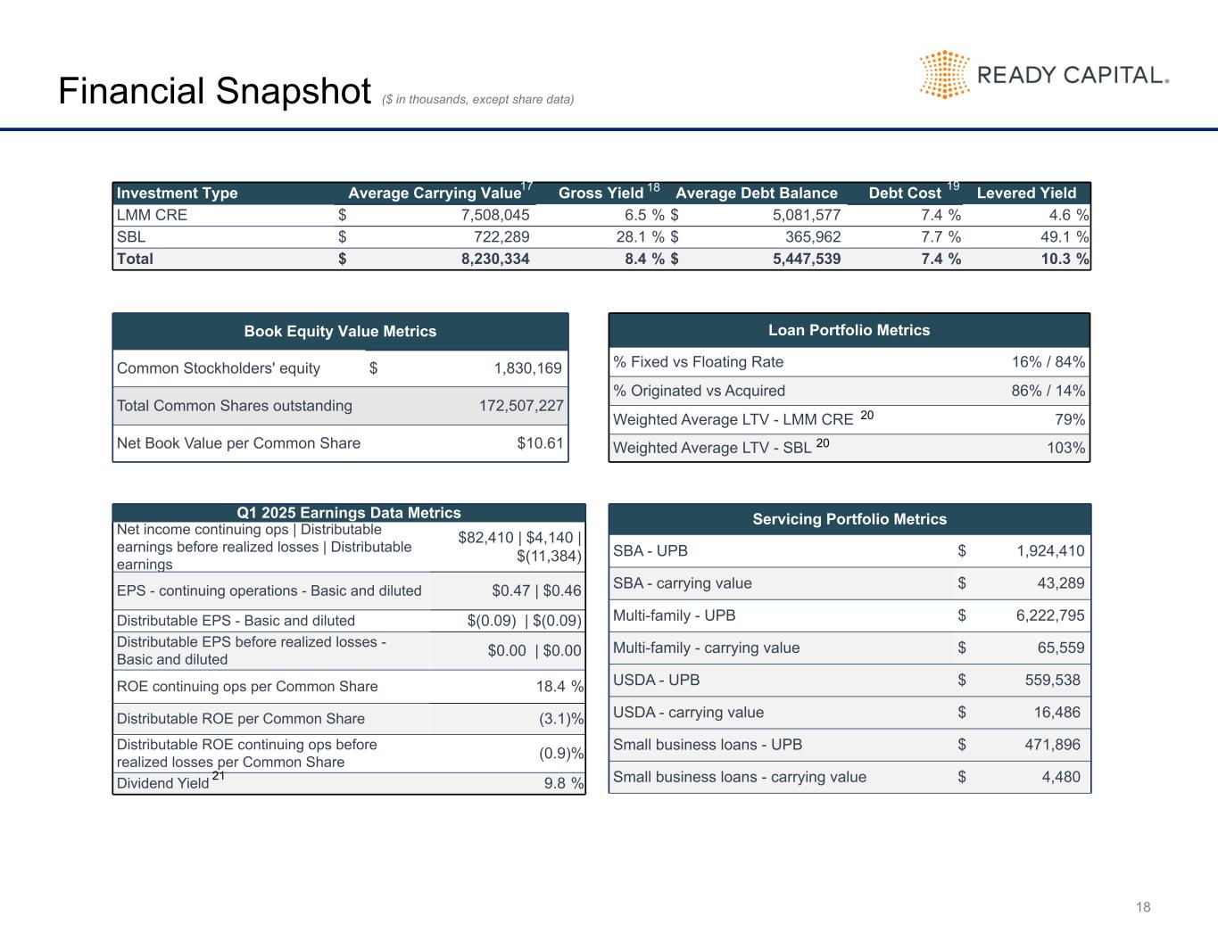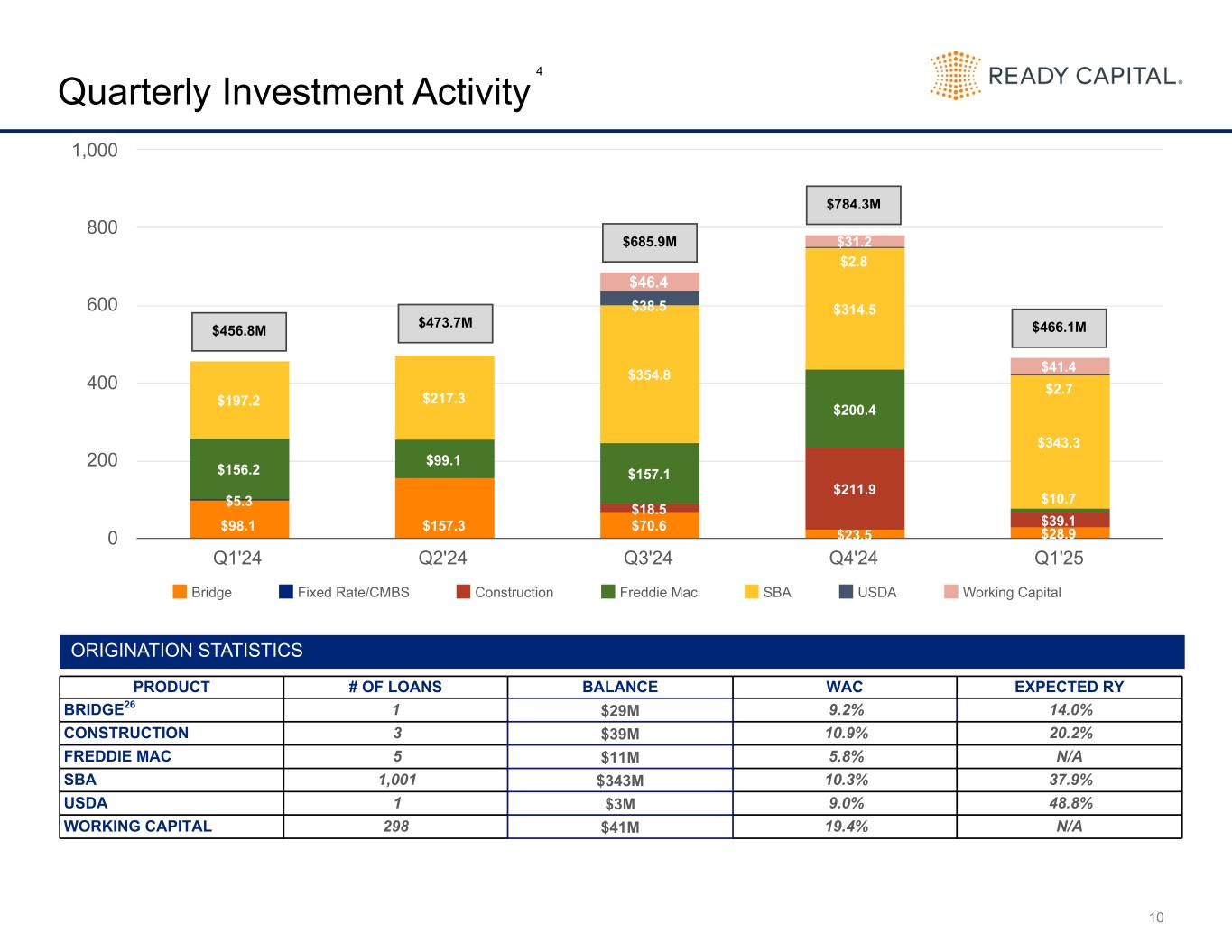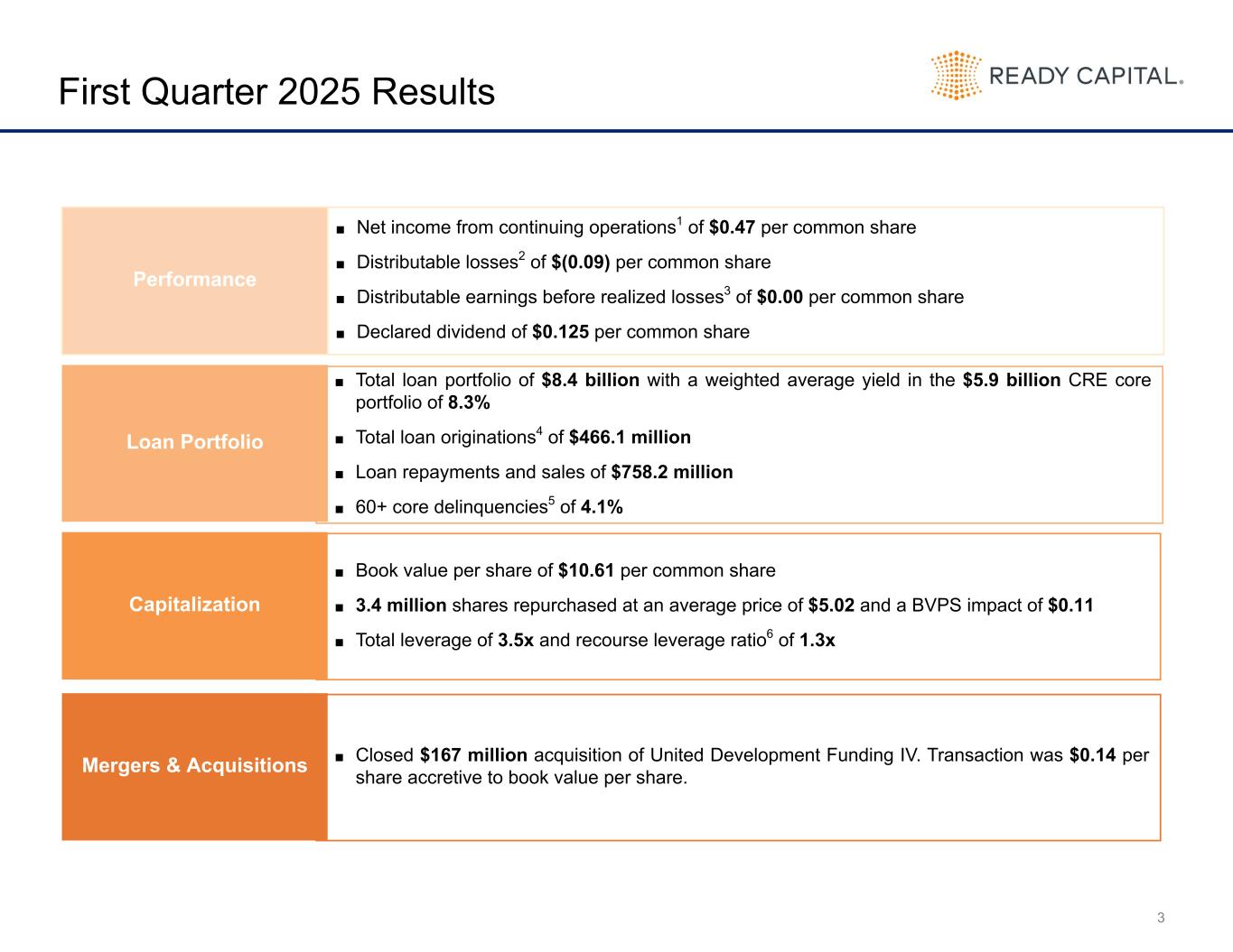 2 Disclaimer This presentation contains statements that constitute “forward-looking statements,” as such term is defined in Section 27A of the Securities Act of 1933, as amended, and Section 21E of the Securities Exchange Act of 1934, as amended, and such statements are intended to be covered by the safe harbor provided by the same. These statements are based on management’s current expectations and beliefs and are subject to a number of trends and uncertainties that could cause actual results to differ materially from those described in the forward-looking statements; Ready Capital Corporation (the “Company”) can give no assurance that its expectations will be attained. Factors that could cause actual results to differ materially from the Company’s expectations include those set forth in the Risk Factors section of the most recent Annual Report on Form 10-K filed with the SEC and other reports filed by the Company with the SEC, copies of which are available on the SEC’s website, www.sec.gov. The Company undertakes no obligation to update these statements for revisions or changes after the date of this release, except as required by law. This presentation includes certain non-GAAP financial measures, including Distributable earnings. These non-GAAP financial measures should be considered only as supplemental to, and not as superior to, financial measures in accordance with GAAP. Please refer to the Appendix for the most recent GAAP information. This presentation also contains market statistics and industry data which are subject to uncertainty and are not necessarily reflective of market conditions. These have been derived from third party sources and have not been independently verified by the Company or its affiliates. All material presented is compiled from sources believed to be reliable and current, but accuracy cannot be guaranteed. All data is as of March 31, 2025, unless otherwise noted.