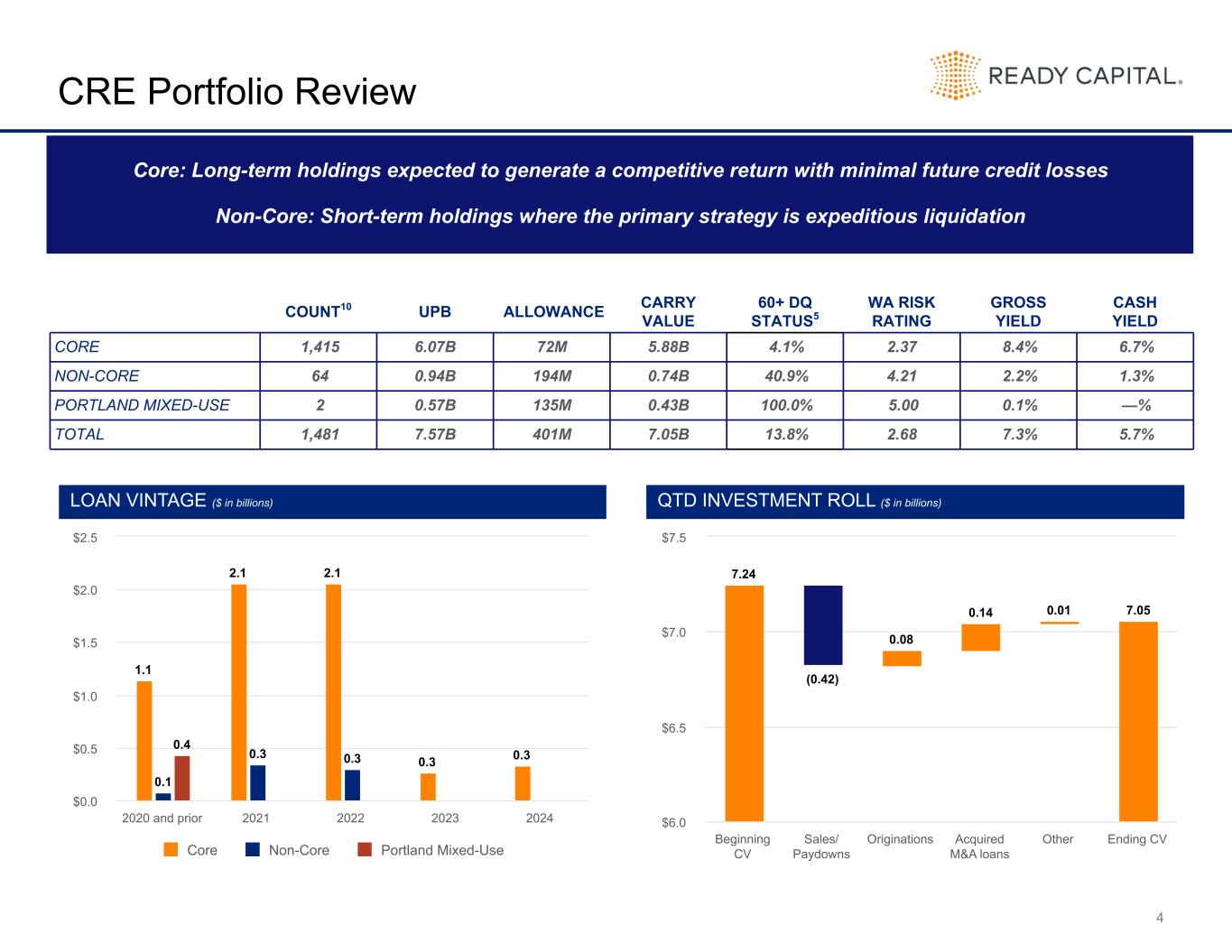 3 First Quarter 2025 Results ■ Net income from continuing operations1 of $0.47 per common share ■ Distributable losses2 of $(0.09) per common share ■ Distributable earnings before realized losses3 of $0.00 per common share ■ Declared dividend of $0.125 per common share Performance ■ Total loan portfolio of $8.4 billion with a weighted average yield in the $5.9 billion CRE core portfolio of 8.3% ■ Total loan originations4 of $466.1 million ■ Loan repayments and sales of $758.2 million ■ 60+ core delinquencies5 of 4.1% Loan Portfolio Capitalization ■ Book value per share of $10.61 per common share ■ 3.4 million shares repurchased at an average price of $5.02 and a BVPS impact of $0.11 ■ Total leverage of 3.5x and recourse leverage ratio6 of 1.3x Mergers & Acquisitions ■ Closed $167 million acquisition of United Development Funding IV. Transaction was $0.14 per share accretive to book value per share.