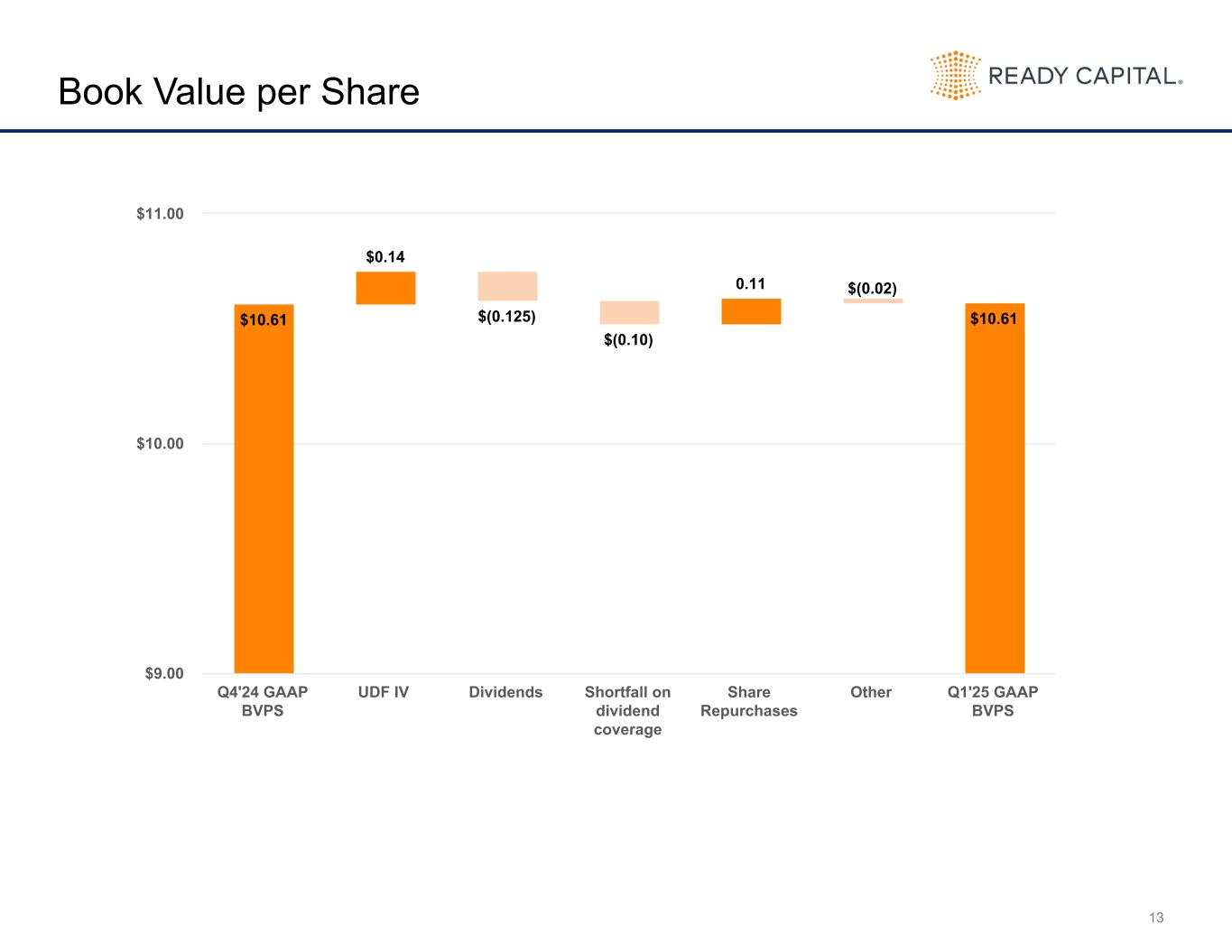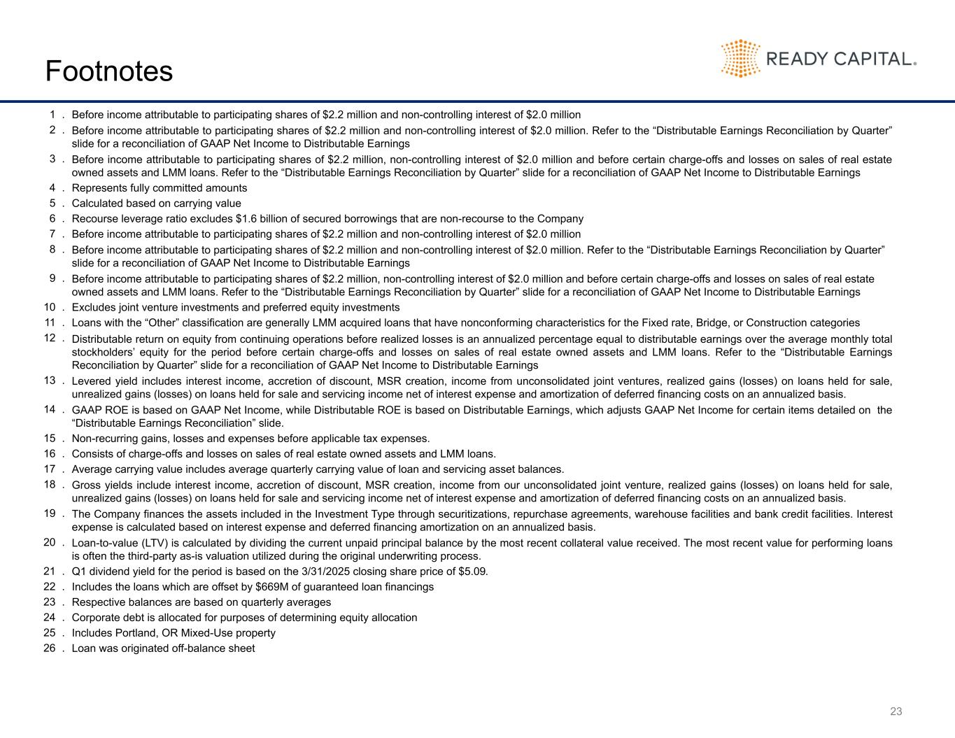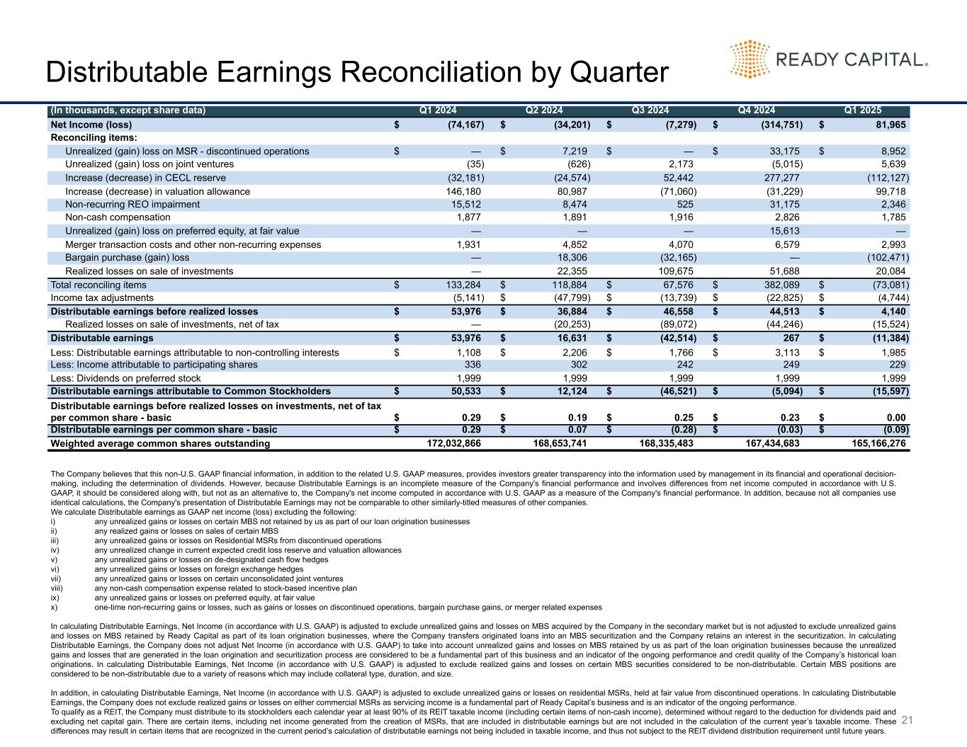 21 Distributable Earnings Reconciliation by Quarter The Company believes that this non-U.S. GAAP financial information, in addition to the related U.S. GAAP measures, provides investors greater transparency into the information used by management in its financial and operational decision- making, including the determination of dividends. However, because Distributable Earnings is an incomplete measure of the Company's financial performance and involves differences from net income computed in accordance with U.S. GAAP, it should be considered along with, but not as an alternative to, the Company's net income computed in accordance with U.S. GAAP as a measure of the Company's financial performance. In addition, because not all companies use identical calculations, the Company's presentation of Distributable Earnings may not be comparable to other similarly-titled measures of other companies. We calculate Distributable earnings as GAAP net income (loss) excluding the following: i) any unrealized gains or losses on certain MBS not retained by us as part of our loan origination businesses ii) any realized gains or losses on sales of certain MBS iii) any unrealized gains or losses on Residential MSRs from discontinued operations iv) any unrealized change in current expected credit loss reserve and valuation allowances v) any unrealized gains or losses on de-designated cash flow hedges vi) any unrealized gains or losses on foreign exchange hedges vii) any unrealized gains or losses on certain unconsolidated joint ventures viii) any non-cash compensation expense related to stock-based incentive plan ix) any unrealized gains or losses on preferred equity, at fair value x) one-time non-recurring gains or losses, such as gains or losses on discontinued operations, bargain purchase gains, or merger related expenses In calculating Distributable Earnings, Net Income (in accordance with U.S. GAAP) is adjusted to exclude unrealized gains and losses on MBS acquired by the Company in the secondary market but is not adjusted to exclude unrealized gains and losses on MBS retained by Ready Capital as part of its loan origination businesses, where the Company transfers originated loans into an MBS securitization and the Company retains an interest in the securitization. In calculating Distributable Earnings, the Company does not adjust Net Income (in accordance with U.S. GAAP) to take into account unrealized gains and losses on MBS retained by us as part of the loan origination businesses because the unrealized gains and losses that are generated in the loan origination and securitization process are considered to be a fundamental part of this business and an indicator of the ongoing performance and credit quality of the Company’s historical loan originations. In calculating Distributable Earnings, Net Income (in accordance with U.S. GAAP) is adjusted to exclude realized gains and losses on certain MBS securities considered to be non-distributable. Certain MBS positions are considered to be non-distributable due to a variety of reasons which may include collateral type, duration, and size. In addition, in calculating Distributable Earnings, Net Income (in accordance with U.S. GAAP) is adjusted to exclude unrealized gains or losses on residential MSRs, held at fair value from discontinued operations. In calculating Distributable Earnings, the Company does not exclude realized gains or losses on either commercial MSRs as servicing income is a fundamental part of Ready Capital’s business and is an indicator of the ongoing performance. To qualify as a REIT, the Company must distribute to its stockholders each calendar year at least 90% of its REIT taxable income (including certain items of non-cash income), determined without regard to the deduction for dividends paid and excluding net capital gain. There are certain items, including net income generated from the creation of MSRs, that are included in distributable earnings but are not included in the calculation of the current year’s taxable income. These differences may result in certain items that are recognized in the current period’s calculation of distributable earnings not being included in taxable income, and thus not subject to the REIT dividend distribution requirement until future years. (In thousands, except share data) Q1 2024 Q2 2024 Q3 2024 Q4 2024 Q1 2025 Net Income (loss) $ (74,167) $ (34,201) $ (7,279) $ (314,751) $ 81,965 Reconciling items: Unrealized (gain) loss on MSR - discontinued operations $ — $ 7,219 $ — $ 33,175 $ 8,952 Unrealized (gain) loss on joint ventures (35) (626) 2,173 (5,015) 5,639 Increase (decrease) in CECL reserve (32,181) (24,574) 52,442 277,277 (112,127) Increase (decrease) in valuation allowance 146,180 80,987 (71,060) (31,229) 99,718 Non-recurring REO impairment 15,512 8,474 525 31,175 2,346 Non-cash compensation 1,877 1,891 1,916 2,826 1,785 Unrealized (gain) loss on preferred equity, at fair value — — — 15,613 — Merger transaction costs and other non-recurring expenses 1,931 4,852 4,070 6,579 2,993 Bargain purchase (gain) loss — 18,306 (32,165) — (102,471) Realized losses on sale of investments — 22,355 109,675 51,688 20,084 Total reconciling items $ 133,284 $ 118,884 $ 67,576 $ 382,089 $ (73,081) Income tax adjustments (5,141) $ (47,799) $ (13,739) $ (22,825) $ (4,744) Distributable earnings before realized losses $ 53,976 $ 36,884 $ 46,558 $ 44,513 $ 4,140 Realized losses on sale of investments, net of tax — (20,253) (89,072) (44,246) (15,524) Distributable earnings $ 53,976 $ 16,631 $ (42,514) $ 267 $ (11,384) Less: Distributable earnings attributable to non-controlling interests $ 1,108 $ 2,206 $ 1,766 $ 3,113 $ 1,985 Less: Income attributable to participating shares 336 302 242 249 229 Less: Dividends on preferred stock 1,999 1,999 1,999 1,999 1,999 Distributable earnings attributable to Common Stockholders $ 50,533 $ 12,124 $ (46,521) $ (5,094) $ (15,597) Distributable earnings before 