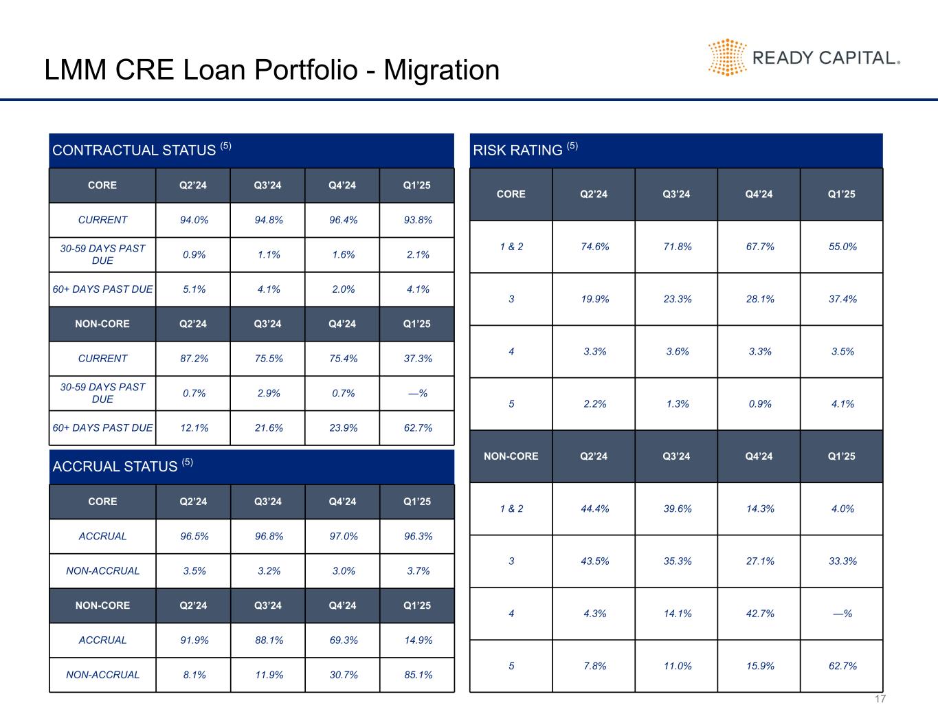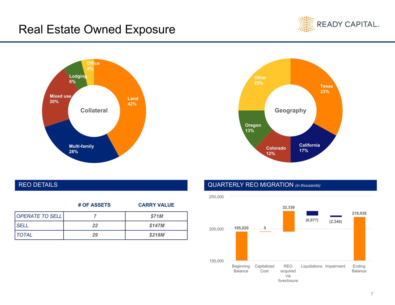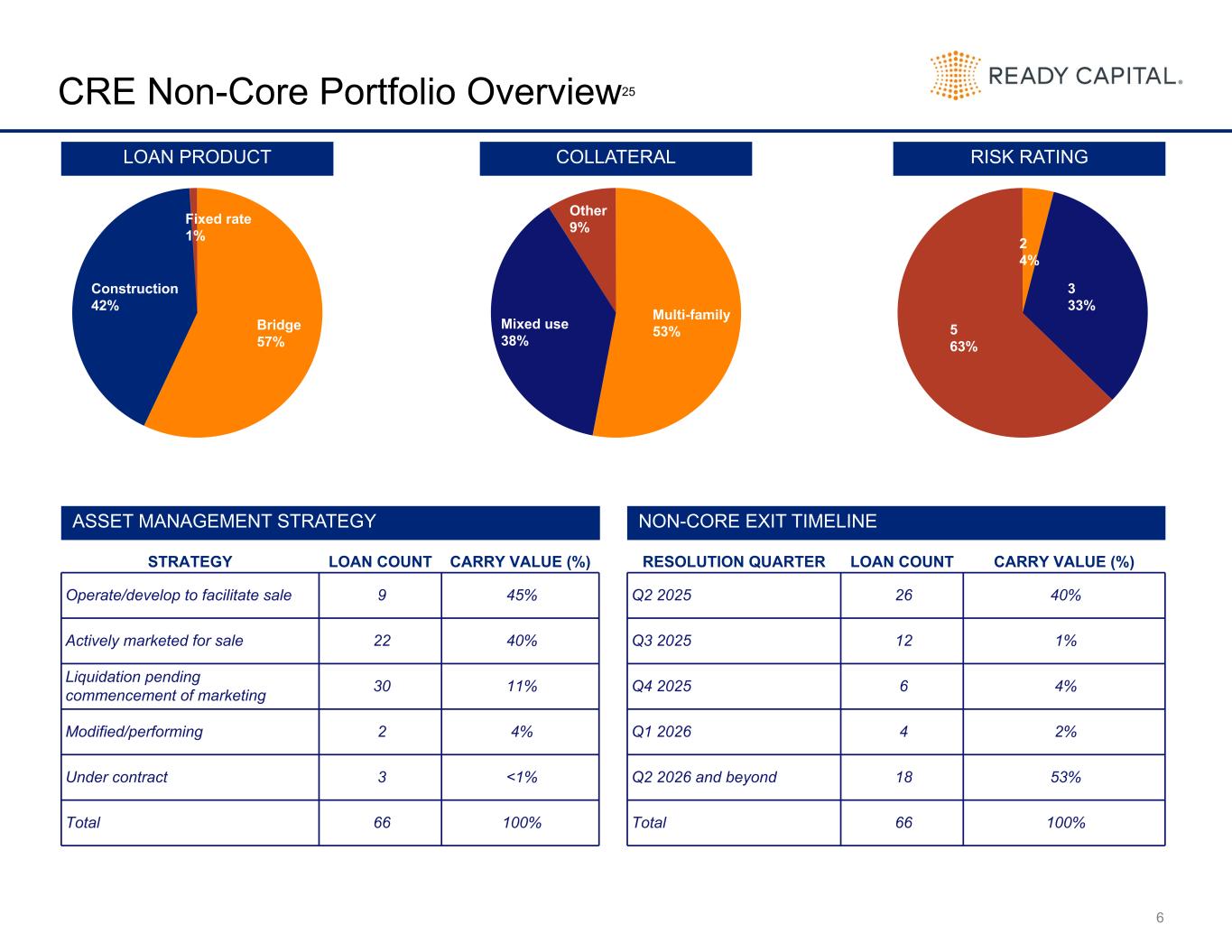 21 Distributable Earnings Reconciliation by Quarter The Company believes that this non-U.S. GAAP financial information, in addition to the related U.S. GAAP measures, provides investors greater transparency into the information used by management in its financial and operational decision- making, including the determination of dividends. However, because Distributable Earnings is an incomplete measure of the Company's financial performance and involves differences from net income computed in accordance with U.S. GAAP, it should be considered along with, but not as an alternative to, the Company's net income computed in accordance with U.S. GAAP as a measure of the Company's financial performance. In addition, because not all companies use identical calculations, the Company's presentation of Distributable Earnings may not be comparable to other similarly-titled measures of other companies. We calculate Distributable earnings as GAAP net income (loss) excluding the following: i) any unrealized gains or losses on certain MBS not retained by us as part of our loan origination businesses ii) any realized gains or losses on sales of certain MBS iii) any unrealized gains or losses on Residential MSRs from discontinued operations iv) any unrealized change in current expected credit loss reserve and valuation allowances v) any unrealized gains or losses on de-designated cash flow hedges vi) any unrealized gains or losses on foreign exchange hedges vii) any unrealized gains or losses on certain unconsolidated joint ventures viii) any non-cash compensation expense related to stock-based incentive plan ix) any unrealized gains or losses on preferred equity, at fair value x) one-time non-recurring gains or losses, such as gains or losses on discontinued operations, bargain purchase gains, or merger related expenses In calculating Distributable Earnings, Net Income (in accordance with U.S. GAAP) is adjusted to exclude unrealized gains and losses on MBS acquired by the Company in the secondary market but is not adjusted to exclude unrealized gains and losses on MBS retained by Ready Capital as part of its loan origination businesses, where the Company transfers originated loans into an MBS securitization and the Company retains an interest in the securitization. In calculating Distributable Earnings, the Company does not adjust Net Income (in accordance with U.S. GAAP) to take into account unrealized gains and losses on MBS retained by us as part of the loan origination businesses because the unrealized gains and losses that are generated in the loan origination and securitization process are considered to be a fundamental part of this business and an indicator of the ongoing performance and credit quality of the Company’s historical loan originations. In calculating Distributable Earnings, Net Income (in accordance with U.S. GAAP) is adjusted to exclude realized gains and losses on certain MBS securities considered to be non-distributable. Certain MBS positions are considered to be non-distributable due to a variety of reasons which may include collateral type, duration, and size. In addition, in calculating Distributable Earnings, Net Income (in accordance with U.S. GAAP) is adjusted to exclude unrealized gains or losses on residential MSRs, held at fair value from discontinued operations. In calculating Distributable Earnings, the Company does not exclude realized gains or losses on either commercial MSRs as servicing income is a fundamental part of Ready Capital’s business and is an indicator of the ongoing performance. To qualify as a REIT, the Company must distribute to its stockholders each calendar year at least 90% of its REIT taxable income (including certain items of non-cash income), determined without regard to the deduction for dividends paid and excluding net capital gain. There are certain items, including net income generated from the creation of MSRs, that are included in distributable earnings but are not included in the calculation of the current year’s taxable income. These differences may result in certain items that are recognized in the current period’s calculation of distributable earnings not being included in taxable income, and thus not subject to the REIT dividend distribution requirement until future years. (In thousands, except share data) Q1 2024 Q2 2024 Q3 2024 Q4 2024 Q1 2025 Net Income (loss) $ (74,167) $ (34,201) $ (7,279) $ (314,751) $ 81,965 Reconciling items: Unrealized (gain) loss on MSR - discontinued operations $ — $ 7,219 $ — $ 33,175 $ 8,952 Unrealized (gain) loss on joint ventures (35) (626) 2,173 (5,015) 5,639 Increase (decrease) in CECL reserve (32,181) (24,574) 52,442 277,277 (112,127) Increase (decrease) in valuation allowance 146,180 80,987 (71,060) (31,229) 99,718 Non-recurring REO impairment 15,512 8,474 525 31,175 2,346 Non-cash compensation 1,877 1,891 1,916 2,826 1,785 Unrealized (gain) loss on preferred equity, at fair value — — — 15,613 — Merger transaction costs and other non-recurring expenses 1,931 4,852 4,070 6,579 2,993 Bargain purchase (gain) loss — 18,306 (32,165) — (102,471) Realized losses on sale of investments — 22,355 109,675 51,688 20,084 Total reconciling items $ 133,284 $ 118,884 $ 67,576 $ 382,089 $ (73,081) Income tax adjustments (5,141) $ (47,799) $ (13,739) $ (22,825) $ (4,744) Distributable earnings before realized losses $ 53,976 $ 36,884 $ 46,558 $ 44,513 $ 4,140 Realized losses on sale of investments, net of tax — (20,253) (89,072) (44,246) (15,524) Distributable earnings $ 53,976 $ 16,631 $ (42,514) $ 267 $ (11,384) Less: Distributable earnings attributable to non-controlling interests $ 1,108 $ 2,206 $ 1,766 $ 3,113 $ 1,985 Less: Income attributable to participating shares 336 302 242 249 229 Less: Dividends on preferred stock 1,999 1,999 1,999 1,999 1,999 Distributable earnings attributable to Common Stockholders $ 50,533 $ 12,124 $ (46,521) $ (5,094) $ (15,597) Distributable earnings before 