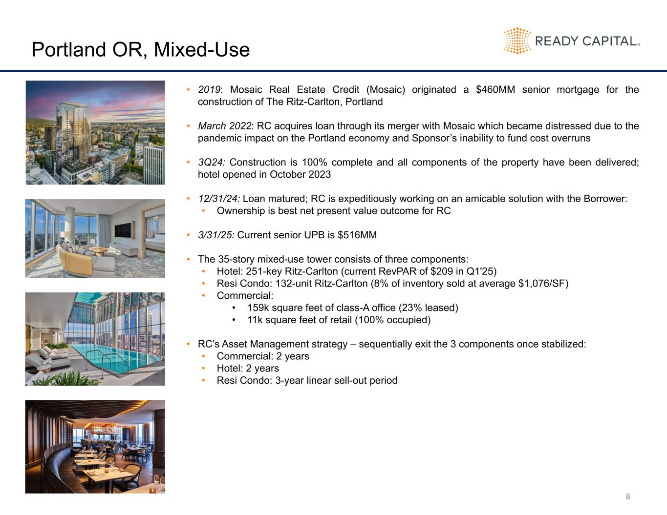 8 Portland OR, Mixed-Use • 2019: Mosaic Real Estate Credit (Mosaic) originated a $460MM senior mortgage for the construction of The Ritz-Carlton, Portland • March 2022: RC acquires loan through its merger with Mosaic which became distressed due to the pandemic impact on the Portland economy and Sponsor’s inability to fund cost overruns • 3Q24: Construction is 100% complete and all components of the property have been delivered; hotel opened in October 2023 • 12/31/24: Loan matured; RC is expeditiously working on an amicable solution with the Borrower: • Ownership is best net present value outcome for RC • 3/31/25: Current senior UPB is $516MM • The 35-story mixed-use tower consists of three components: • Hotel: 251-key Ritz-Carlton (current RevPAR of $209 in Q1'25) • Resi Condo: 132-unit Ritz-Carlton (8% of inventory sold at average $1,076/SF) • Commercial: • 159k square feet of class-A office (23% leased) • 11k square feet of retail (100% occupied) • RC’s Asset Management strategy – sequentially exit the 3 components once stabilized: • Commercial: 2 years • Hotel: 2 years • Resi Condo: 3-year linear sell-out period