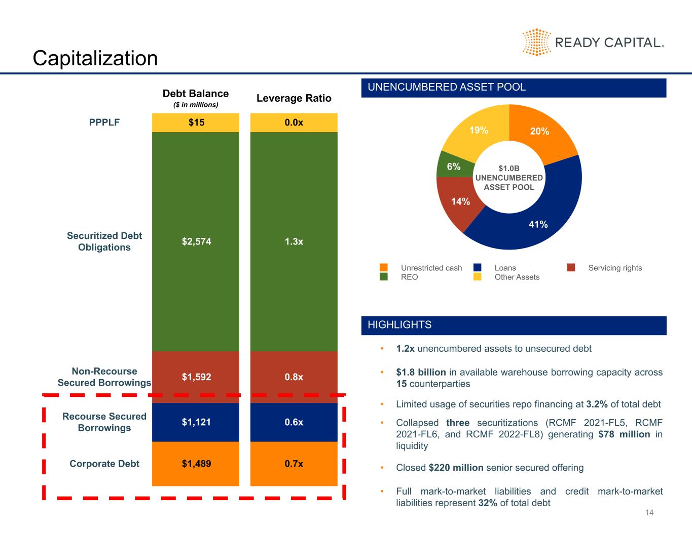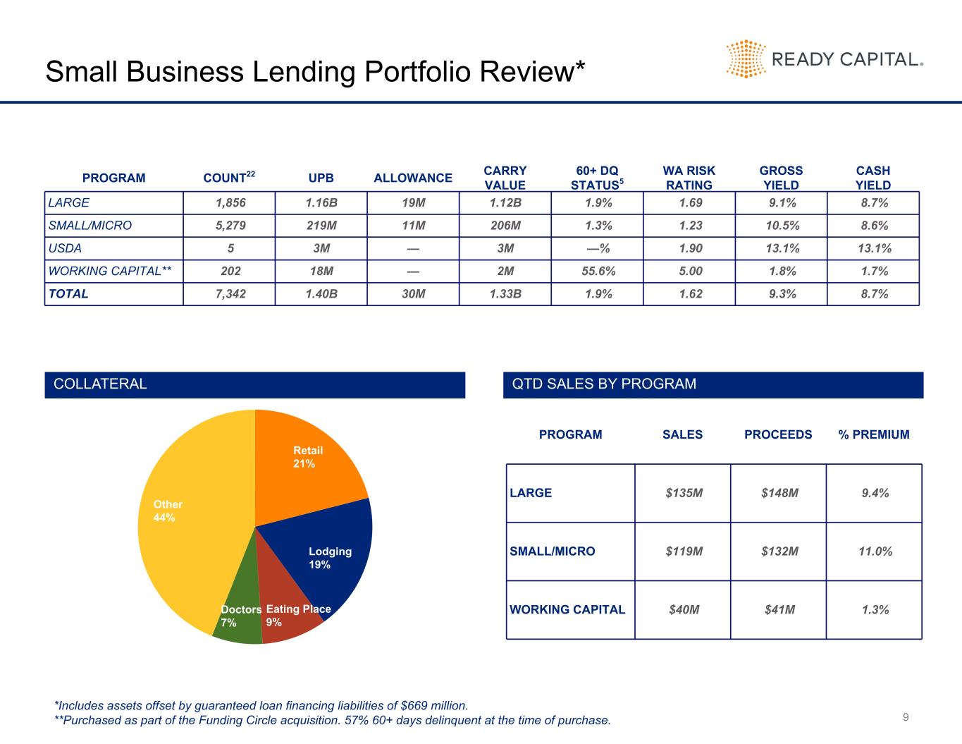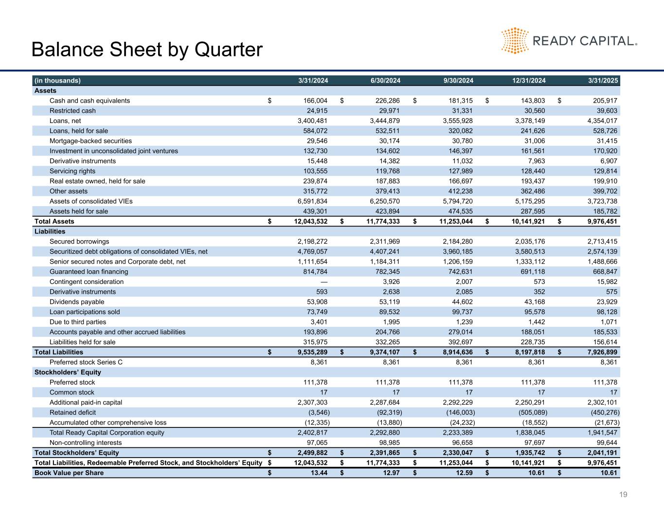 19 Balance Sheet by Quarter (in thousands) 3/31/2024 6/30/2024 9/30/2024 12/31/2024 3/31/2025 Assets Cash and cash equivalents $ 166,004 $ 226,286 $ 181,315 $ 143,803 $ 205,917 Restricted cash 24,915 29,971 31,331 30,560 39,603 Loans, net 3,400,481 3,444,879 3,555,928 3,378,149 4,354,017 Loans, held for sale 584,072 532,511 320,082 241,626 528,726 Mortgage-backed securities 29,546 30,174 30,780 31,006 31,415 Investment in unconsolidated joint ventures 132,730 134,602 146,397 161,561 170,920 Derivative instruments 15,448 14,382 11,032 7,963 6,907 Servicing rights 103,555 119,768 127,989 128,440 129,814 Real estate owned, held for sale 239,874 187,883 166,697 193,437 199,910 Other assets 315,772 379,413 412,238 362,486 399,702 Assets of consolidated VIEs 6,591,834 6,250,570 5,794,720 5,175,295 3,723,738 Assets held for sale 439,301 423,894 474,535 287,595 185,782 Total Assets $ 12,043,532 $ 11,774,333 $ 11,253,044 $ 10,141,921 $ 9,976,451 Liabilities Secured borrowings 2,198,272 2,311,969 2,184,280 2,035,176 2,713,415 Securitized debt obligations of consolidated VIEs, net 4,769,057 4,407,241 3,960,185 3,580,513 2,574,139 Senior secured notes and Corporate debt, net 1,111,654 1,184,311 1,206,159 1,333,112 1,488,666 Guaranteed loan financing 814,784 782,345 742,631 691,118 668,847 Contingent consideration — 3,926 2,007 573 15,982 Derivative instruments 593 2,638 2,085 352 575 Dividends payable 53,908 53,119 44,602 43,168 23,929 Loan participations sold 73,749 89,532 99,737 95,578 98,128 Due to third parties 3,401 1,995 1,239 1,442 1,071 Accounts payable and other accrued liabilities 193,896 204,766 279,014 188,051 185,533 Liabilities held for sale 315,975 332,265 392,697 228,735 156,614 Total Liabilities $ 9,535,289 $ 9,374,107 $ 8,914,636 $ 8,197,818 $ 7,926,899 Preferred stock Series C 8,361 8,361 8,361 8,361 8,361 Stockholders’ Equity Preferred stock 111,378 111,378 111,378 111,378 111,378 Common stock 17 17 17 17 17 Additional paid-in capital 2,307,303 2,287,684 2,292,229 2,250,291 2,302,101 Retained deficit (3,546) (92,319) (146,003) (505,089) (450,276) Accumulated other comprehensive loss (12,335) (13,880) (24,232) (18,552) (21,673) Total Ready Capital Corporation equity 2,402,817 2,292,880 2,233,389 1,838,045 1,941,547 Non-controlling interests 97,065 98,985 96,658 97,697 99,644 Total Stockholders’ Equity $ 2,499,882 $ 2,391,865 $ 2,330,047 $ 1,935,742 $ 2,041,191 Total Liabilities, Redeemable Preferred Stock, and Stockholders’ Equity $ 12,043,532 $ 11,774,333 $ 11,253,044 $ 10,141,921 $ 9,976,451 Book Value per Share $ 13.44 $ 12.97 $ 12.59 $ 10.61 $ 10.61