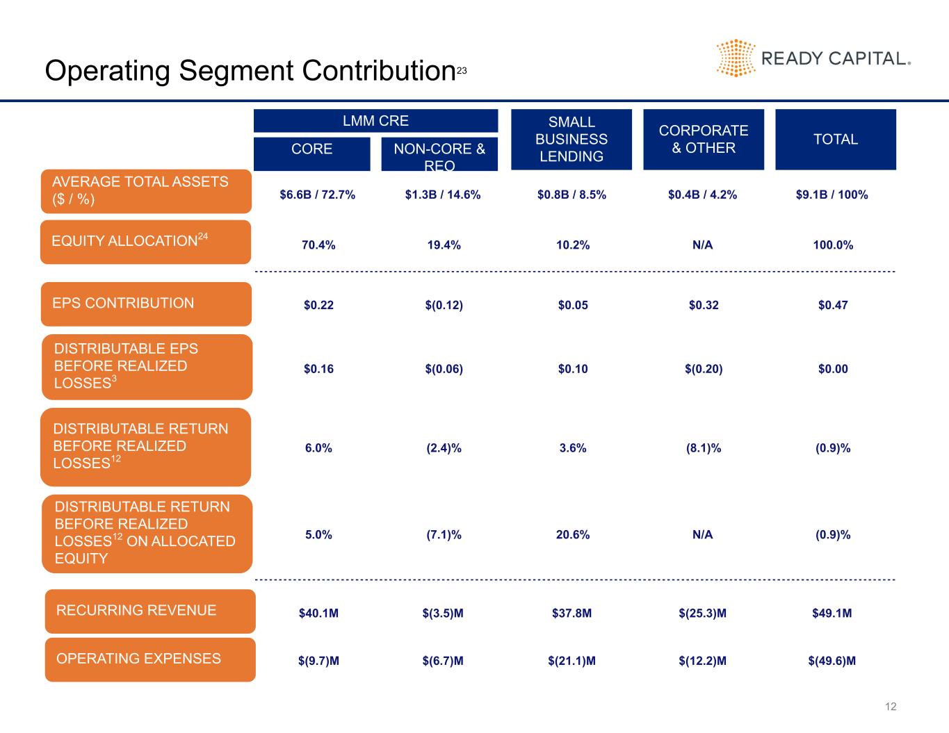 11 Earnings Profile Balance (in thousands) Annualized ROE Contribution Recurring Revenue: Net interest income $ 14,642 3.3% Gain on sale, net of variable costs 20,105 4.6% Other recurring revenue 14,313 3.3% Total recurring revenue $ 49,060 11.2% Operating Expenses: Employee compensation & benefits $ (17,809) (4.1)% Fixed operating costs (16,644) (3.8)% Servicing expenses (15,339) (3.5)% Investment advisory fees (5,577) (1.3)% Tax 5,730 1.3% Total operating costs and tax $ (49,639) (11.3)% Net loss from normal operations, net of tax $ (579) (0.1)% Other Items included in Earnings: Realized losses $ (20,084) (4.6)% CECL & valuation allowances 10,237 2.3% Discontinued operations (560) (0.1)% Mark-to-market (5,544) (1.3)% Non-cash compensation (1,785) (0.4)% Bargain purchase gain net of costs 99,777 22.8% Other nonrecurring expenses (1,122) (0.3)% Tax (374) (0.1)% Total other items included in earnings $ 80,545 18.4% Net income including dividends on preferred stock $ 79,966 18.2% Current Pay Interest: $146M Accrued Interest: $2M Accretion of Discount: $6M Interest expense: ($140M) Servicing Income: $6M Income from Unconsolidated JV's: $1M Rental Income: $2M Other Fee Income: $2M Other Income: $3M Gain on sale, net of variable costs: SBA 7(a): $16M USDA: $1M Business Loans: $3M Primary/Special Servicing Fees: $7M Advances: $8M Bargain Purchase Gain : $103M Merger Expenses: $3M