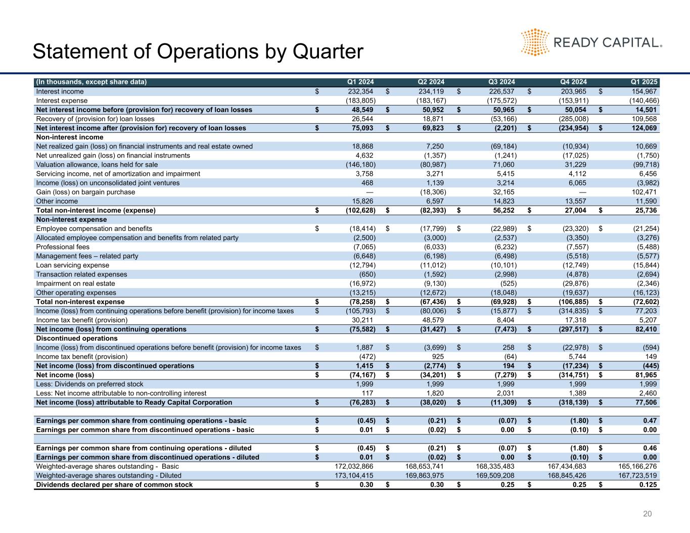 20 Statement of Operations by Quarter (In thousands, except share data) Q1 2024 Q2 2024 Q3 2024 Q4 2024 Q1 2025 Interest income $ 232,354 $ 234,119 $ 226,537 $ 203,965 $ 154,967 Interest expense (183,805) (183,167) (175,572) (153,911) (140,466) Net interest income before (provision for) recovery of loan losses $ 48,549 $ 50,952 $ 50,965 $ 50,054 $ 14,501 Recovery of (provision for) loan losses 26,544 18,871 (53,166) (285,008) 109,568 Net interest income after (provision for) recovery of loan losses $ 75,093 $ 69,823 $ (2,201) $ (234,954) $ 124,069 Non-interest income Net realized gain (loss) on financial instruments and real estate owned 18,868 7,250 (69,184) (10,934) 10,669 Net unrealized gain (loss) on financial instruments 4,632 (1,357) (1,241) (17,025) (1,750) Valuation allowance, loans held for sale (146,180) (80,987) 71,060 31,229 (99,718) Servicing income, net of amortization and impairment 3,758 3,271 5,415 4,112 6,456 Income (loss) on unconsolidated joint ventures 468 1,139 3,214 6,065 (3,982) Gain (loss) on bargain purchase — (18,306) 32,165 — 102,471 Other income 15,826 6,597 14,823 13,557 11,590 Total non-interest income (expense) $ (102,628) $ (82,393) $ 56,252 $ 27,004 $ 25,736 Non-interest expense Employee compensation and benefits $ (18,414) $ (17,799) $ (22,989) $ (23,320) $ (21,254) Allocated employee compensation and benefits from related party (2,500) (3,000) (2,537) (3,350) (3,276) Professional fees (7,065) (6,033) (6,232) (7,557) (5,488) Management fees – related party (6,648) (6,198) (6,498) (5,518) (5,577) Loan servicing expense (12,794) (11,012) (10,101) (12,749) (15,844) Transaction related expenses (650) (1,592) (2,998) (4,878) (2,694) Impairment on real estate (16,972) (9,130) (525) (29,876) (2,346) Other operating expenses (13,215) (12,672) (18,048) (19,637) (16,123) Total non-interest expense $ (78,258) $ (67,436) $ (69,928) $ (106,885) $ (72,602) Income (loss) from continuing operations before benefit (provision) for income taxes $ (105,793) $ (80,006) $ (15,877) $ (314,835) $ 77,203 Income tax benefit (provision) 30,211 48,579 8,404 17,318 5,207 Net income (loss) from continuing operations $ (75,582) $ (31,427) $ (7,473) $ (297,517) $ 82,410 Discontinued operations Income (loss) from discontinued operations before benefit (provision) for income taxes $ 1,887 $ (3,699) $ 258 $ (22,978) $ (594) Income tax benefit (provision) (472) 925 (64) 5,744 149 Net income (loss) from discontinued operations $ 1,415 $ (2,774) $ 194 $ (17,234) $ (445) Net income (loss) $ (74,167) $ (34,201) $ (7,279) $ (314,751) $ 81,965 Less: Dividends on preferred stock 1,999 1,999 1,999 1,999 1,999 Less: Net income attributable to non-controlling interest 117 1,820 2,031 1,389 2,460 Net income (loss) attributable to Ready Capital Corporation $ (76,283) $ (38,020) $ (11,309) $ (318,139) $ 77,506 Earnings per common share from continuing operations - basic $ (0.45) $ (0.21) $ (0.07) $ (1.80) $ 0.47 Earnings per common share from discontinued operations - basic $ 0.01 $ (0.02) $ 0.00 $ (0.10) $ 0.00 Earnings per common share from continuing operations - diluted $ (0.45) $ (0.21) $ (0.07) $ (1.80) $ 0.46 Earnings per common share from discontinued operations - diluted $ 0.01 $ (0.02) $ 0.00 $ (0.10) $ 0.00 Weighted-average shares outstanding - Basic 172,032,866 168,653,741 168,335,483 167,434,683 165,166,276 Weighted-average shares outstanding - Diluted 173,104,415 169,863,975 169,509,208 168,845,426 167,723,519 Dividends declared per share of common stock $ 0.30 $ 0.30 $ 0.25 $ 0.25 $ 0.125