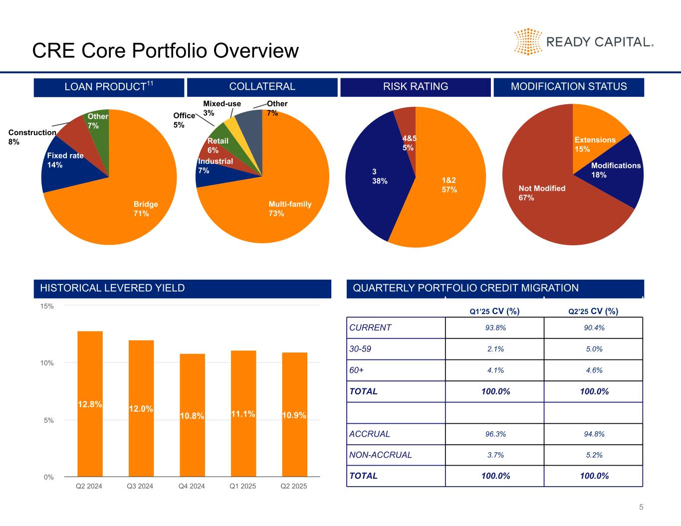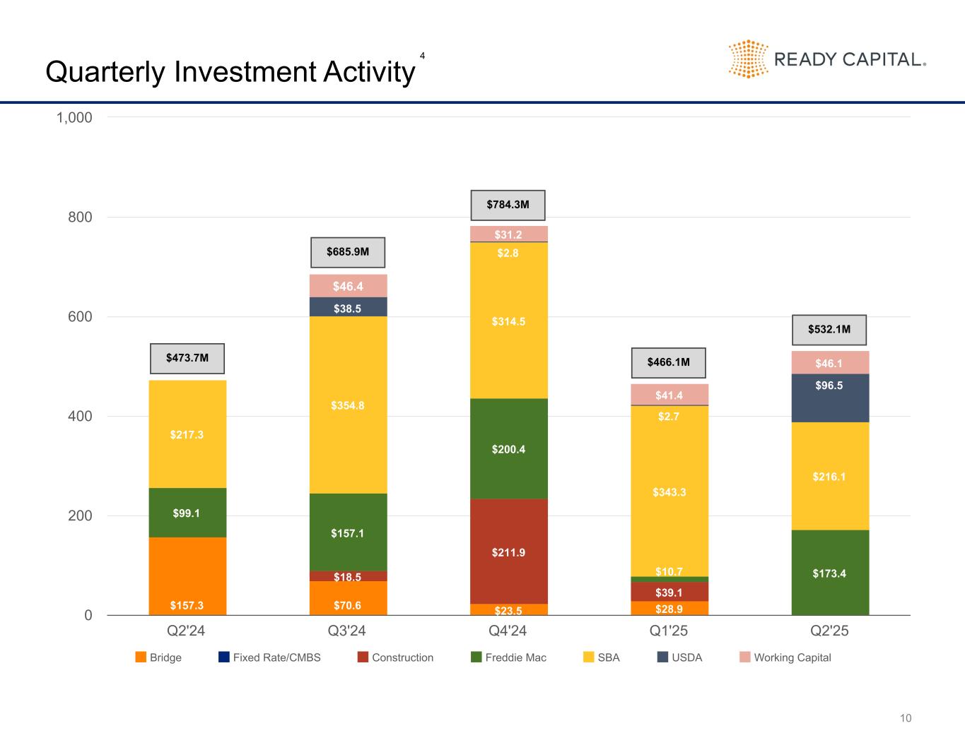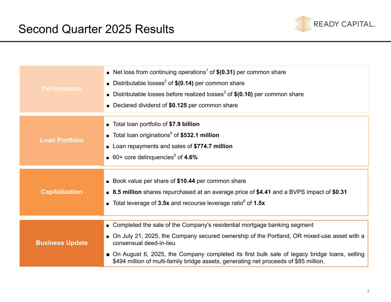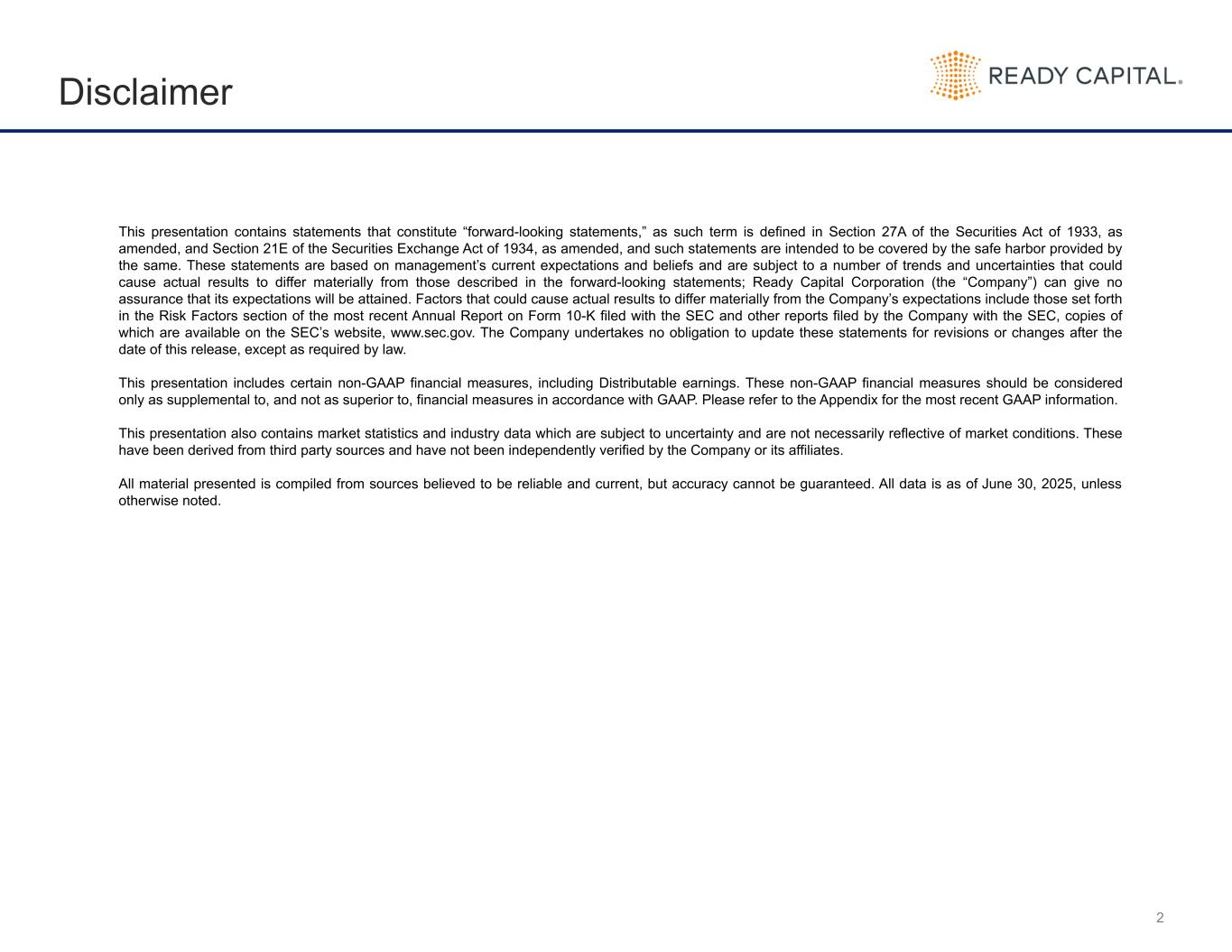 2 Disclaimer This presentation contains statements that constitute “forward-looking statements,” as such term is defined in Section 27A of the Securities Act of 1933, as amended, and Section 21E of the Securities Exchange Act of 1934, as amended, and such statements are intended to be covered by the safe harbor provided by the same. These statements are based on management’s current expectations and beliefs and are subject to a number of trends and uncertainties that could cause actual results to differ materially from those described in the forward-looking statements; Ready Capital Corporation (the “Company”) can give no assurance that its expectations will be attained. Factors that could cause actual results to differ materially from the Company’s expectations include those set forth in the Risk Factors section of the most recent Annual Report on Form 10-K filed with the SEC and other reports filed by the Company with the SEC, copies of which are available on the SEC’s website, www.sec.gov. The Company undertakes no obligation to update these statements for revisions or changes after the date of this release, except as required by law. This presentation includes certain non-GAAP financial measures, including Distributable earnings. These non-GAAP financial measures should be considered only as supplemental to, and not as superior to, financial measures in accordance with GAAP. Please refer to the Appendix for the most recent GAAP information. This presentation also contains market statistics and industry data which are subject to uncertainty and are not necessarily reflective of market conditions. These have been derived from third party sources and have not been independently verified by the Company or its affiliates. All material presented is compiled from sources believed to be reliable and current, but accuracy cannot be guaranteed. All data is as of June 30, 2025, unless otherwise noted.