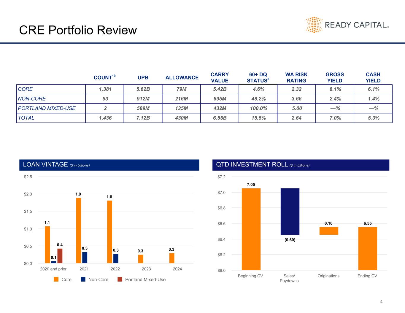 3 Second Quarter 2025 Results ■ Net loss from continuing operations1 of $(0.31) per common share ■ Distributable losses2 of $(0.14) per common share ■ Distributable losses before realized losses3 of $(0.10) per common share ■ Declared dividend of $0.125 per common share Performance ■ Total loan portfolio of $7.9 billion ■ Total loan originations4 of $532.1 million ■ Loan repayments and sales of $774.7 million ■ 60+ core delinquencies5 of 4.6% Loan Portfolio Capitalization ■ Book value per share of $10.44 per common share ■ 8.5 million shares repurchased at an average price of $4.41 and a BVPS impact of $0.31 ■ Total leverage of 3.5x and recourse leverage ratio6 of 1.5x Business Update ■ Completed the sale of the Company's residential mortgage banking segment ■ On July 21, 2025, the Company secured ownership of the Portland, OR mixed-use asset with a consensual deed-in-lieu ■ On August 6, 2025, the Company completed its first bulk sale of legacy bridge loans, selling $494 million of multi-family bridge assets, generating net proceeds of $85 million.