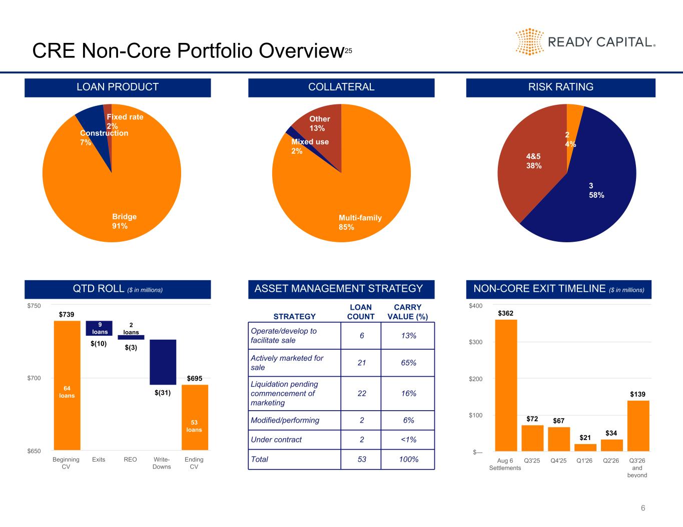 5 CRE Core Portfolio Overview LOAN PRODUCT11 RISK RATINGCOLLATERAL MODIFICATION STATUS HISTORICAL LEVERED YIELD 12.8% 12.0% 10.8% 11.1% 10.9% Q2 2024 Q3 2024 Q4 2024 Q1 2025 Q2 2025 0% 5% 10% 15% QUARTERLY PORTFOLIO CREDIT MIGRATION Bridge 71% Fixed rate 14% Construction 8% Other 7% Multi-family 73% Industrial 7% Retail 6% Office 5% Mixed-use 3% Other 7% 1&2 57% 3 38% 4&5 5% Extensions 15% Modifications 18% Not Modified 67% Q1’25 CV (%) Q2’25 CV (%) CURRENT 93.8% 90.4% 30-59 2.1% 5.0% 60+ 4.1% 4.6% TOTAL 100.0% 100.0% ACCRUAL 96.3% 94.8% NON-ACCRUAL 3.7% 5.2% TOTAL 100.0% 100.0%