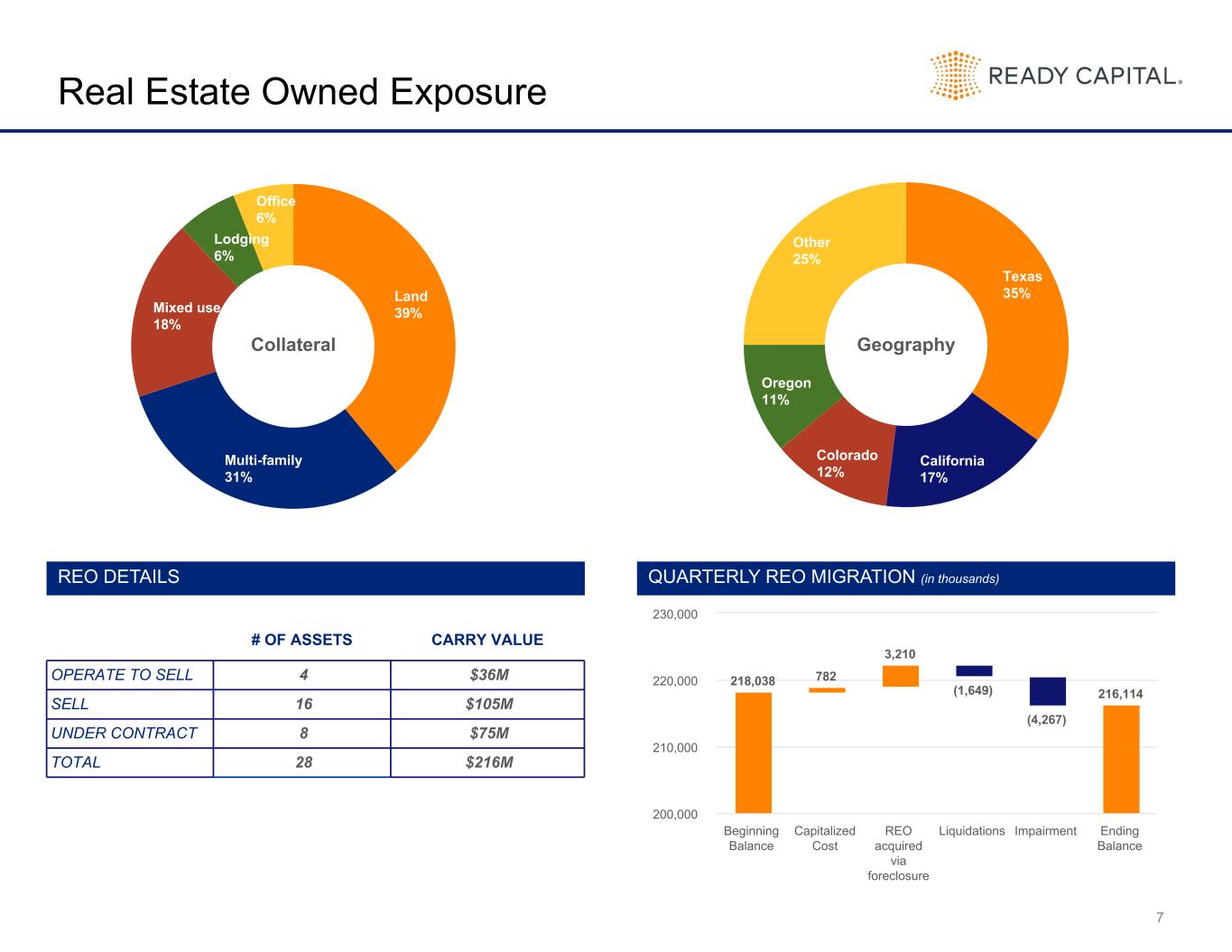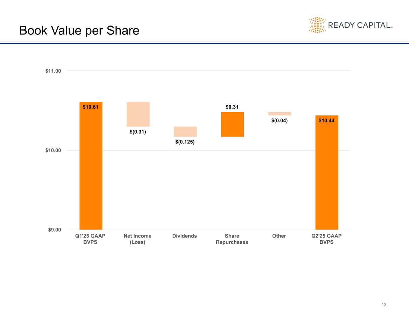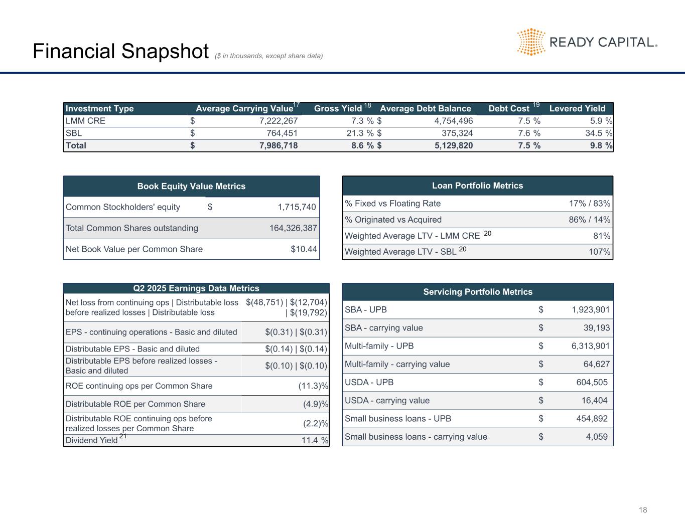 21 Distributable Earnings Reconciliation by Quarter The Company believes that this non-U.S. GAAP financial information, in addition to the related U.S. GAAP measures, provides investors greater transparency into the information used by management in its financial and operational decision- making, including the determination of dividends. However, because Distributable Earnings is an incomplete measure of the Company's financial performance and involves differences from net income computed in accordance with U.S. GAAP, it should be considered along with, but not as an alternative to, the Company's net income computed in accordance with U.S. GAAP as a measure of the Company's financial performance. In addition, because not all companies use identical calculations, the Company's presentation of Distributable Earnings may not be comparable to other similarly-titled measures of other companies. We calculate Distributable earnings as GAAP net income (loss) excluding the following: i) any unrealized gains or losses on certain MBS not retained by us as part of our loan origination businesses ii) any realized gains or losses on sales of certain MBS iii) any unrealized gains or losses on Residential MSRs from discontinued operations iv) any unrealized change in current expected credit loss reserve and valuation allowances v) any unrealized gains or losses on de-designated cash flow hedges vi) any unrealized gains or losses on foreign exchange hedges vii) any unrealized gains or losses on certain unconsolidated joint ventures viii) any non-cash compensation expense related to stock-based incentive plan ix) any unrealized gains or losses on preferred equity, at fair value x) one-time non-recurring gains or losses, such as gains or losses on discontinued operations, bargain purchase gains, or merger related expenses In calculating Distributable Earnings, Net Income (in accordance with U.S. GAAP) is adjusted to exclude unrealized gains and losses on MBS acquired by the Company in the secondary market but is not adjusted to exclude unrealized gains and losses on MBS retained by Ready Capital as part of its loan origination businesses, where the Company transfers originated loans into an MBS securitization and the Company retains an interest in the securitization. In calculating Distributable Earnings, the Company does not adjust Net Income (in accordance with U.S. GAAP) to take into account unrealized gains and losses on MBS retained by us as part of the loan origination businesses because the unrealized gains and losses that are generated in the loan origination and securitization process are considered to be a fundamental part of this business and an indicator of the ongoing performance and credit quality of the Company’s historical loan originations. In calculating Distributable Earnings, Net Income (in accordance with U.S. GAAP) is adjusted to exclude realized gains and losses on certain MBS securities considered to be non-distributable. Certain MBS positions are considered to be non-distributable due to a variety of reasons which may include collateral type, duration, and size. In addition, in calculating Distributable Earnings, Net Income (in accordance with U.S. GAAP) is adjusted to exclude unrealized gains or losses on residential MSRs, held at fair value from discontinued operations. In calculating Distributable Earnings, the Company does not exclude realized gains or losses on either commercial MSRs as servicing income is a fundamental part of Ready Capital’s business and is an indicator of the ongoing performance. To qualify as a REIT, the Company must distribute to its stockholders each calendar year at least 90% of its REIT taxable income (including certain items of non-cash income), determined without regard to the deduction for dividends paid and excluding net capital gain. There are certain items, including net income generated from the creation of MSRs, that are included in distributable earnings but are not included in the calculation of the current year’s taxable income. These differences may result in certain items that are recognized in the current period’s calculation of distributable earnings not being included in taxable income, and thus not subject to the REIT dividend distribution requirement until future years. (In thousands, except share data) Q2 2024 Q3 2024 Q4 2024 Q1 2025 Q2 2025 Net Income (loss) $ (34,201) $ (7,279) $ (314,751) $ 81,965 $ (53,677) Reconciling items: Unrealized (gain) loss on MSR - discontinued operations $ 7,219 $ — $ 33,175 $ 8,952 $ — Unrealized (gain) loss on joint ventures (626) 2,173 (5,015) 5,639 1,019 Increase (decrease) in CECL reserve (24,574) 52,442 277,277 (112,127) 487 Increase (decrease) in valuation allowance 80,987 (71,060) (31,229) 99,718 39,746 Non-recurring REO impairment 8,474 525 31,175 2,346 4,418 Non-cash compensation 1,891 1,916 2,826 1,785 1,634 Unrealized (gain) loss on preferred equity, at fair value — — 15,613 — (4,227) Merger transaction costs and other non-recurring expenses 4,852 4,070 6,579 2,993 12,115 Bargain purchase (gain) loss 18,306 (32,165) — (102,471) 14,381 Realized losses on sale of investments 22,355 109,675 51,688 20,084 8,896 Total reconciling items $ 118,884 $ 67,576 $ 382,089 $ (73,081) $ 78,469 Income tax adjustments (47,799) $ (13,739) $ (22,825) $ (4,744) $ (37,496) Distributable earnings before realized losses $ 36,884 $ 46,558 $ 44,513 $ 4,140 $ (12,704) Realized losses on sale of investments, net of tax (20,253) (89,072) (44,246) (15,524) (7,088) Distributable earnings $ 16,631 $ (42,514) $ 267 $ (11,384) $ (19,792) Less: Distributable earnings attributable to non-controlling interests $ 2,206 $ 1,766 $ 3,113 $ 1,985 $ 1,990 Less: Income attributable to participating shares 302 242 249 229 215 Less: Dividends on preferred stock 1,999 1,999 1,999 1,999 1,999 Distributable earnings attributable to Common Stockholders $ 12,124 $ (46,521) $ (5,094) $ (15,597) $ (23,996) Distributable ea