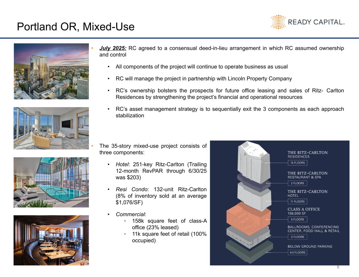8 Portland OR, Mixed-Use • July 2025: RC agreed to a consensual deed-in-lieu arrangement in which RC assumed ownership and control • All components of the project will continue to operate business as usual • RC will manage the project in partnership with Lincoln Property Company • RC’s ownership bolsters the prospects for future office leasing and sales of Ritz- Carlton Residences by strengthening the project’s financial and operational resources • RC’s asset management strategy is to sequentially exit the 3 components as each approach stabilization • The 35-story mixed-use project consists of three components: • Hotel: 251-key Ritz-Carlton (Trailing 12-month RevPAR through 6/30/25 was $203) • Resi Condo: 132-unit Ritz-Carlton (8% of inventory sold at an average $1,076/SF) • Commercial: ◦ 158k square feet of class-A office (23% leased) ◦ 11k square feet of retail (100% occupied)
