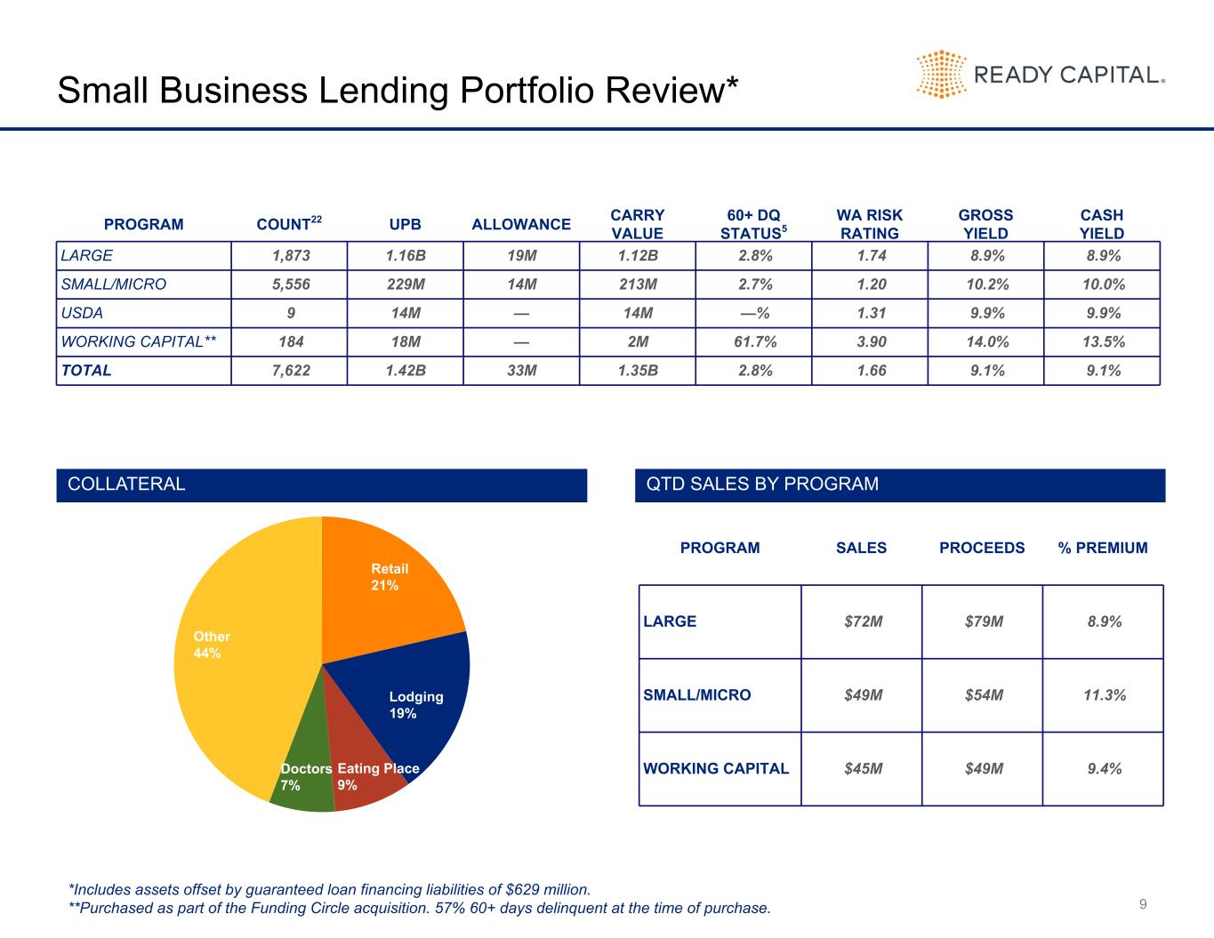 19 Balance Sheet by Quarter (in thousands) 6/30/2024 9/30/2024 12/31/2024 3/31/2025 6/30/2025 Assets Cash and cash equivalents $ 226,286 $ 181,315 $ 143,803 $ 205,917 $ 162,935 Restricted cash 29,971 31,331 30,560 39,603 56,769 Loans, net 3,444,879 3,555,928 3,378,149 4,354,017 5,066,694 Loans, held for sale 532,511 320,082 241,626 528,726 632,784 Mortgage-backed securities 30,174 30,780 31,006 31,415 32,310 Investment in unconsolidated joint ventures 134,602 146,397 161,561 170,920 169,369 Derivative instruments 14,382 11,032 7,963 6,907 5,754 Servicing rights 119,768 127,989 128,440 129,814 124,283 Real estate owned, held for sale 187,883 166,697 193,437 199,910 199,790 Other assets 379,413 412,238 362,486 399,702 462,711 Assets of consolidated VIEs 6,250,570 5,794,720 5,175,295 3,723,738 2,395,398 Assets held for sale 423,894 474,535 287,595 185,782 — Total Assets $ 11,774,333 $ 11,253,044 $ 10,141,921 $ 9,976,451 $ 9,308,797 Liabilities Secured borrowings 2,311,969 2,184,280 2,035,176 2,713,415 3,506,670 Securitized debt obligations of consolidated VIEs, net 4,407,241 3,960,185 3,580,513 2,574,139 1,513,297 Senior secured notes and Corporate debt, net 1,184,311 1,206,159 1,333,112 1,488,666 1,387,029 Guaranteed loan financing 782,345 742,631 691,118 668,847 629,380 Contingent consideration 3,926 2,007 573 15,982 17,189 Derivative instruments 2,638 2,085 352 575 1,986 Dividends payable 53,119 44,602 43,168 23,929 22,917 Loan participations sold 89,532 99,737 95,578 98,128 101,863 Due to third parties 1,995 1,239 1,442 1,071 9,791 Accounts payable and other accrued liabilities 204,766 279,014 188,051 185,533 184,652 Liabilities held for sale 332,265 392,697 228,735 156,614 — Total Liabilities $ 9,374,107 $ 8,914,636 $ 8,197,818 $ 7,926,899 $ 7,374,774 Preferred stock Series C 8,361 8,361 8,361 8,361 8,361 Stockholders’ Equity Preferred stock 111,378 111,378 111,378 111,378 111,378 Common stock 17 17 17 17 17 Additional paid-in capital 2,287,684 2,292,229 2,250,291 2,302,101 2,267,540 Retained deficit (92,319) (146,003) (505,089) (450,276) (528,524) Accumulated other comprehensive loss (13,880) (24,232) (18,552) (21,673) (23,293) Total Ready Capital Corporation equity 2,292,880 2,233,389 1,838,045 1,941,547 1,827,118 Non-controlling interests 98,985 96,658 97,697 99,644 98,544 Total Stockholders’ Equity $ 2,391,865 $ 2,330,047 $ 1,935,742 $ 2,041,191 $ 1,925,662 Total Liabilities, Redeemable Preferred Stock, and Stockholders’ Equity $ 11,774,333 $ 11,253,044 $ 10,141,921 $ 9,976,451 $ 9,308,797 Book Value per Share $ 12.97 $ 12.59 $ 10.61 $ 10.61 $ 10.44