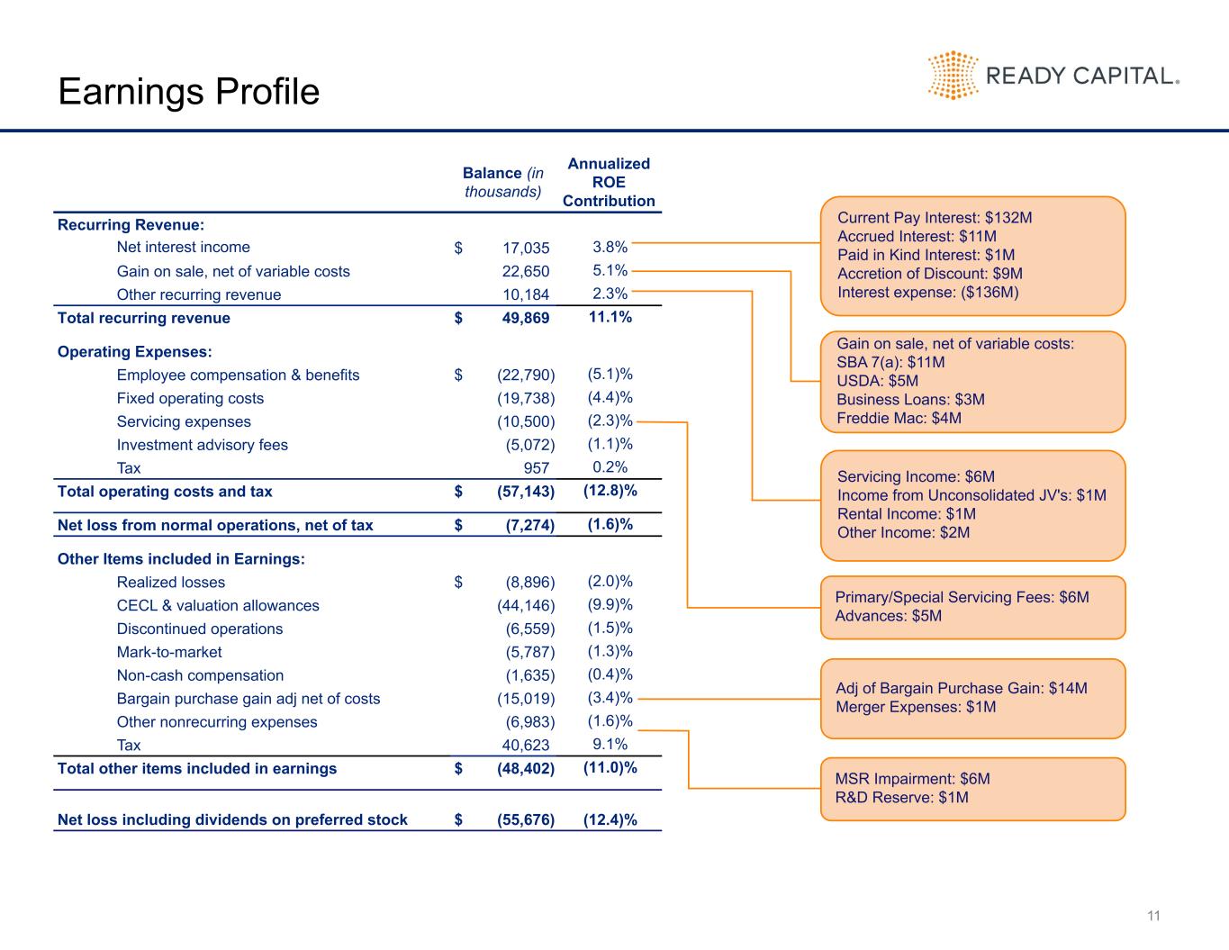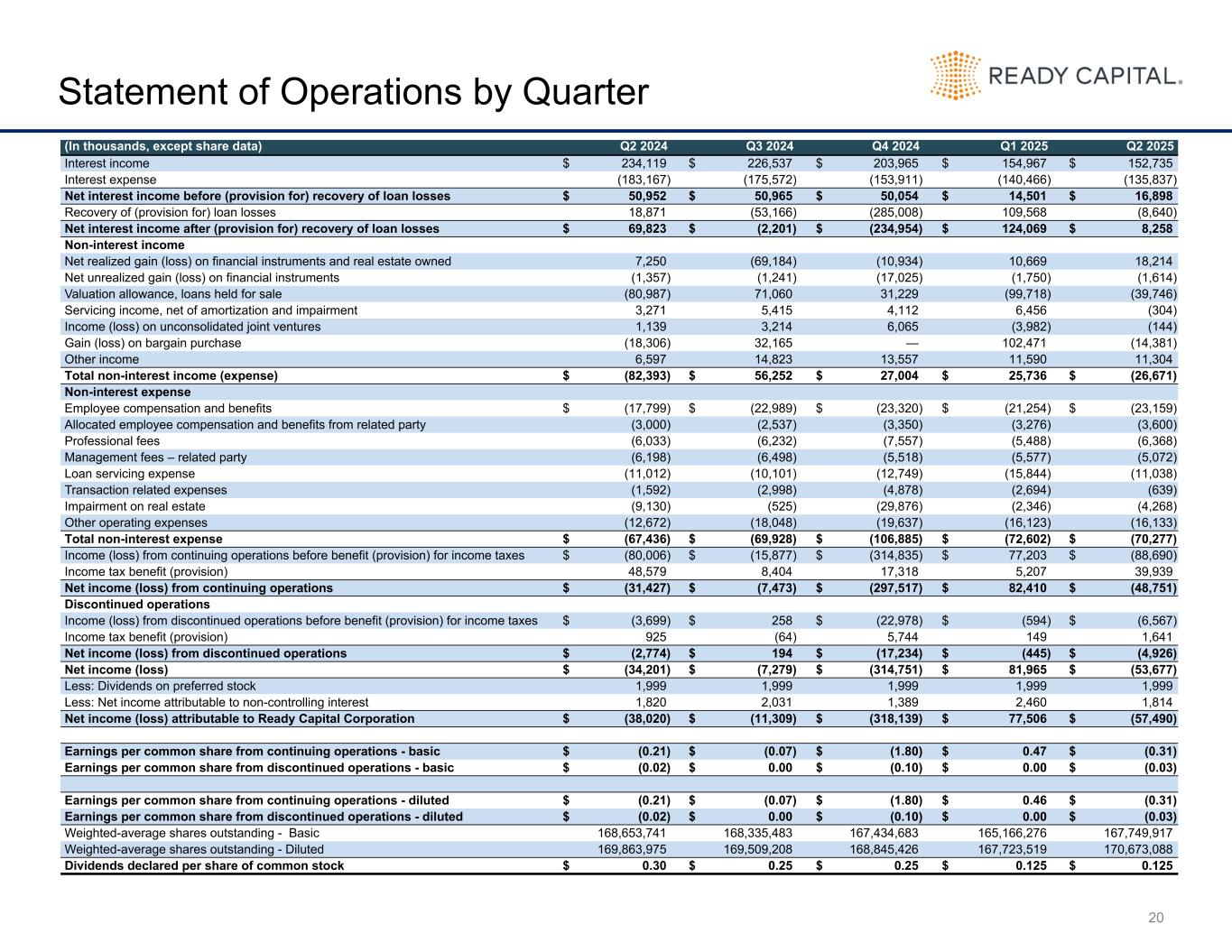 20 Statement of Operations by Quarter (In thousands, except share data) Q2 2024 Q3 2024 Q4 2024 Q1 2025 Q2 2025 Interest income $ 234,119 $ 226,537 $ 203,965 $ 154,967 $ 152,735 Interest expense (183,167) (175,572) (153,911) (140,466) (135,837) Net interest income before (provision for) recovery of loan losses $ 50,952 $ 50,965 $ 50,054 $ 14,501 $ 16,898 Recovery of (provision for) loan losses 18,871 (53,166) (285,008) 109,568 (8,640) Net interest income after (provision for) recovery of loan losses $ 69,823 $ (2,201) $ (234,954) $ 124,069 $ 8,258 Non-interest income Net realized gain (loss) on financial instruments and real estate owned 7,250 (69,184) (10,934) 10,669 18,214 Net unrealized gain (loss) on financial instruments (1,357) (1,241) (17,025) (1,750) (1,614) Valuation allowance, loans held for sale (80,987) 71,060 31,229 (99,718) (39,746) Servicing income, net of amortization and impairment 3,271 5,415 4,112 6,456 (304) Income (loss) on unconsolidated joint ventures 1,139 3,214 6,065 (3,982) (144) Gain (loss) on bargain purchase (18,306) 32,165 — 102,471 (14,381) Other income 6,597 14,823 13,557 11,590 11,304 Total non-interest income (expense) $ (82,393) $ 56,252 $ 27,004 $ 25,736 $ (26,671) Non-interest expense Employee compensation and benefits $ (17,799) $ (22,989) $ (23,320) $ (21,254) $ (23,159) Allocated employee compensation and benefits from related party (3,000) (2,537) (3,350) (3,276) (3,600) Professional fees (6,033) (6,232) (7,557) (5,488) (6,368) Management fees – related party (6,198) (6,498) (5,518) (5,577) (5,072) Loan servicing expense (11,012) (10,101) (12,749) (15,844) (11,038) Transaction related expenses (1,592) (2,998) (4,878) (2,694) (639) Impairment on real estate (9,130) (525) (29,876) (2,346) (4,268) Other operating expenses (12,672) (18,048) (19,637) (16,123) (16,133) Total non-interest expense $ (67,436) $ (69,928) $ (106,885) $ (72,602) $ (70,277) Income (loss) from continuing operations before benefit (provision) for income taxes $ (80,006) $ (15,877) $ (314,835) $ 77,203 $ (88,690) Income tax benefit (provision) 48,579 8,404 17,318 5,207 39,939 Net income (loss) from continuing operations $ (31,427) $ (7,473) $ (297,517) $ 82,410 $ (48,751) Discontinued operations Income (loss) from discontinued operations before benefit (provision) for income taxes $ (3,699) $ 258 $ (22,978) $ (594) $ (6,567) Income tax benefit (provision) 925 (64) 5,744 149 1,641 Net income (loss) from discontinued operations $ (2,774) $ 194 $ (17,234) $ (445) $ (4,926) Net income (loss) $ (34,201) $ (7,279) $ (314,751) $ 81,965 $ (53,677) Less: Dividends on preferred stock 1,999 1,999 1,999 1,999 1,999 Less: Net income attributable to non-controlling interest 1,820 2,031 1,389 2,460 1,814 Net income (loss) attributable to Ready Capital Corporation $ (38,020) $ (11,309) $ (318,139) $ 77,506 $ (57,490) Earnings per common share from continuing operations - basic $ (0.21) $ (0.07) $ (1.80) $ 0.47 $ (0.31) Earnings per common share from discontinued operations - basic $ (0.02) $ 0.00 $ (0.10) $ 0.00 $ (0.03) Earnings per common share from continuing operations - diluted $ (0.21) $ (0.07) $ (1.80) $ 0.46 $ (0.31) Earnings per common share from discontinued operations - diluted $ (0.02) $ 0.00 $ (0.10) $ 0.00 $ (0.03) Weighted-average shares outstanding - Basic 168,653,741 168,335,483 167,434,683 165,166,276 167,749,917 Weighted-average shares outstanding - Diluted 169,863,975 169,509,208 168,845,426 167,723,519 170,673,088 Dividends declared per share of common stock $ 0.30 $ 0.25 $ 0.25 $ 0.125 $ 0.125