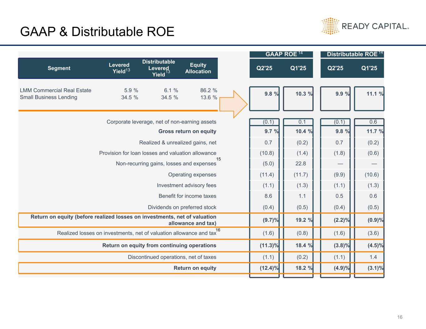 GAAP ROE Distributable ROE Segment Levered Yield Distributable Levered Yield Equity Allocation Q2'25 Q1'25 Q2'25 Q1'25 LMM Commercial Real Estate 5.9 % 6.1 % 86.2 % 9.8 % 10.3 % 9.9 % 11.1 %Small Business Lending 34.5 % 34.5 % 13.6 % Corporate leverage, net of non-earning assets (0.1) 0.1 (0.1) 0.6 Gross return on equity 9.7 % 10.4 % 9.8 % 11.7 % Realized & unrealized gains, net 0.7 (0.2) 0.7 (0.2) Provision for loan losses and valuation allowance (10.8) (1.4) (1.8) (0.6) Non-recurring gains, losses and expenses (5.0) 22.8 — — Operating expenses (11.4) (11.7) (9.9) (10.6) Investment advisory fees (1.1) (1.3) (1.1) (1.3) Benefit for income taxes 8.6 1.1 0.5 0.6 Dividends on preferred stock (0.4) (0.5) (0.4) (0.5) Return on equity (before realized losses on investments, net of valuation allowance and tax) (9.7) % 19.2 % (2.2) % (0.9) % Realized losses on investments, net of valuation allowance and tax (1.6) (0.8) (1.6) (3.6) Return on equity from continuing operations (11.3) % 18.4 % (3.8) % (4.5) % Discontinued operations, net of taxes (1.1) (0.2) (1.1) 1.4 Return on equity (12.4) % 18.2 % (4.9) % (3.1) % 16 GAAP & Distributable ROE 13 13 14 14 15 16