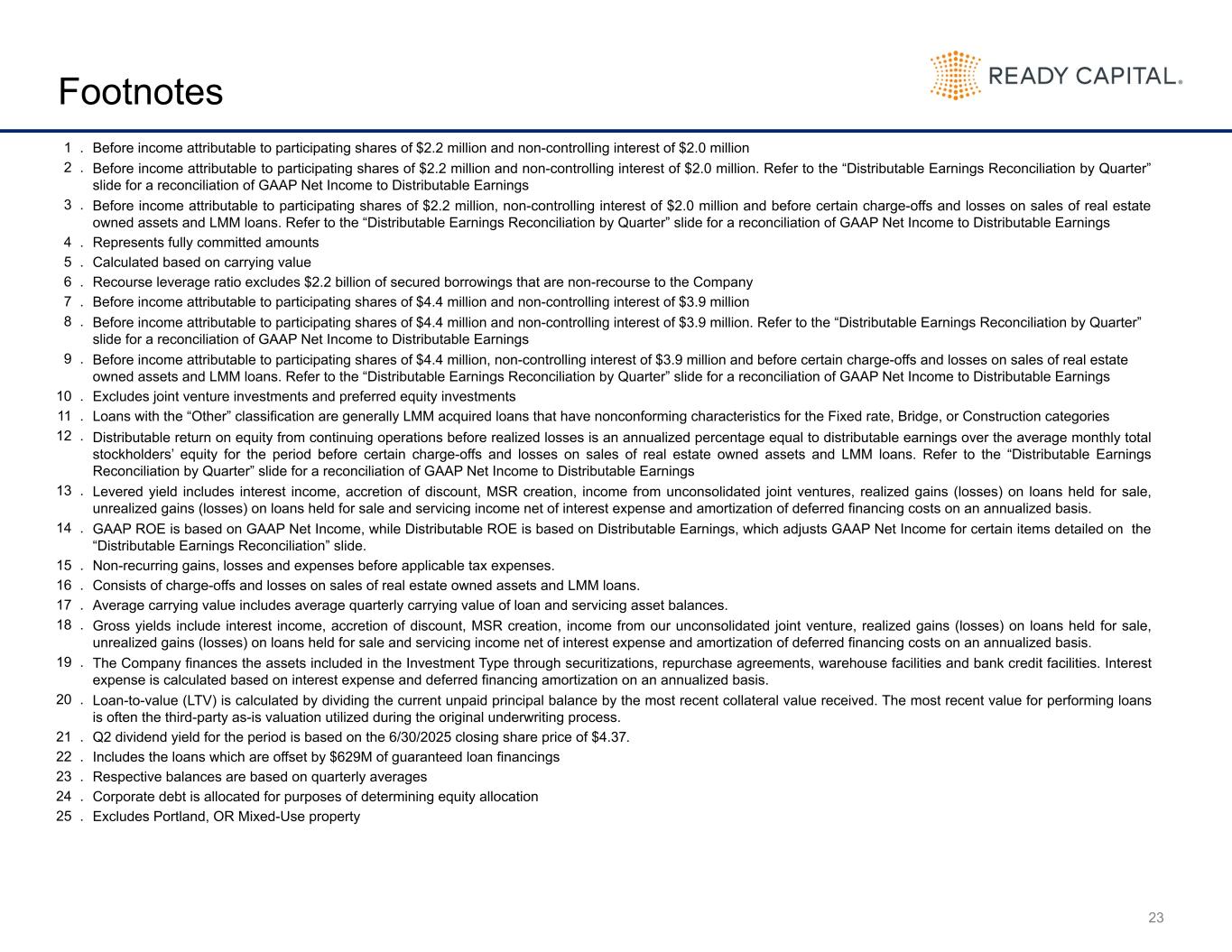 23 Footnotes 1 . Before income attributable to participating shares of $2.2 million and non-controlling interest of $2.0 million 2 . Before income attributable to participating shares of $2.2 million and non-controlling interest of $2.0 million. Refer to the “Distributable Earnings Reconciliation by Quarter” slide for a reconciliation of GAAP Net Income to Distributable Earnings 3 . Before income attributable to participating shares of $2.2 million, non-controlling interest of $2.0 million and before certain charge-offs and losses on sales of real estate owned assets and LMM loans. Refer to the “Distributable Earnings Reconciliation by Quarter” slide for a reconciliation of GAAP Net Income to Distributable Earnings 4 . Represents fully committed amounts 5 . Calculated based on carrying value 6 . Recourse leverage ratio excludes $2.2 billion of secured borrowings that are non-recourse to the Company 7 . Before income attributable to participating shares of $4.4 million and non-controlling interest of $3.9 million 8 . Before income attributable to participating shares of $4.4 million and non-controlling interest of $3.9 million. Refer to the “Distributable Earnings Reconciliation by Quarter” slide for a reconciliation of GAAP Net Income to Distributable Earnings 9 . Before income attributable to participating shares of $4.4 million, non-controlling interest of $3.9 million and before certain charge-offs and losses on sales of real estate owned assets and LMM loans. Refer to the “Distributable Earnings Reconciliation by Quarter” slide for a reconciliation of GAAP Net Income to Distributable Earnings 10 . Excludes joint venture investments and preferred equity investments 11 . Loans with the “Other” classification are generally LMM acquired loans that have nonconforming characteristics for the Fixed rate, Bridge, or Construction categories 12 . Distributable return on equity from continuing operations before realized losses is an annualized percentage equal to distributable earnings over the average monthly total stockholders’ equity for the period before certain charge-offs and losses on sales of real estate owned assets and LMM loans. Refer to the “Distributable Earnings Reconciliation by Quarter” slide for a reconciliation of GAAP Net Income to Distributable Earnings 13 . Levered yield includes interest income, accretion of discount, MSR creation, income from unconsolidated joint ventures, realized gains (losses) on loans held for sale, unrealized gains (losses) on loans held for sale and servicing income net of interest expense and amortization of deferred financing costs on an annualized basis. 14 . GAAP ROE is based on GAAP Net Income, while Distributable ROE is based on Distributable Earnings, which adjusts GAAP Net Income for certain items detailed on the “Distributable Earnings Reconciliation” slide. 15 . Non-recurring gains, losses and expenses before applicable tax expenses. 16 . Consists of charge-offs and losses on sales of real estate owned assets and LMM loans. 17 . Average carrying value includes average quarterly carrying value of loan and servicing asset balances. 18 . Gross yields include interest income, accretion of discount, MSR creation, income from our unconsolidated joint venture, realized gains (losses) on loans held for sale, unrealized gains (losses) on loans held for sale and servicing income net of interest expense and amortization of deferred financing costs on an annualized basis. 19 . The Company finances the assets included in the Investment Type through securitizations, repurchase agreements, warehouse facilities and bank credit facilities. Interest expense is calculated based on interest expense and deferred financing amortization on an annualized basis. 20 . Loan-to-value (LTV) is calculated by dividing the current unpaid principal balance by the most recent collateral value received. The most recent value for performing loans is often the third-party as-is valuation utilized during the original underwriting process. 21 . Q2 dividend yield for the period is based on the 6/30/2025 closing share price of $4.37. 22 . Includes the loans which are offset by $629M of guaranteed loan financings 23 . Respective balances are based on quarterly averages 24 . Corporate debt is allocated for purposes of determining equity allocation 25 . Excludes Portland, OR Mixed-Use property