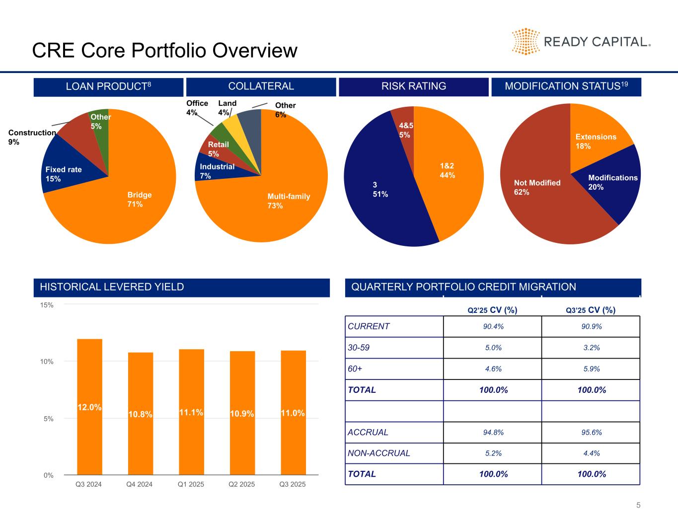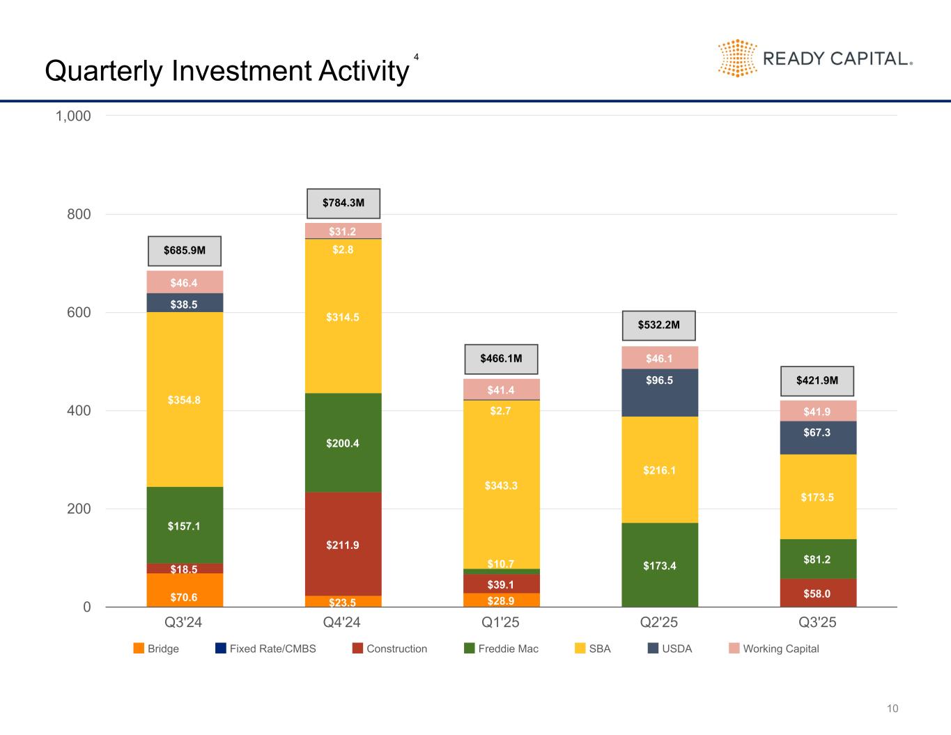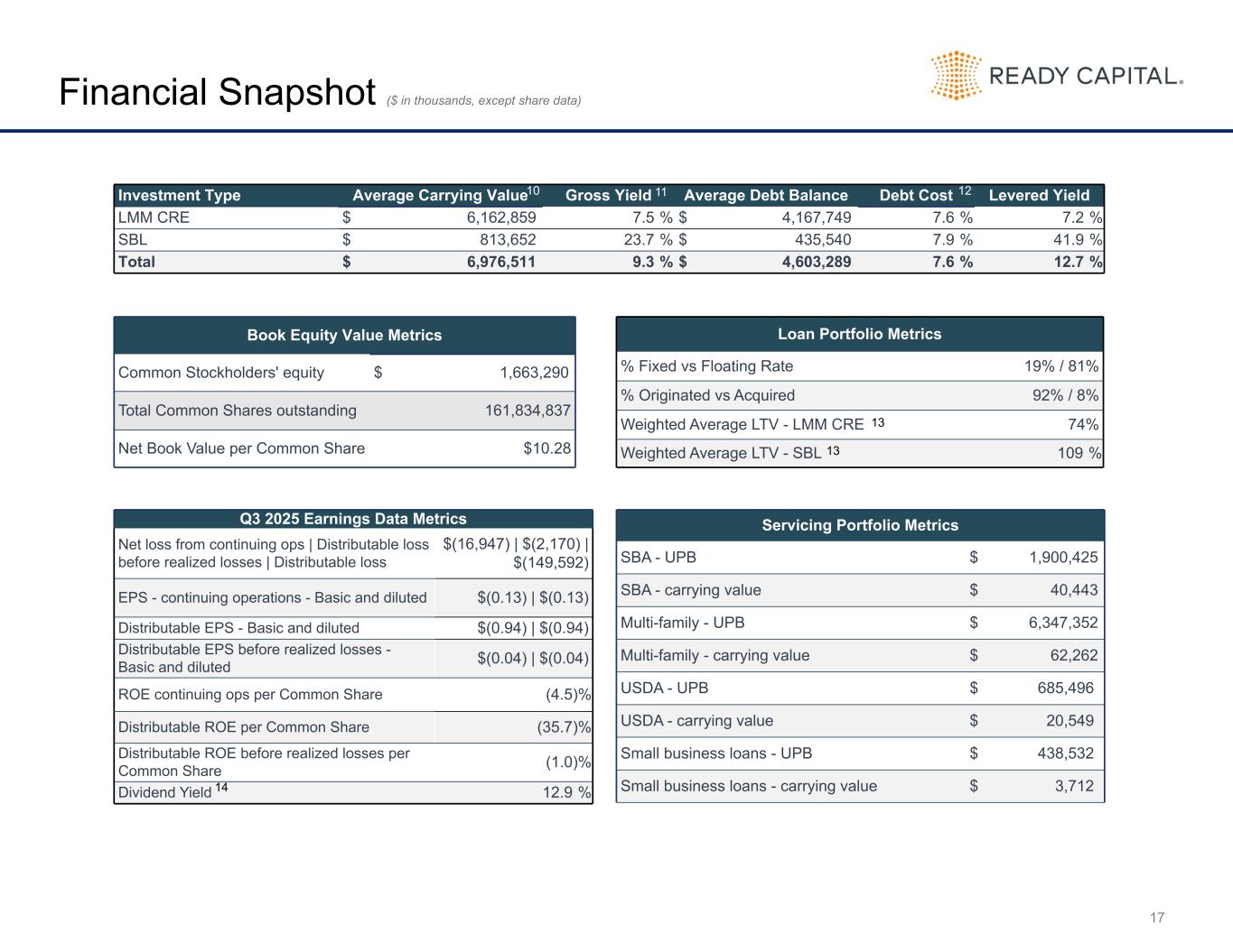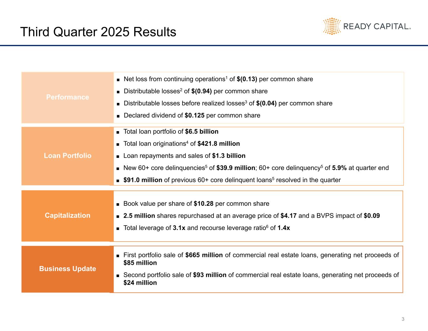 2 Disclaimer This presentation contains statements that constitute “forward-looking statements,” as such term is defined in Section 27A of the Securities Act of 1933, as amended, and Section 21E of the Securities Exchange Act of 1934, as amended, and such statements are intended to be covered by the safe harbor provided by the same. These statements are based on management’s current expectations and beliefs and are subject to a number of trends and uncertainties that could cause actual results to differ materially from those described in the forward-looking statements; Ready Capital Corporation (the “Company”) can give no assurance that its expectations will be attained. Factors that could cause actual results to differ materially from the Company’s expectations include those set forth in the Risk Factors section of the most recent Annual Report on Form 10-K filed with the SEC and other reports filed by the Company with the SEC, copies of which are available on the SEC’s website, www.sec.gov. The Company undertakes no obligation to update these statements for revisions or changes after the date of this release, except as required by law. This presentation includes certain non-GAAP financial measures, including Distributable earnings. These non-GAAP financial measures should be considered only as supplemental to, and not as superior to, financial measures in accordance with GAAP. Please refer to the Appendix for the most recent GAAP information. This presentation also contains market statistics and industry data which are subject to uncertainty and are not necessarily reflective of market conditions. These have been derived from third party sources and have not been independently verified by the Company or its affiliates. All material presented is compiled from sources believed to be reliable and current, but accuracy cannot be guaranteed. All data is as of September 30, 2025, unless otherwise noted.