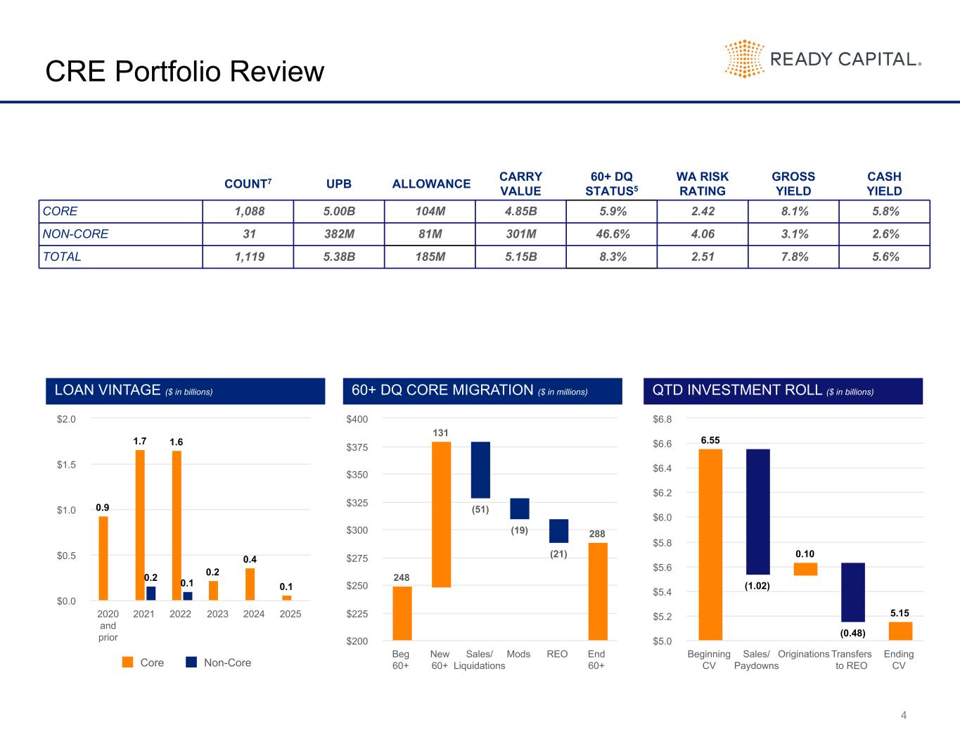 3 Third Quarter 2025 Results ■ Net loss from continuing operations1 of $(0.13) per common share ■ Distributable losses2 of $(0.94) per common share ■ Distributable losses before realized losses3 of $(0.04) per common share ■ Declared dividend of $0.125 per common share Performance ■ Total loan portfolio of $6.5 billion ■ Total loan originations4 of $421.8 million ■ Loan repayments and sales of $1.3 billion ■ New 60+ core delinquencies5 of $39.9 million; 60+ core delinquency5 of 5.9% at quarter end ■ $91.0 million of previous 60+ core delinquent loans5 resolved in the quarter Loan Portfolio Capitalization ■ Book value per share of $10.28 per common share ■ 2.5 million shares repurchased at an average price of $4.17 and a BVPS impact of $0.09 ■ Total leverage of 3.1x and recourse leverage ratio6 of 1.4x Business Update ■ First portfolio sale of $665 million of commercial real estate loans, generating net proceeds of $85 million ■ Second portfolio sale of $93 million of commercial real estate loans, generating net proceeds of $24 million