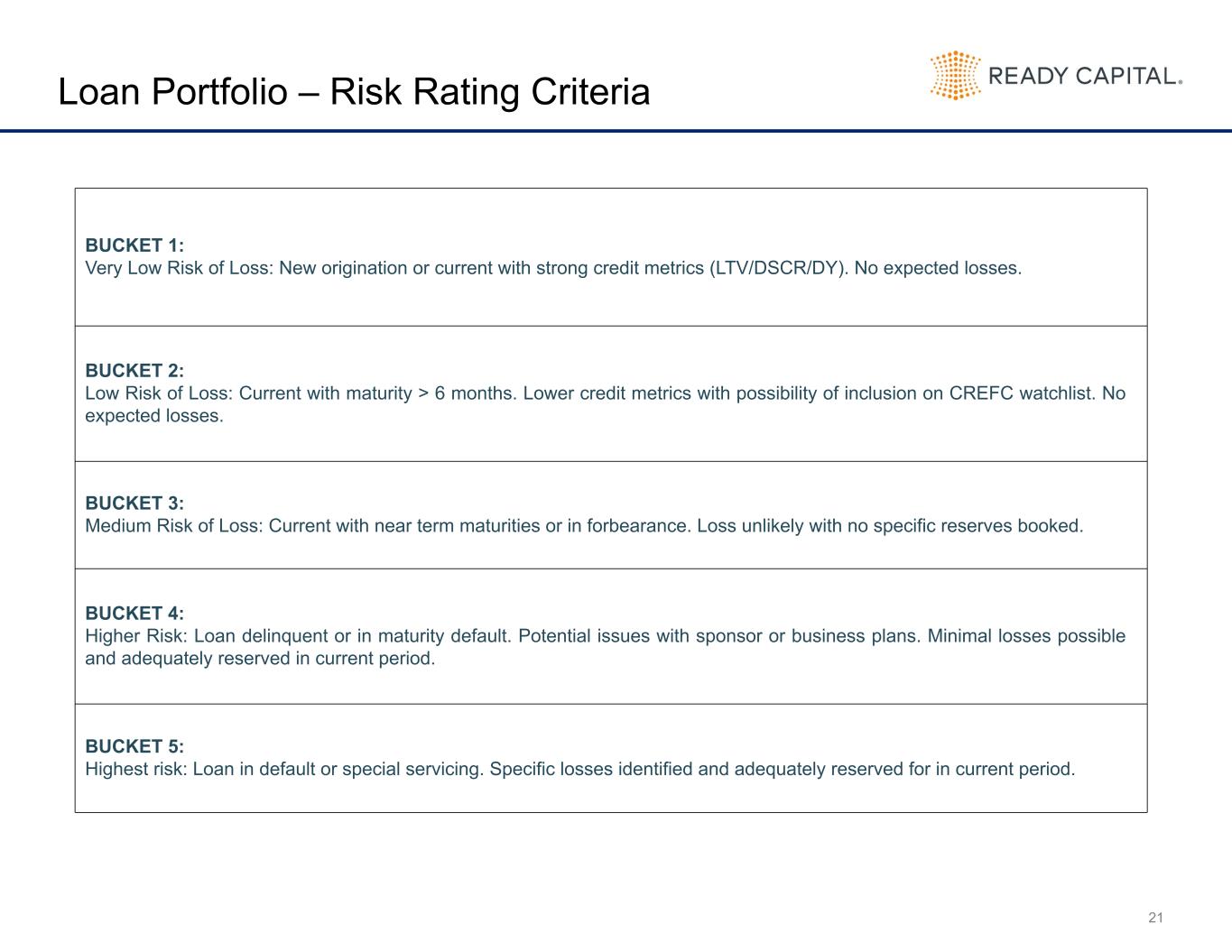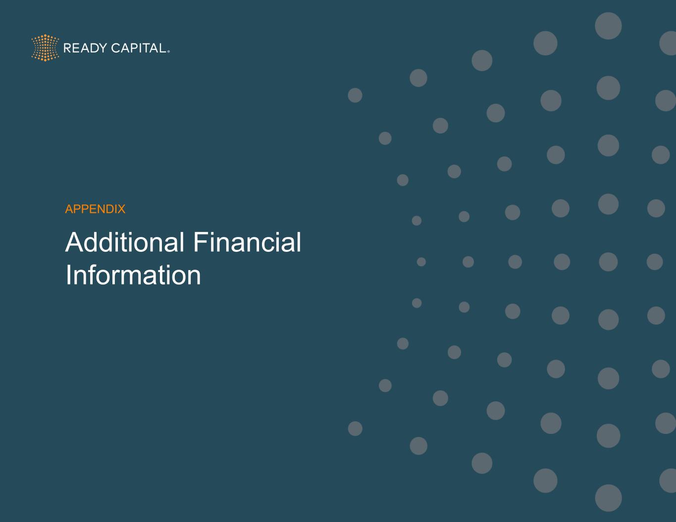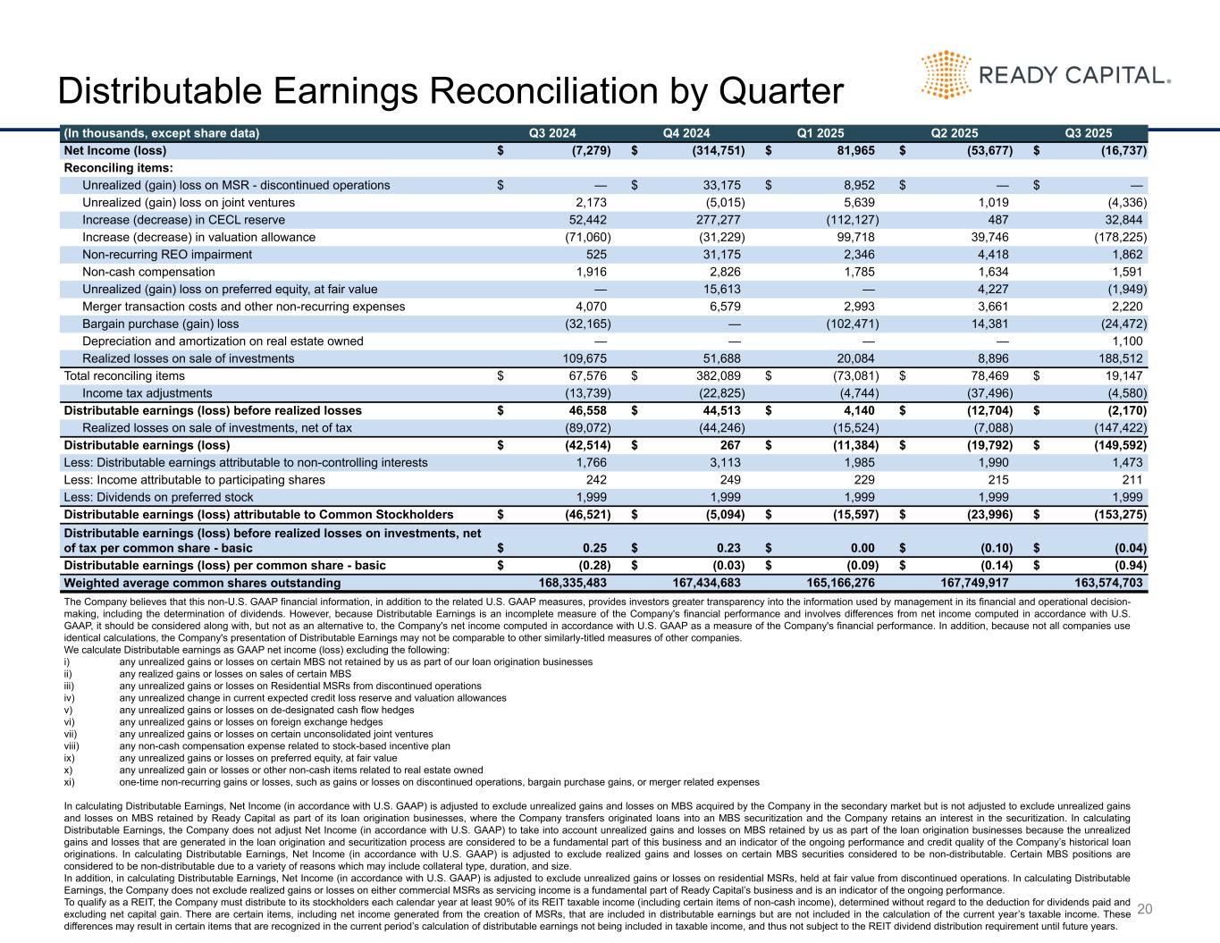 20 Distributable Earnings Reconciliation by Quarter The Company believes that this non-U.S. GAAP financial information, in addition to the related U.S. GAAP measures, provides investors greater transparency into the information used by management in its financial and operational decision- making, including the determination of dividends. However, because Distributable Earnings is an incomplete measure of the Company's financial performance and involves differences from net income computed in accordance with U.S. GAAP, it should be considered along with, but not as an alternative to, the Company's net income computed in accordance with U.S. GAAP as a measure of the Company's financial performance. In addition, because not all companies use identical calculations, the Company's presentation of Distributable Earnings may not be comparable to other similarly-titled measures of other companies. We calculate Distributable earnings as GAAP net income (loss) excluding the following: i) any unrealized gains or losses on certain MBS not retained by us as part of our loan origination businesses ii) any realized gains or losses on sales of certain MBS iii) any unrealized gains or losses on Residential MSRs from discontinued operations iv) any unrealized change in current expected credit loss reserve and valuation allowances v) any unrealized gains or losses on de-designated cash flow hedges vi) any unrealized gains or losses on foreign exchange hedges vii) any unrealized gains or losses on certain unconsolidated joint ventures viii) any non-cash compensation expense related to stock-based incentive plan ix) any unrealized gains or losses on preferred equity, at fair value x) any unrealized gain or losses or other non-cash items related to real estate owned xi) one-time non-recurring gains or losses, such as gains or losses on discontinued operations, bargain purchase gains, or merger related expenses In calculating Distributable Earnings, Net Income (in accordance with U.S. GAAP) is adjusted to exclude unrealized gains and losses on MBS acquired by the Company in the secondary market but is not adjusted to exclude unrealized gains and losses on MBS retained by Ready Capital as part of its loan origination businesses, where the Company transfers originated loans into an MBS securitization and the Company retains an interest in the securitization. In calculating Distributable Earnings, the Company does not adjust Net Income (in accordance with U.S. GAAP) to take into account unrealized gains and losses on MBS retained by us as part of the loan origination businesses because the unrealized gains and losses that are generated in the loan origination and securitization process are considered to be a fundamental part of this business and an indicator of the ongoing performance and credit quality of the Company’s historical loan originations. In calculating Distributable Earnings, Net Income (in accordance with U.S. GAAP) is adjusted to exclude realized gains and losses on certain MBS securities considered to be non-distributable. Certain MBS positions are considered to be non-distributable due to a variety of reasons which may include collateral type, duration, and size. In addition, in calculating Distributable Earnings, Net Income (in accordance with U.S. GAAP) is adjusted to exclude unrealized gains or losses on residential MSRs, held at fair value from discontinued operations. In calculating Distributable Earnings, the Company does not exclude realized gains or losses on either commercial MSRs as servicing income is a fundamental part of Ready Capital’s business and is an indicator of the ongoing performance. To qualify as a REIT, the Company must distribute to its stockholders each calendar year at least 90% of its REIT taxable income (including certain items of non-cash income), determined without regard to the deduction for dividends paid and excluding net capital gain. There are certain items, including net income generated from the creation of MSRs, that are included in distributable earnings but are not included in the calculation of the current year’s taxable income. These differences may result in certain items that are recognized in the current period’s calculation of distributable earnings not being included in taxable income, and thus not subject to the REIT dividend distribution requirement until future years. (In thousands, except share data) Q3 2024 Q4 2024 Q1 2025 Q2 2025 Q3 2025 Net Income (loss) $ (7,279) $ (314,751) $ 81,965 $ (53,677) $ (16,737) Reconciling items: Unrealized (gain) loss on MSR - discontinued operations $ — $ 33,175 $ 8,952 $ — $ — Unrealized (gain) loss on joint ventures 2,173 (5,015) 5,639 1,019 (4,336) Increase (decrease) in CECL reserve 52,442 277,277 (112,127) 487 32,844 Increase (decrease) in valuation allowance (71,060) (31,229) 99,718 39,746 (178,225) Non-recurring REO impairment 525 31,175 2,346 4,418 1,862 Non-cash compensation 1,916 2,826 1,785 1,634 1,591 Unrealized (gain) loss on preferred equity, at fair value — 15,613 — 4,227 (1,949) Merger transaction costs and other non-recurring expenses 4,070 6,579 2,993 3,661 2,220 Bargain purchase (gain) loss (32,165) — (102,471) 14,381 (24,472) Depreciation and amortization on real estate owned — — — — 1,100 Realized losses on sale of investments 109,675 51,688 20,084 8,896 188,512 Total reconciling items $ 67,576 $ 382,089 $ (73,081) $ 78,469 $ 19,147 Income tax adjustments (13,739) (22,825) (4,744) (37,496) (4,580) Distributable earnings (loss) before realized losses $ 46,558 $ 44,513 $ 4,140 $ (12,704) $ (2,170) Realized losses on sale of investments, net of tax (89,072) (44,246) (15,524) (7,088) (147,422) Distributable earnings (loss) $ (42,514) $ 267 $ (11,384) $ (19,792) $ (149,592) Less: Distributable earnings attributable to non-controlling interests 1,766 3,113 1,985 1,990 1,473 Less: Income attributable to participating shares 242 249 229 215 211 Less: Dividends on preferred